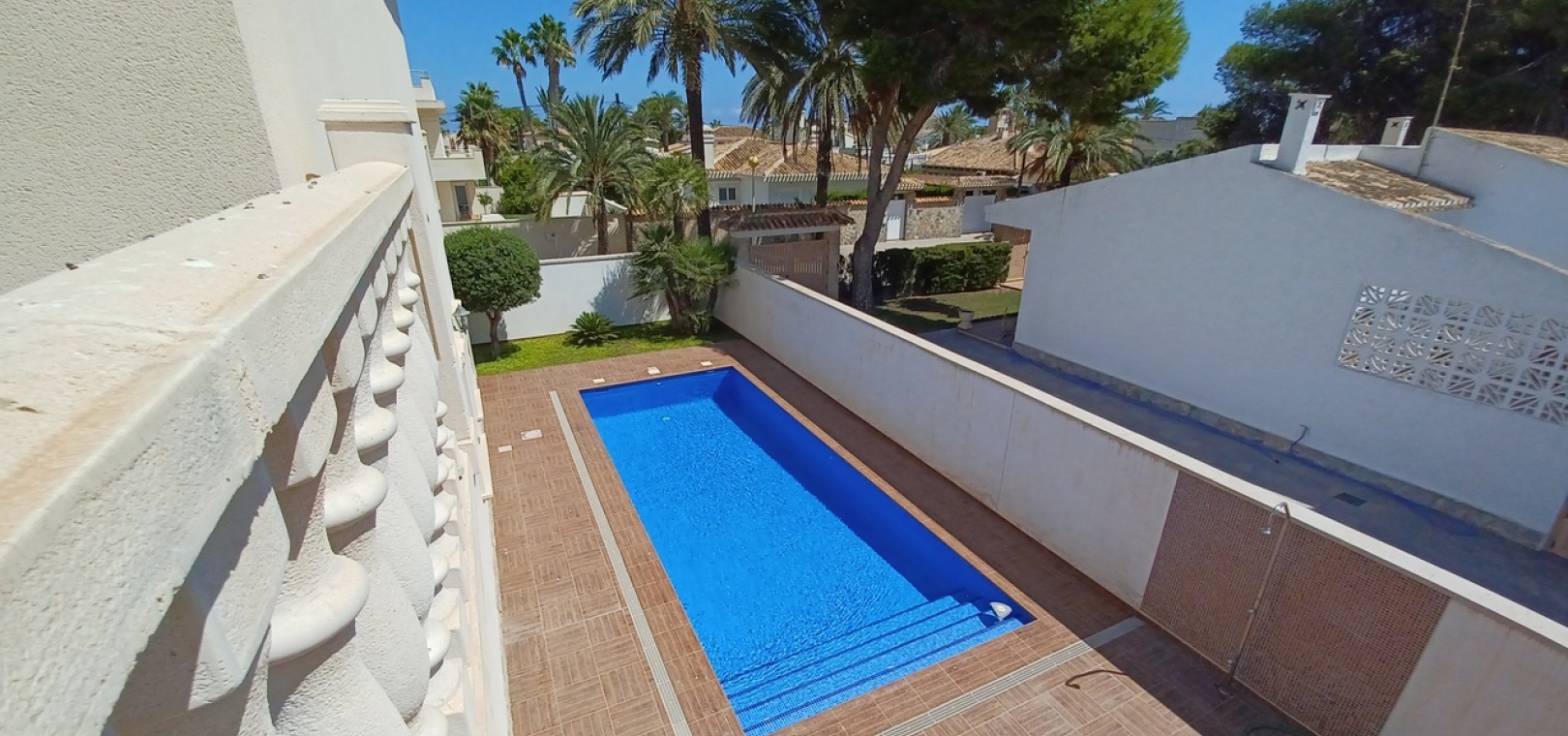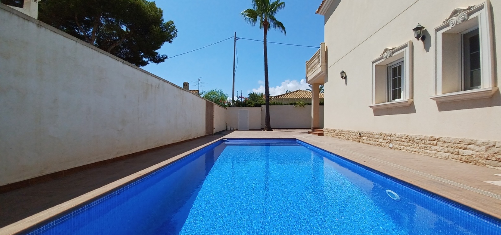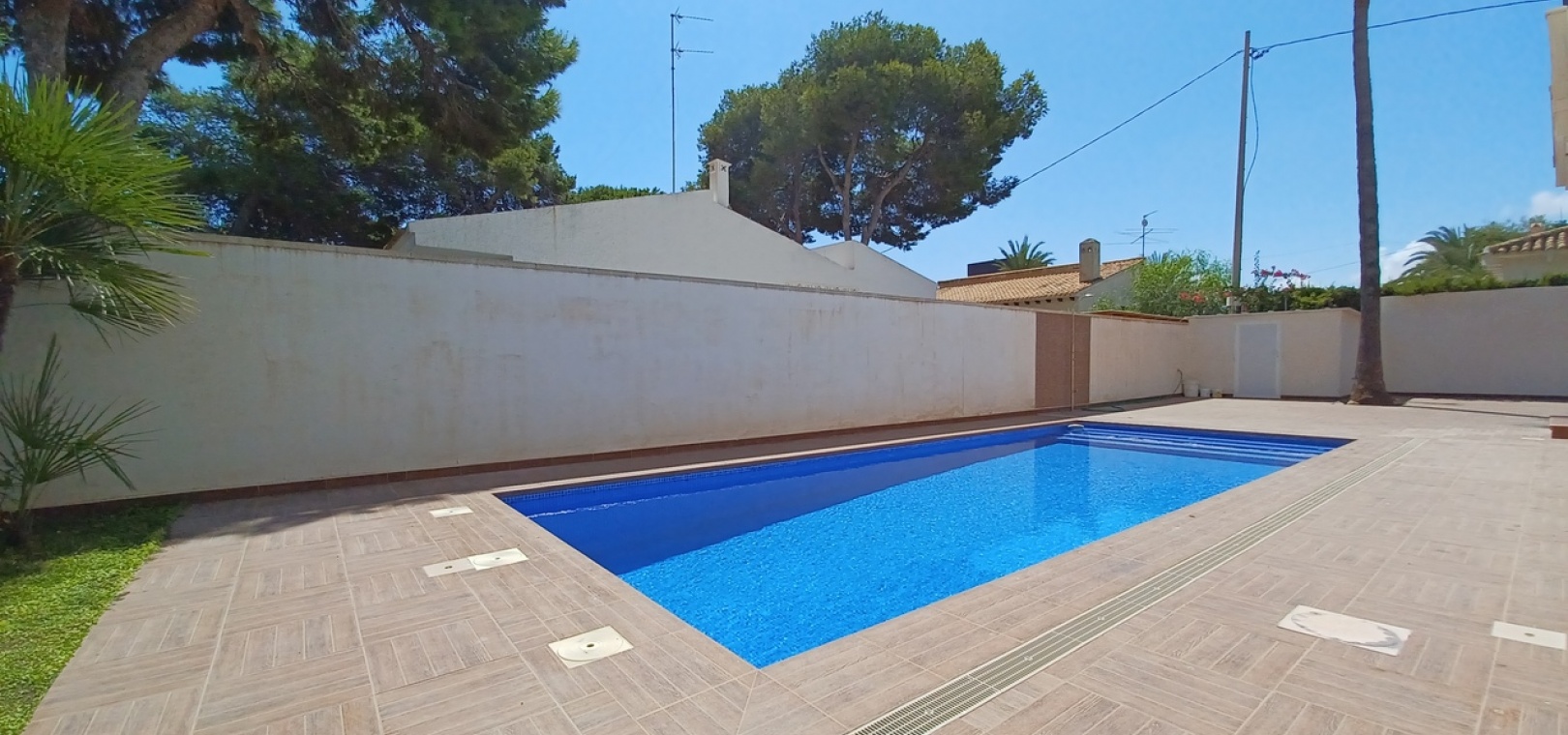 The property is fully private, with high walls, new non-slip floor tiles, and an 8×6 infinity pool. There is ample off-road parking for three cars, a shower, a brick-built storage room, and plenty of space for an outdoor entertaining area.
