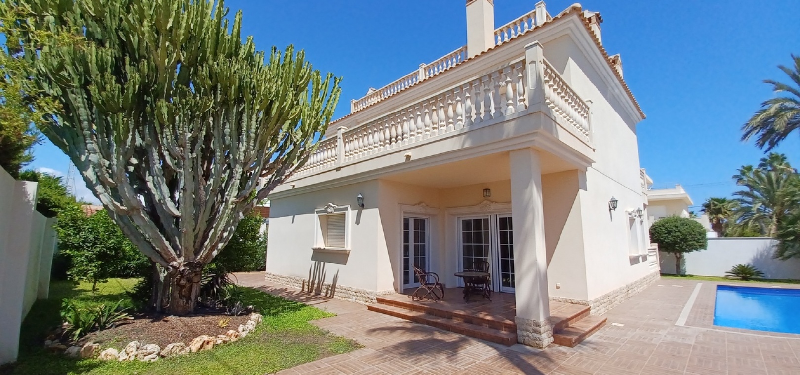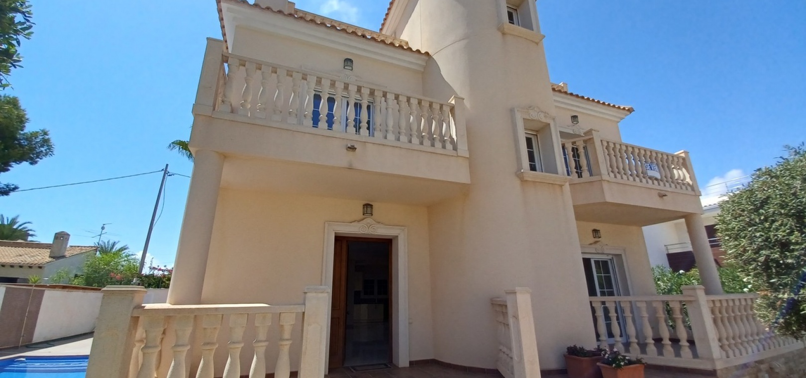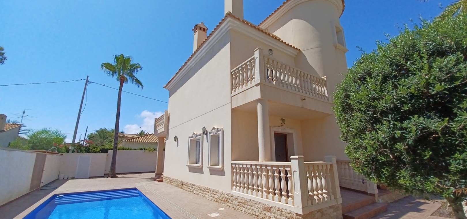 The property is fully private, with high walls, new non-slip floor tiles, and an 8×6 infinity pool. There is ample off-road parking for three cars, a shower, a brick-built storage room, and plenty of space for an outdoor entertaining area.