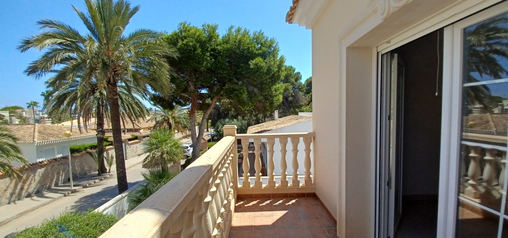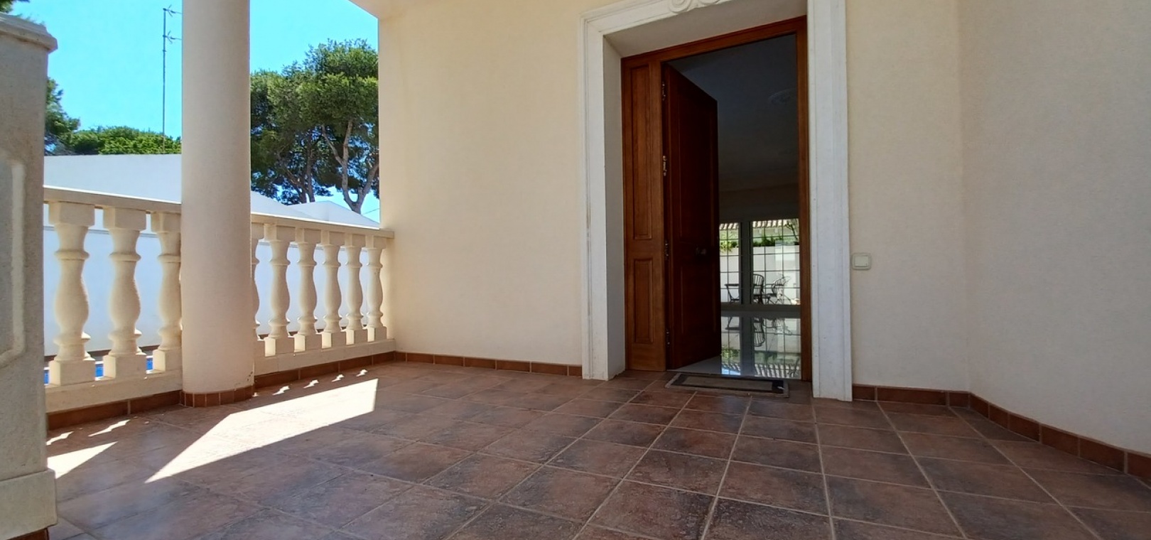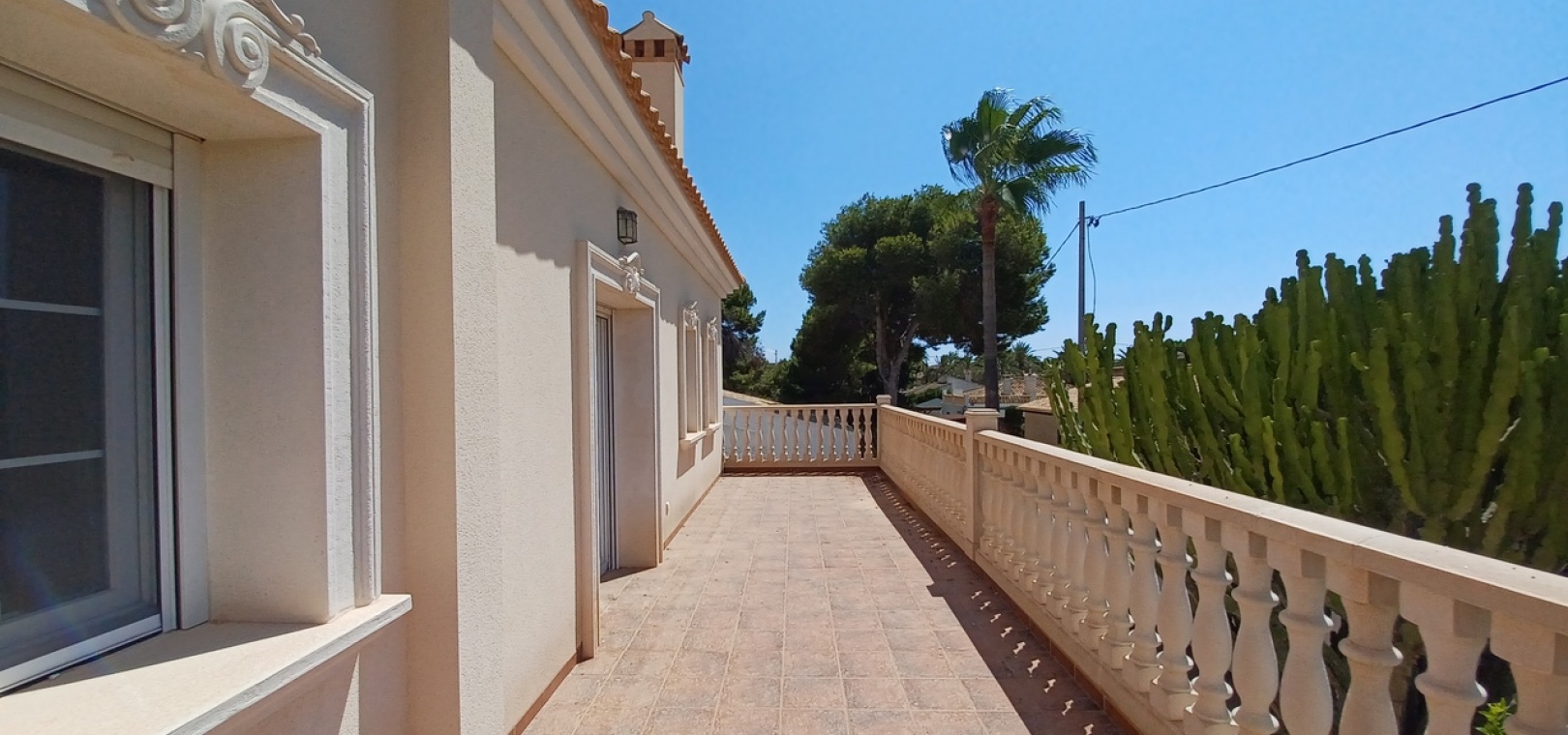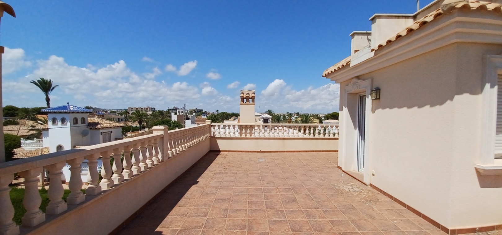 Stone balustrade, tiled flooring, private sun terrace with sea views, ideal for sunbathing and relaxing.