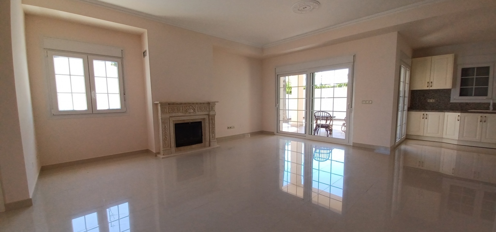 Lounge (6.51 x 5.81 m²): Spacious with a wood-burning fireplace, marble surround, and patio doors opening onto the outdoor dining area. Cloakroom with low flush toilet and sink.