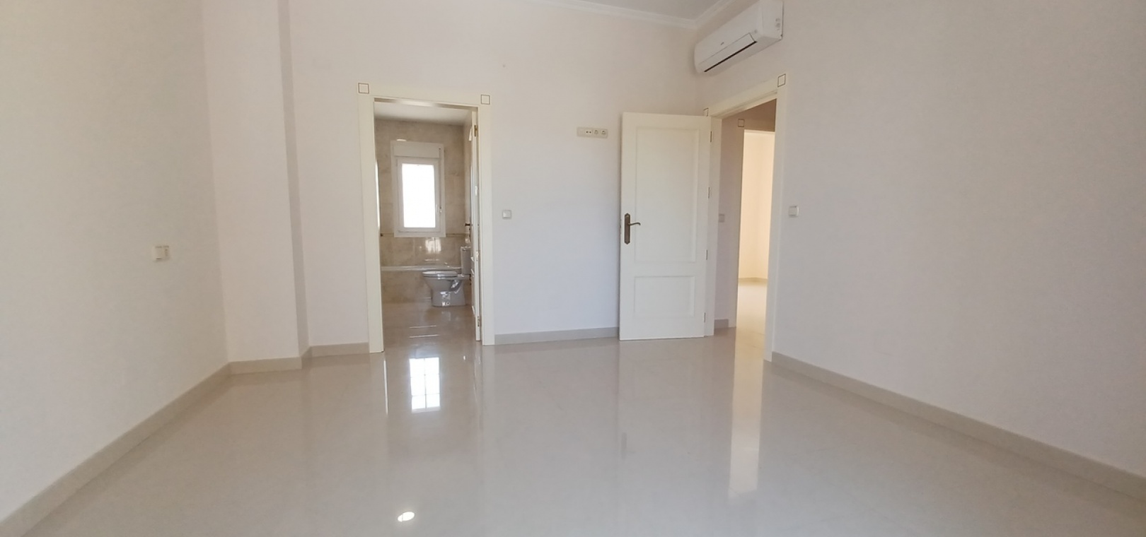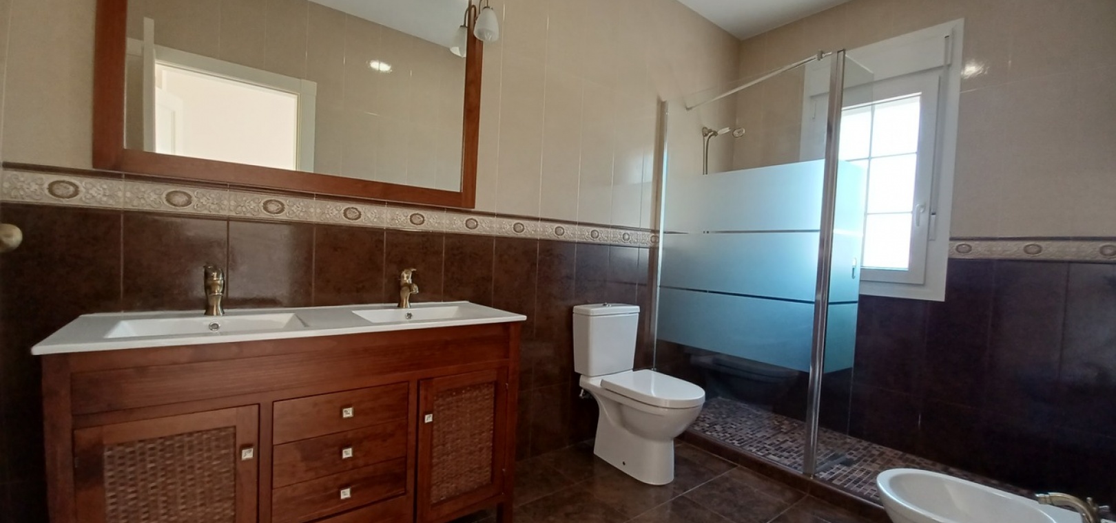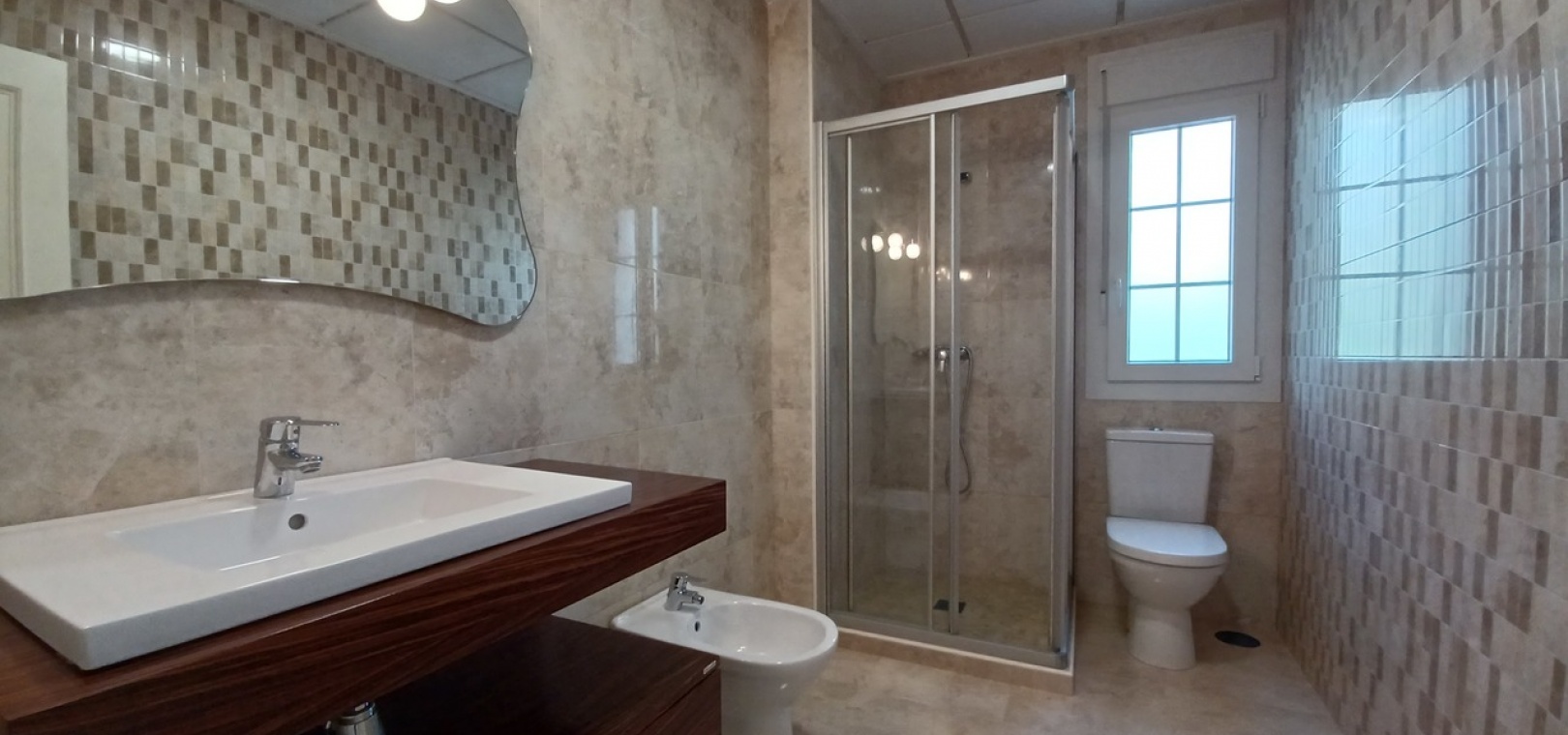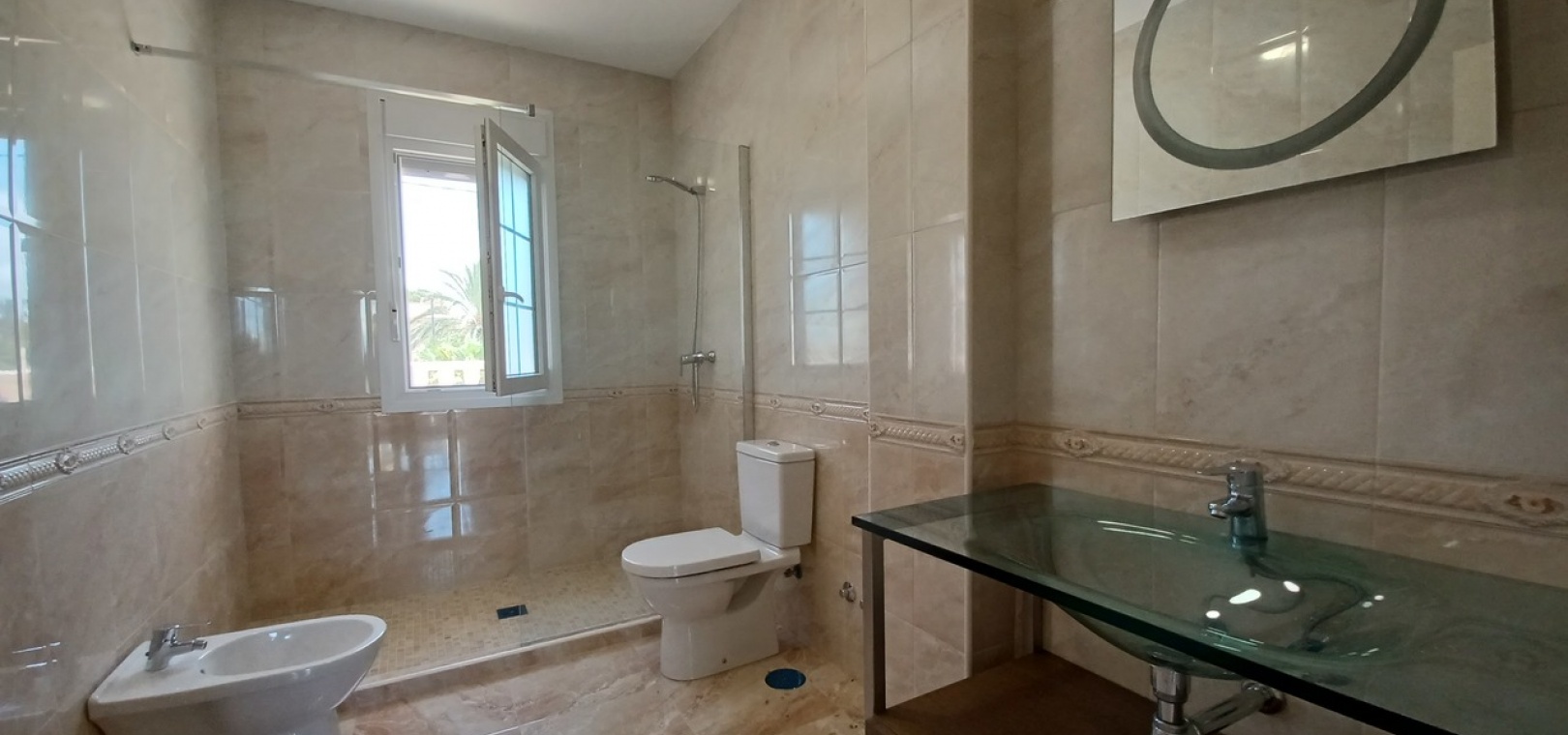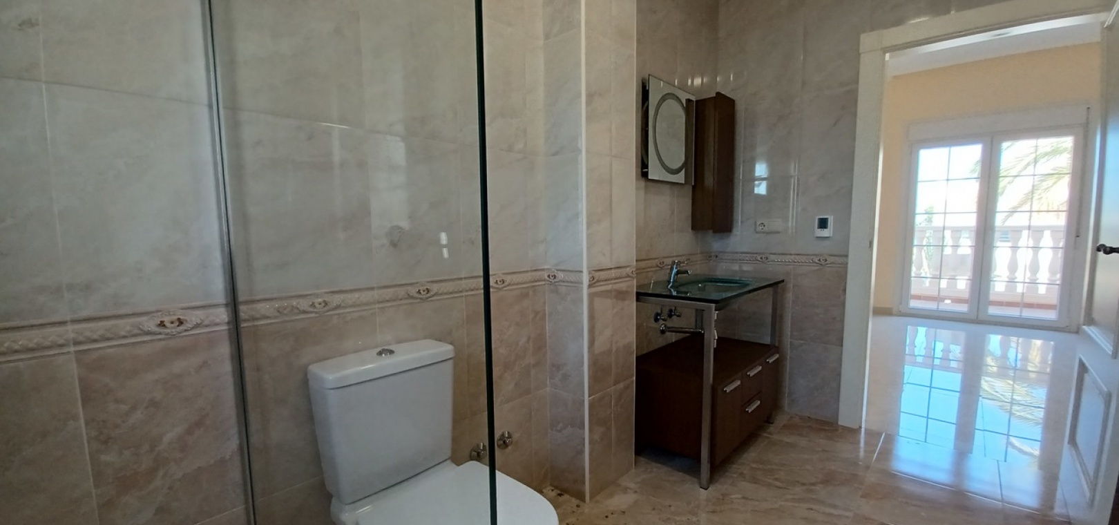 Bedroom Three (3.24 x 3.92 m²) with en-suite (3.65 x 1.87 m²): Private balcony, air-conditioned, walk-in shower, low flush toilet, bidet, glass sink.