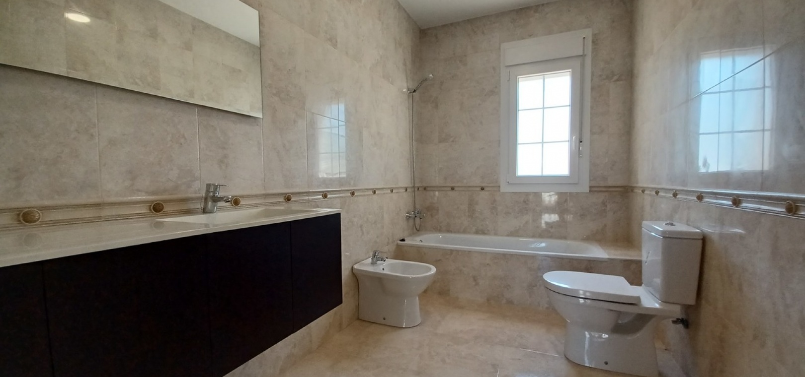 Bathroom (3.65 x 1.77 m²): Underfloor heating, shower cubicle, sink, low flush toilet, bidet, tastefully tiled in cream.