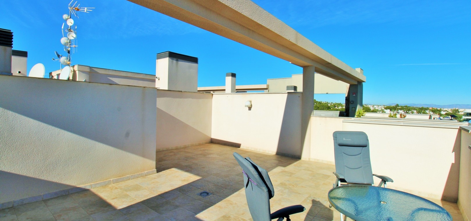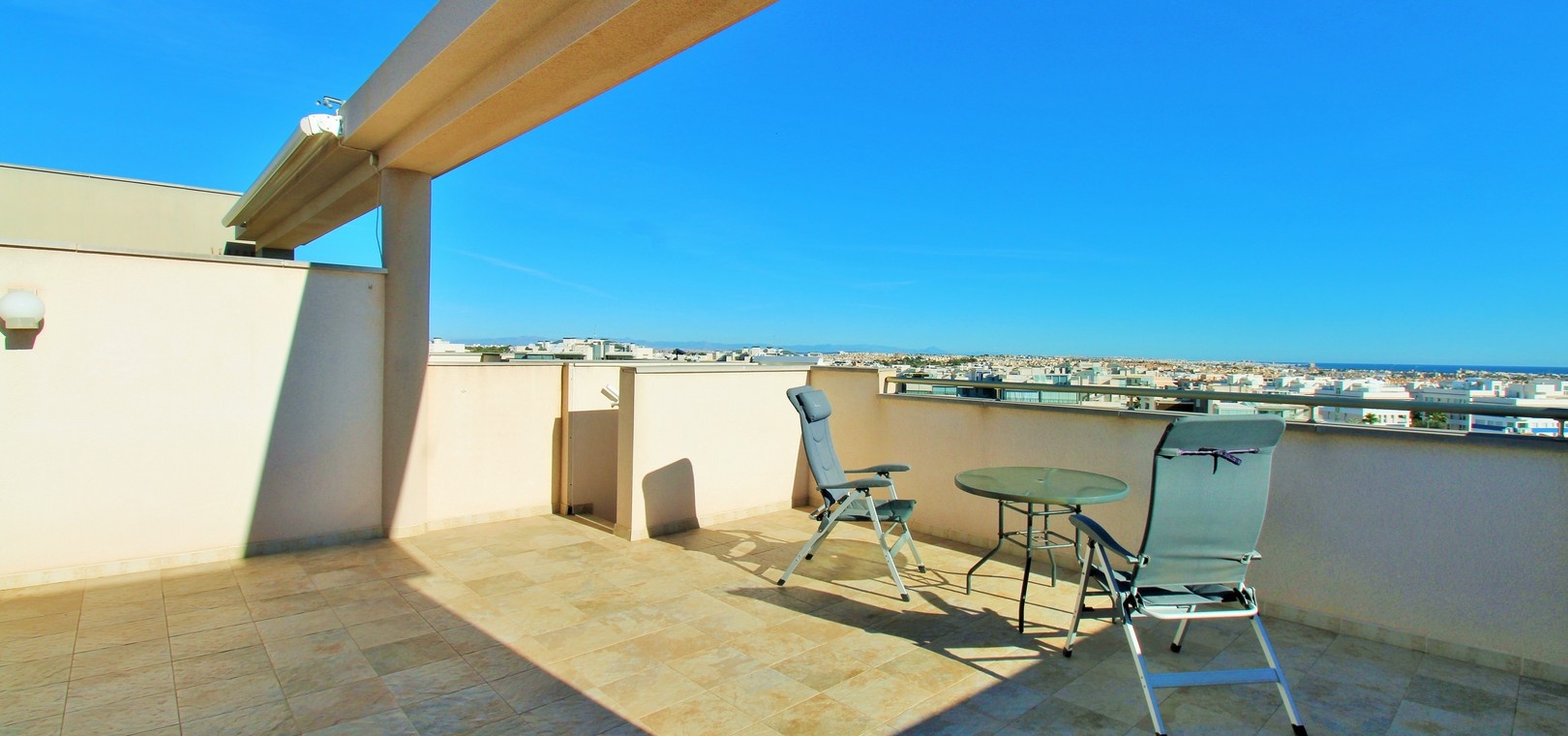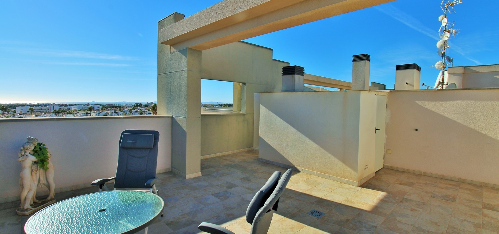 From the balcony, an external staircase leads to the spectacular private solarium. Here you can enjoy panoramic views towards the sea, Mar Menor, La Manga and the coastline. The solarium also includes a practical storage room ideal for outdoor furniture or personal belongings.