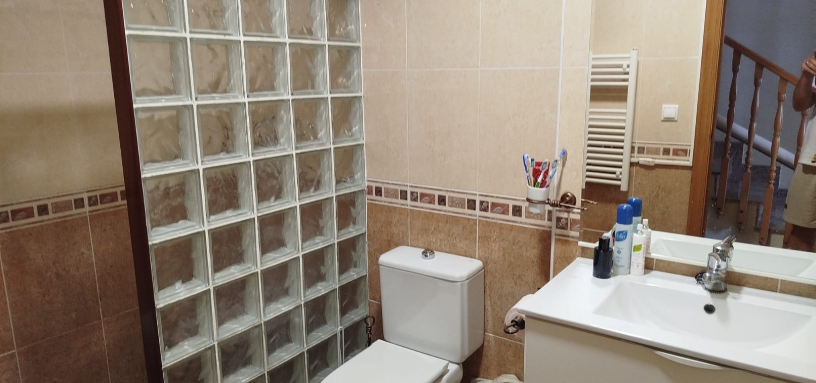 Upstairs, the first floor offers two additional bedrooms, both with fitted wardrobes. The master bedroom features air conditioning, a ceiling fan, and double doors leading to a glazed terrace, ideal as a cozy reading nook or relaxation area. The second bedroom also benefits from a ceiling fan and fitted wardrobes. A full family bathroom serves this level.