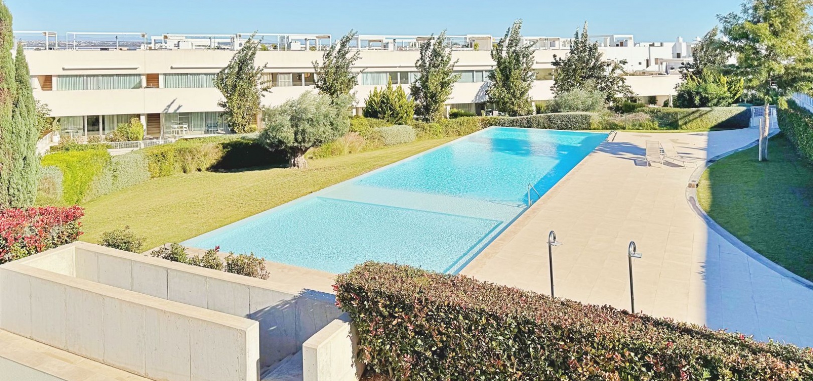 The interior features a modern open-plan kitchen and a bright living area seamlessly connected to a generous terrace overlooking the infinity-style swimming pool and landscaped gardens. Floor-to-ceiling windows enhance natural light and create a smooth transition between indoor and outdoor spaces.