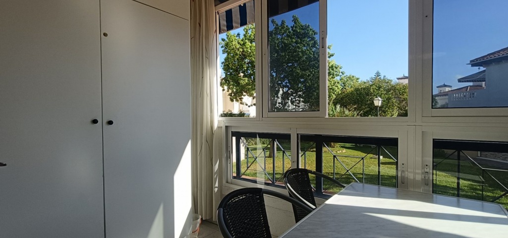 The home features a fully equipped kitchen, a separate bathroom, and a cozy living/sleeping area. It also includes a spacious enclosed terrace with windows that can be opened, storage space, and pleasant garden views.