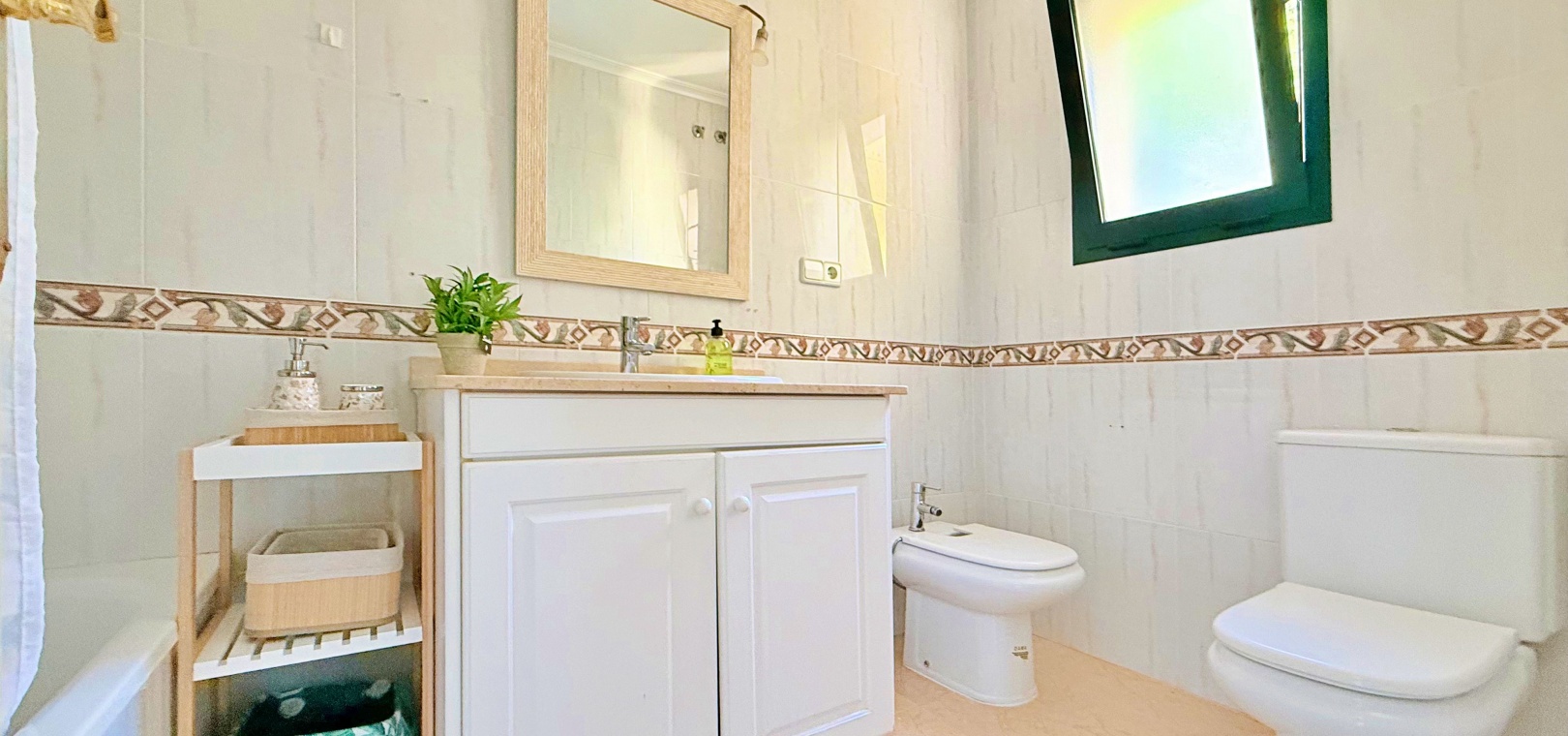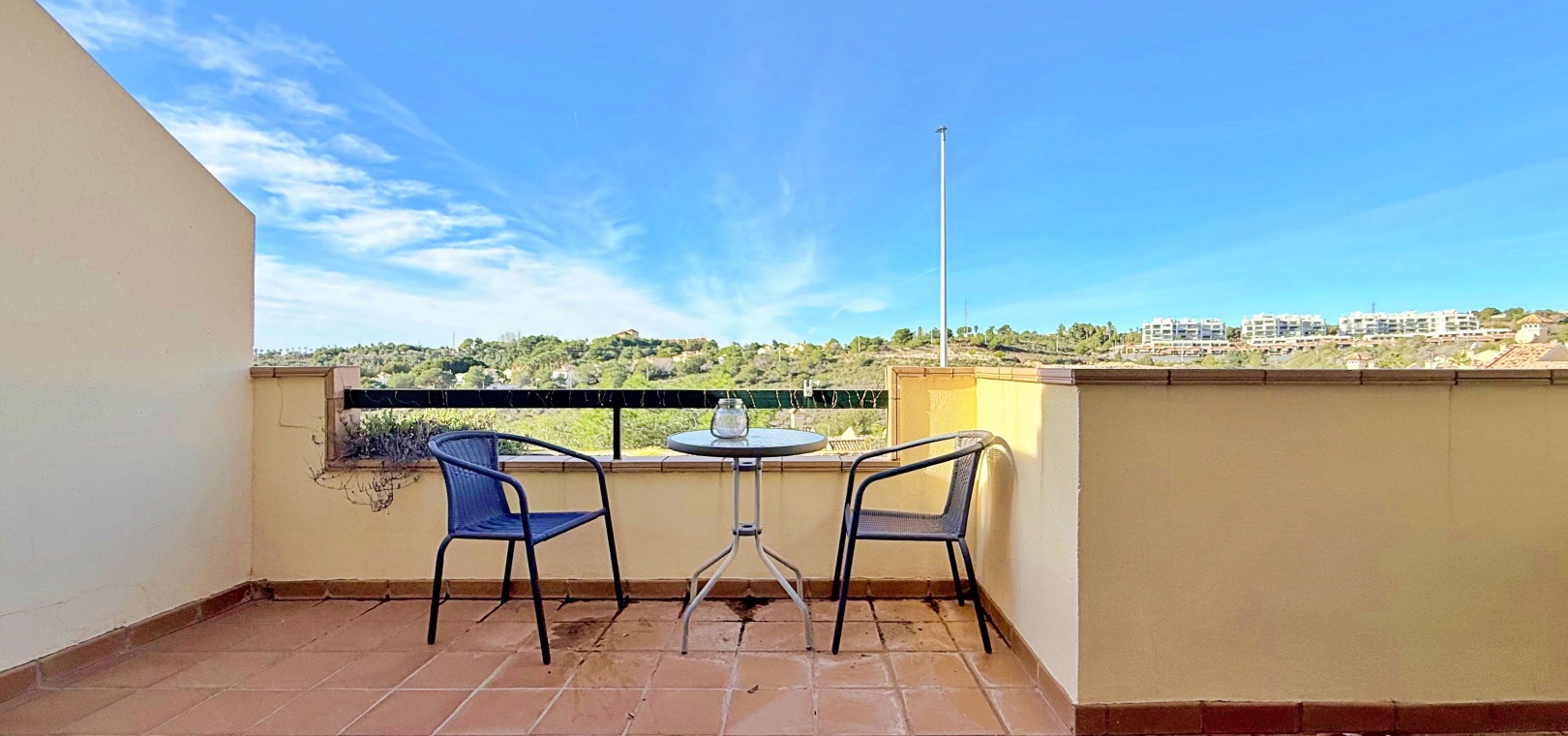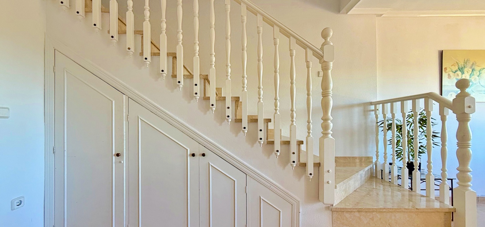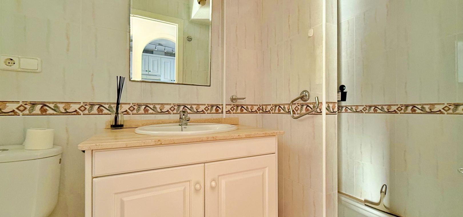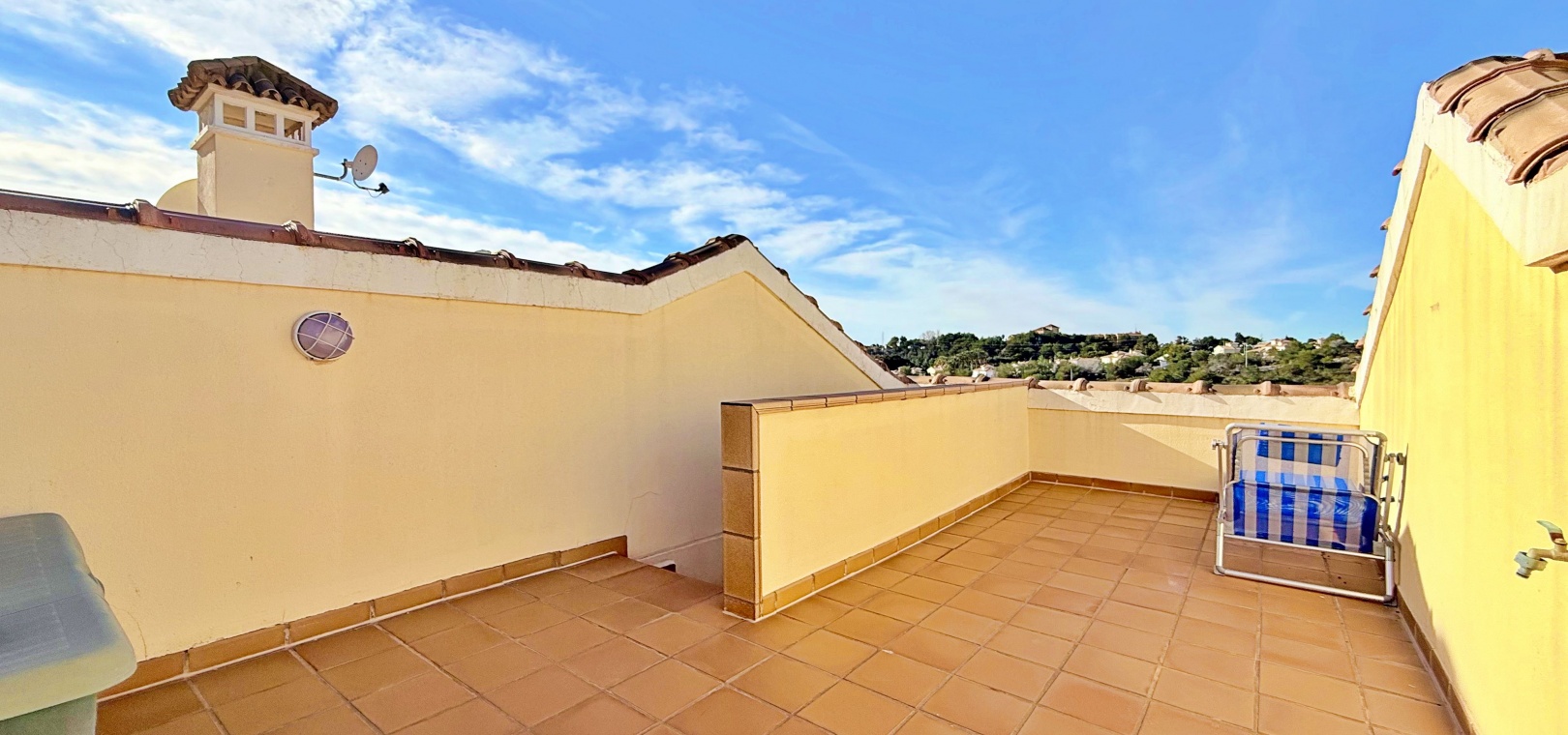 The home is in good condition and designed to maximise outdoor living. A 25 m² front garden provides a welcoming entrance and space for outdoor dining or relaxation. To the rear, a 15 m² covered porch offers a more private setting, while the 33 m² rooftop solarium enjoys unobstructed, direct views over the Campoamor golf course, making it ideal for sunbathing, entertaining, or enjoying the surrounding scenery.