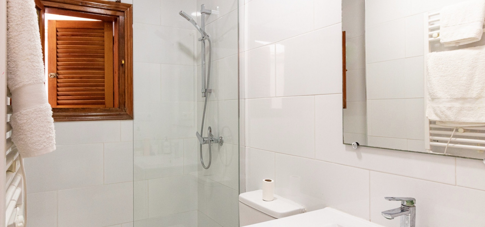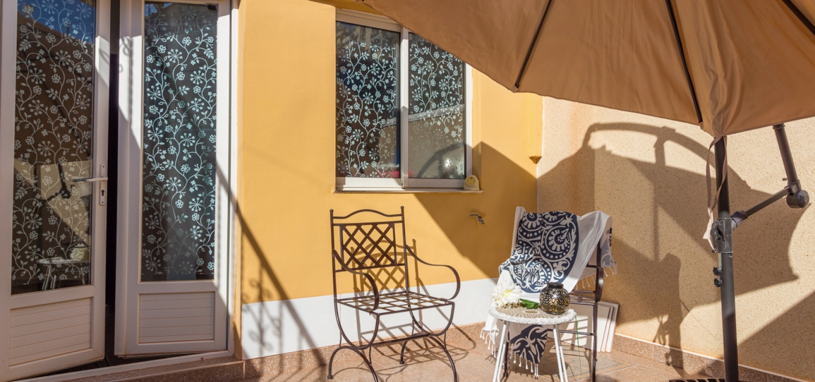 The property features an open-plan living and dining area with a modern kitchen complete with breakfast bar. The double bedroom includes fitted wardrobes and direct access to a rear covered terrace, which houses a second shower—perfect for rinsing off after the beach—and a sofa bed. The main bathroom has been modernised with a stylish shower.