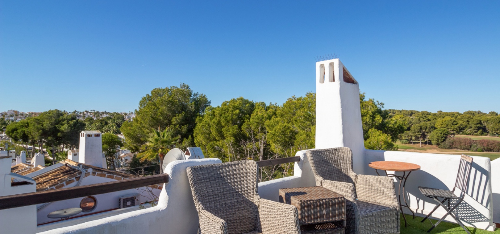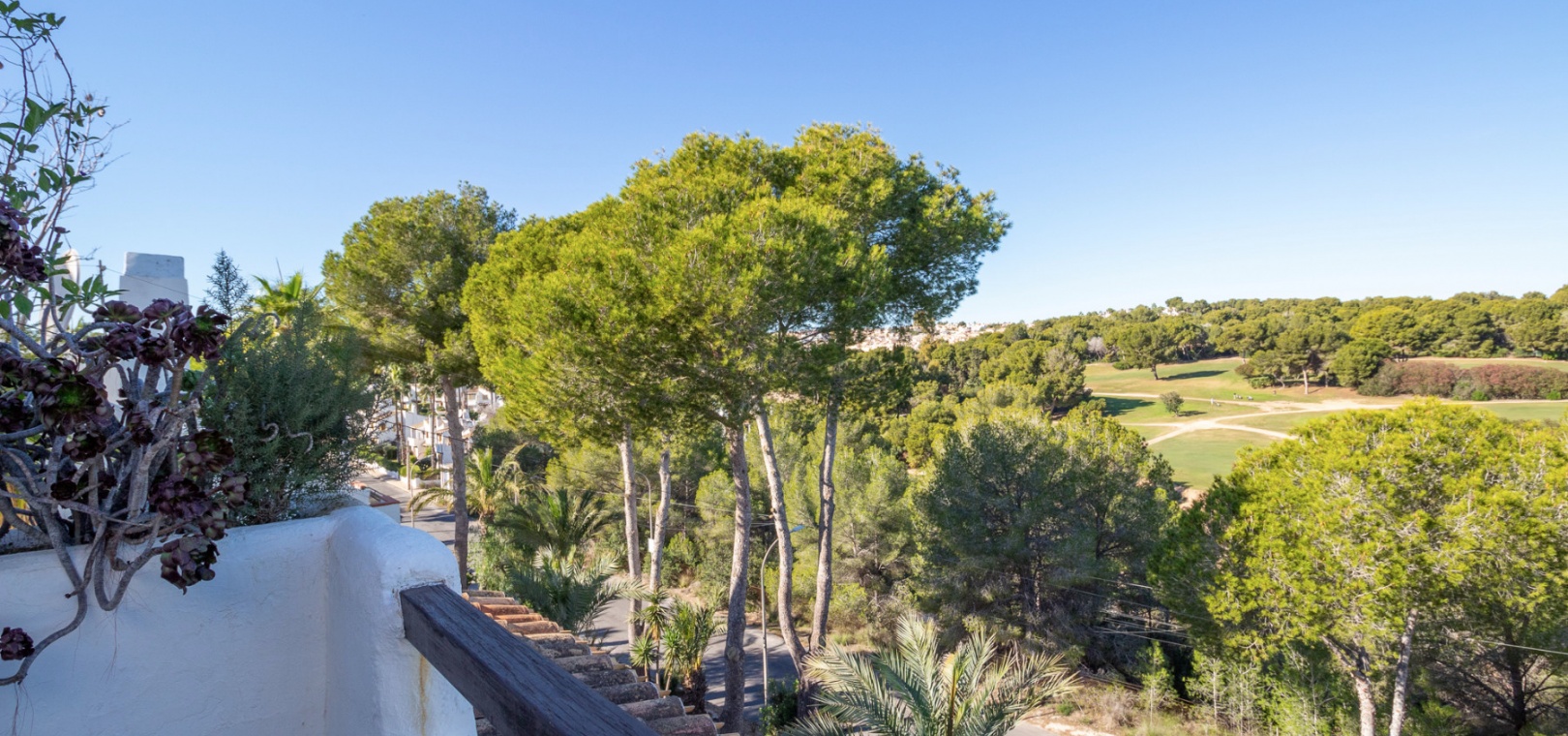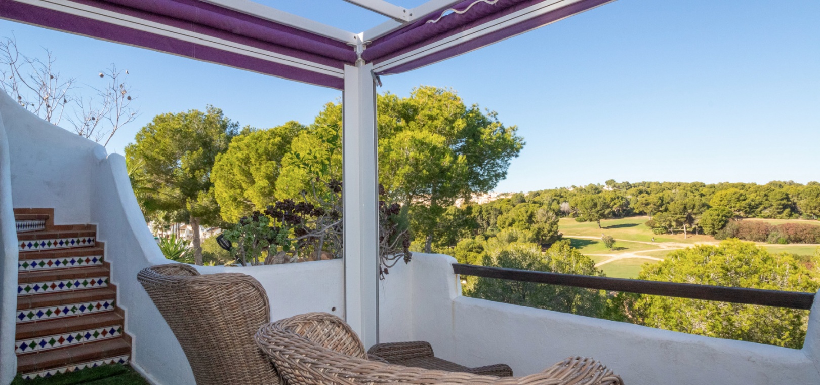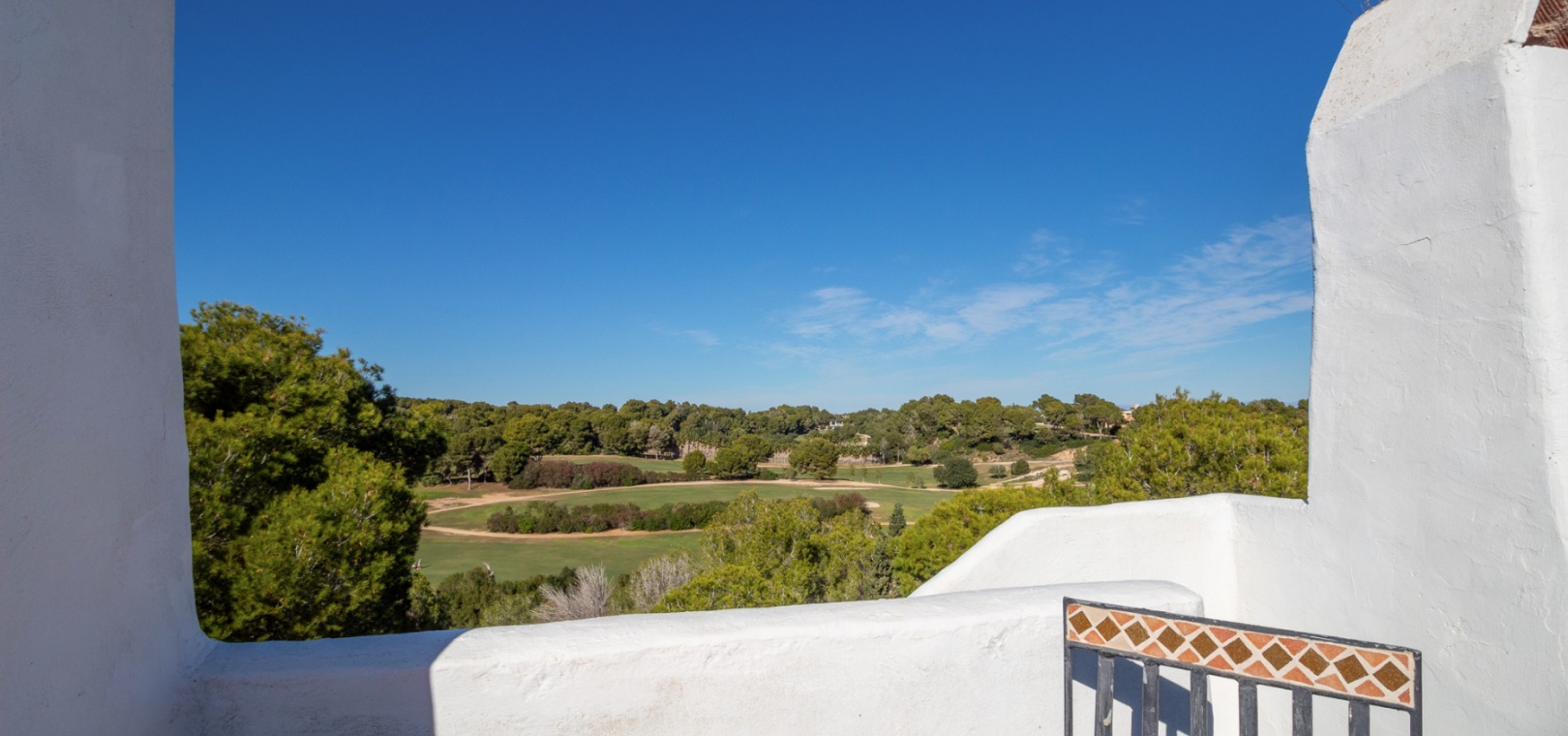Upstairs, the main living area is flooded with natural light and offers stunning views over the surroundings. The first floor comprises a bright living and dining area, an American-style kitchen with a breakfast bar, and a guest WC. From here, you can access both the balcony and the private solarium, perfect for enjoying the sun or entertaining with panoramic vistas over the Villamartin golf course.