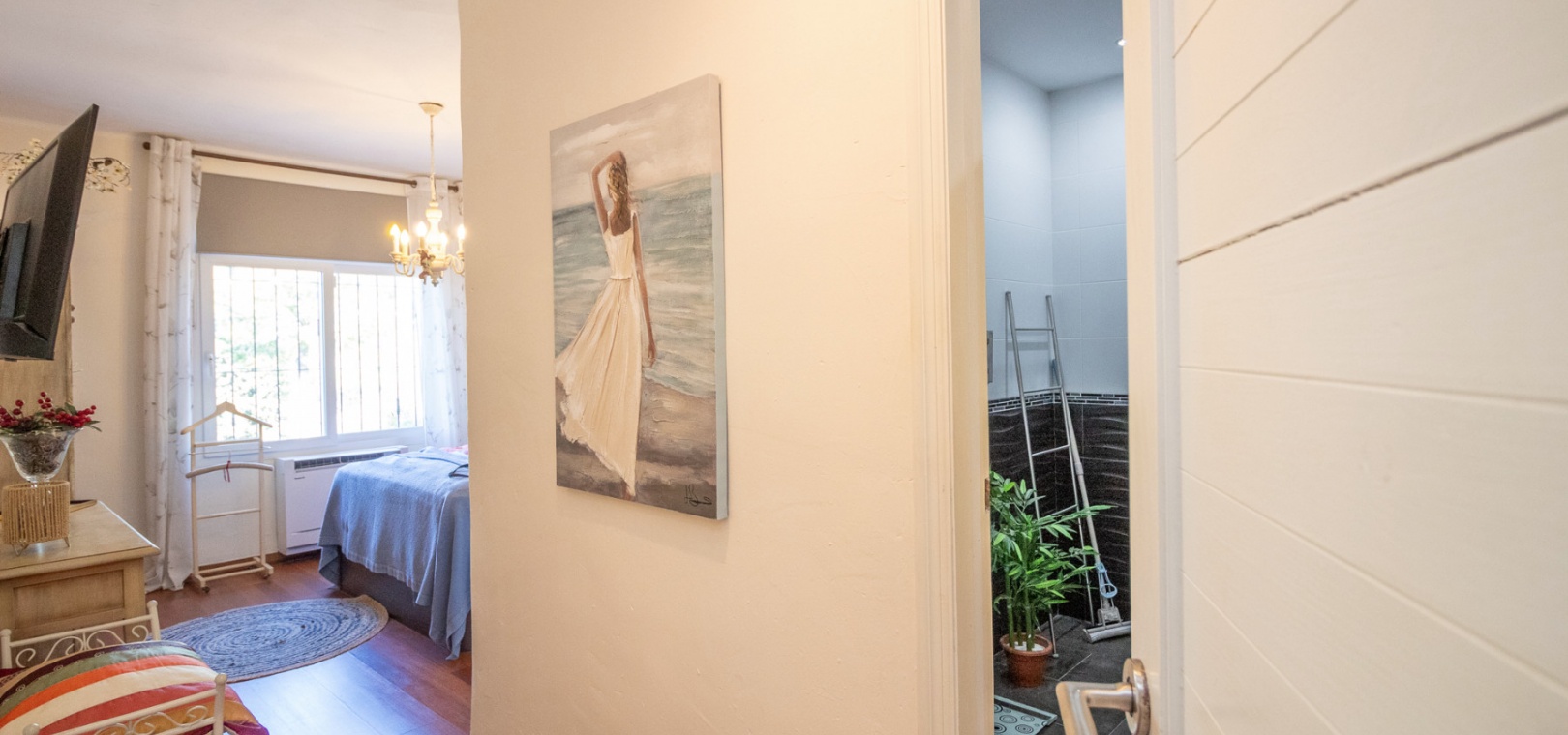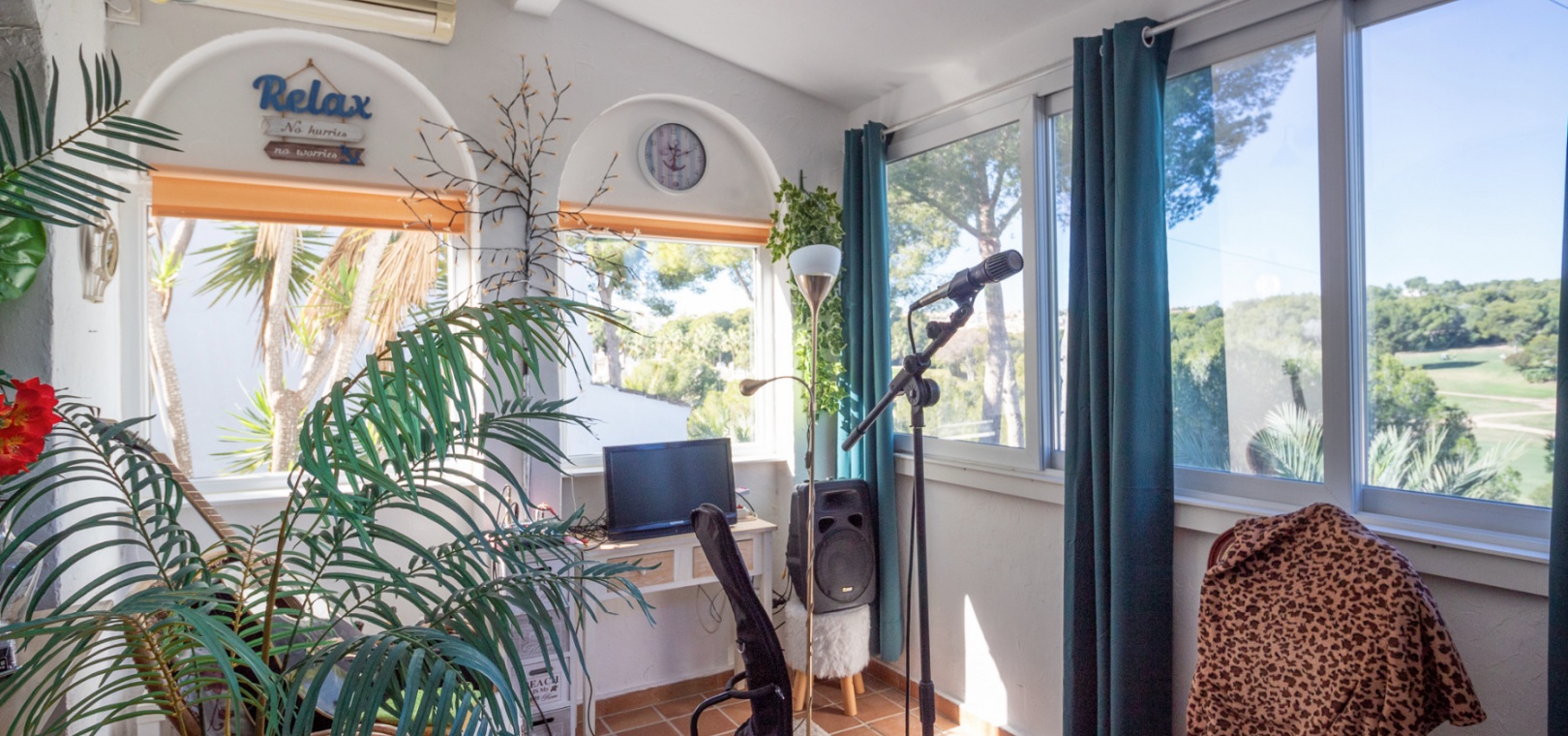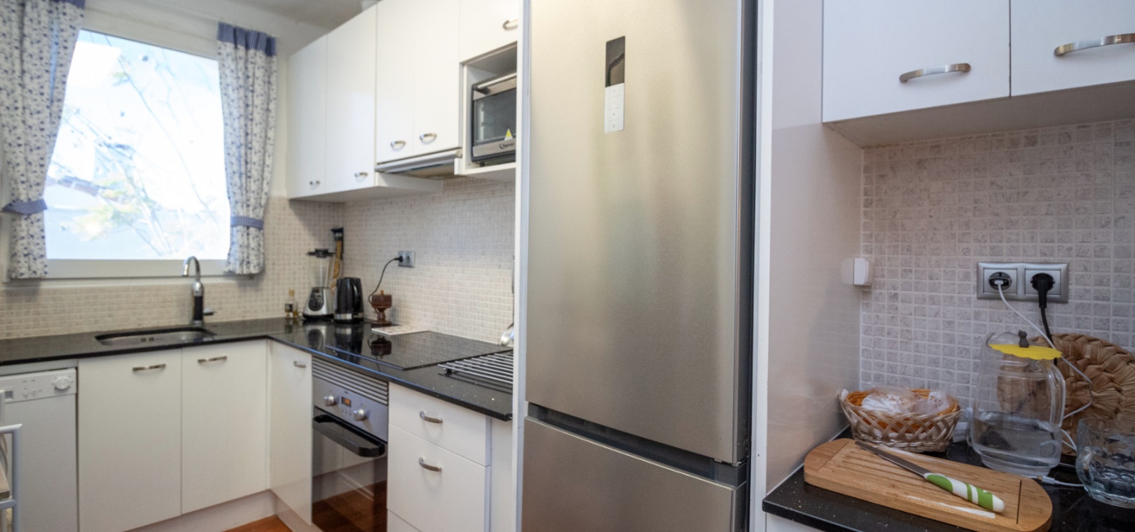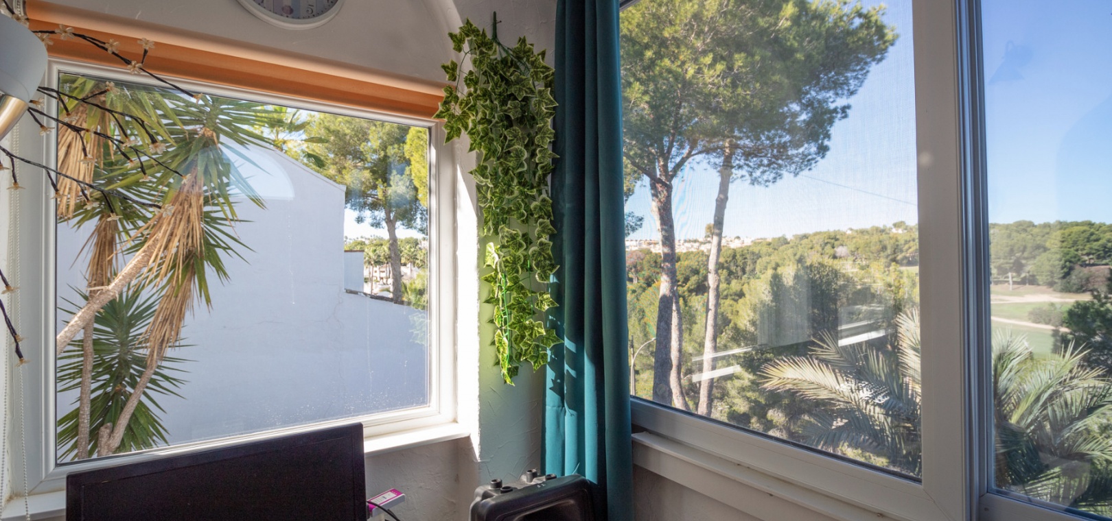 Upstairs, the main living area is flooded with natural light and offers stunning views over the surroundings. The first floor comprises a bright living and dining area, an American-style kitchen with a breakfast bar, and a guest WC. From here, you can access both the balcony and the private solarium, perfect for enjoying the sun or entertaining with panoramic vistas over the Villamartin golf course.
