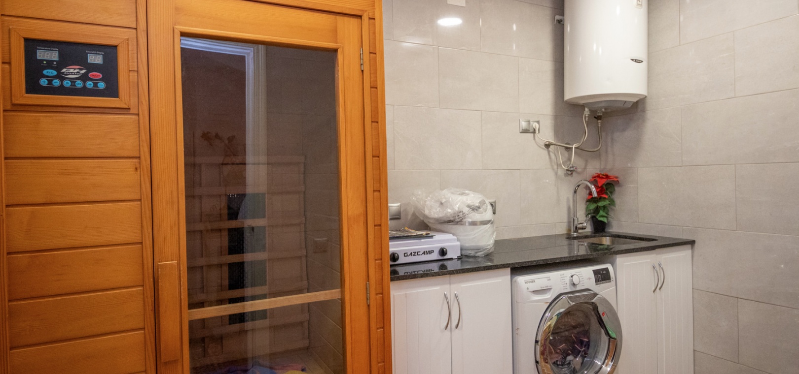 The ground floor features a practical layout with two double bedrooms, two bathrooms, a utility room with a sauna, and access to a conservatory—providing versatile living space ideal for relaxation or family use.