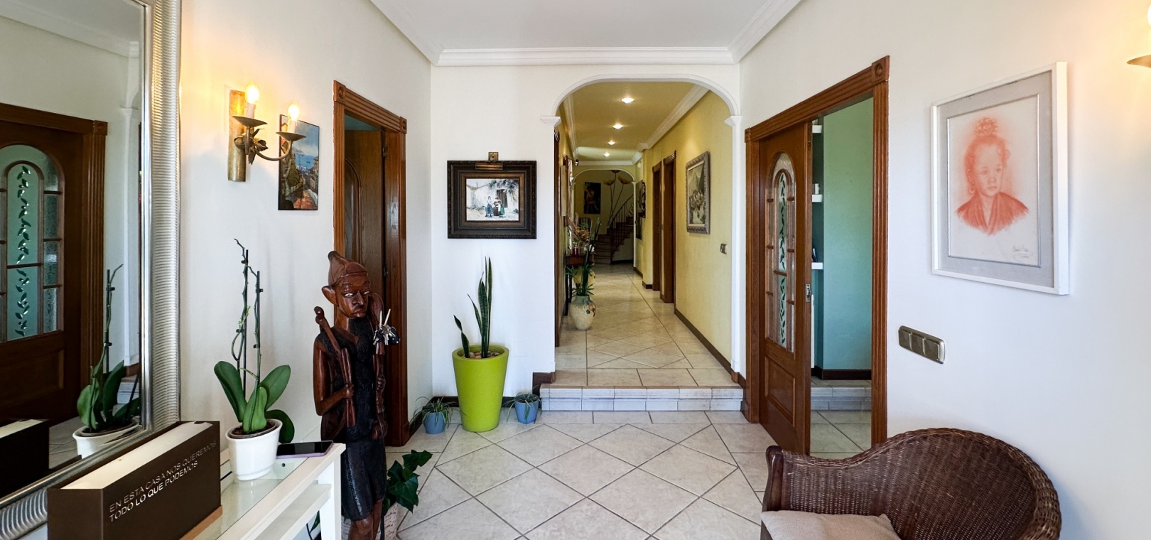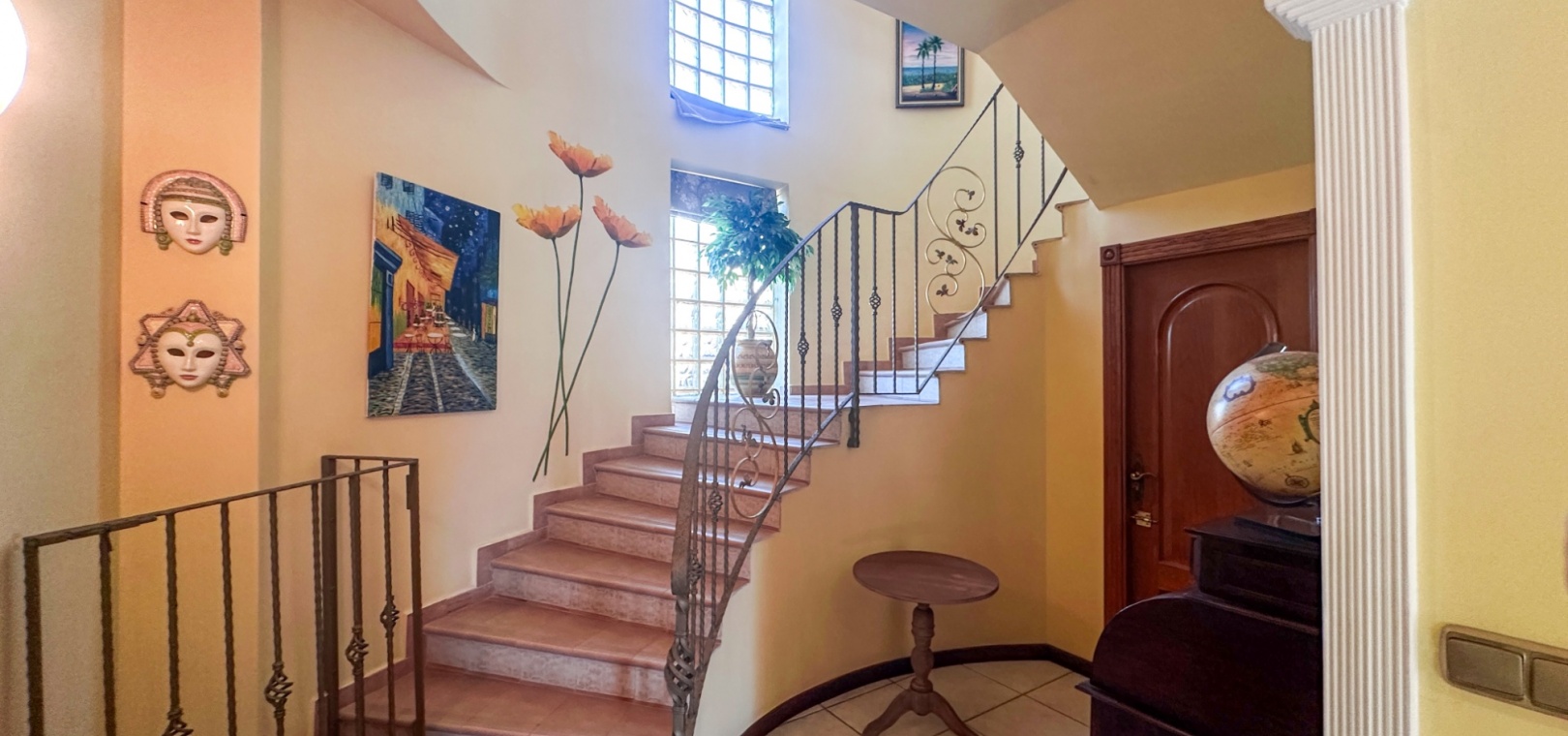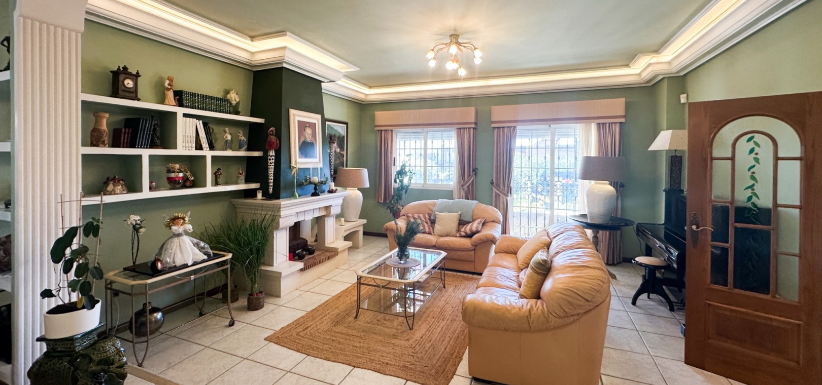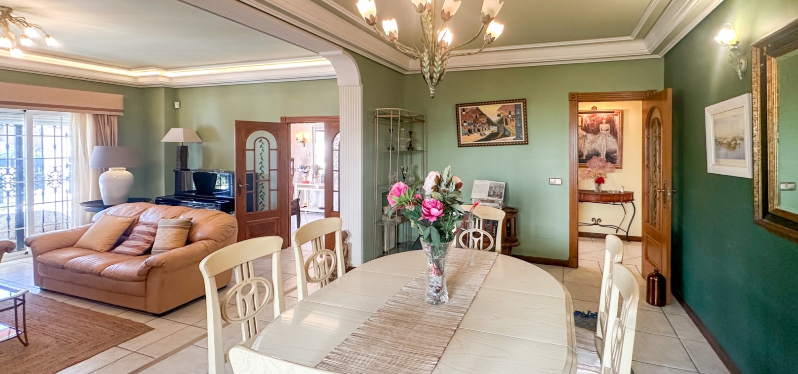 The villa features spacious and bright living areas, comprising six bedrooms and five bathrooms, making it ideal as a permanent family residence or a luxurious holiday home. Its south-facing orientation ensures excellent natural light throughout the day, enhancing the warm and welcoming atmosphere.