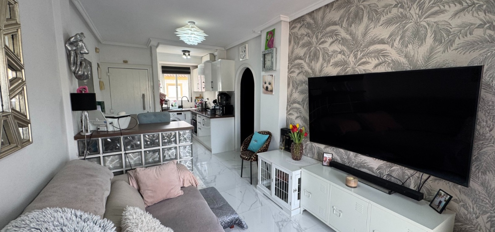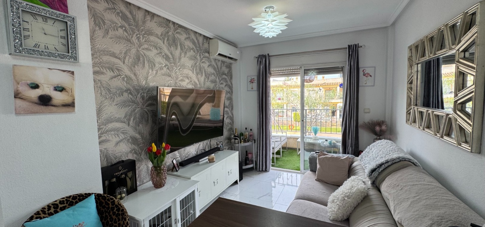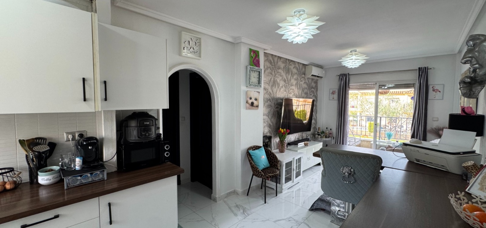 Upon entering, you are greeted by a bright and spacious open-plan living area, seamlessly connected to a fully fitted modern kitchen with integrated appliances. Large windows and patio doors fill the space with natural light and lead directly onto a private terrace overlooking the communal swimming pool—perfect for relaxing or entertaining.