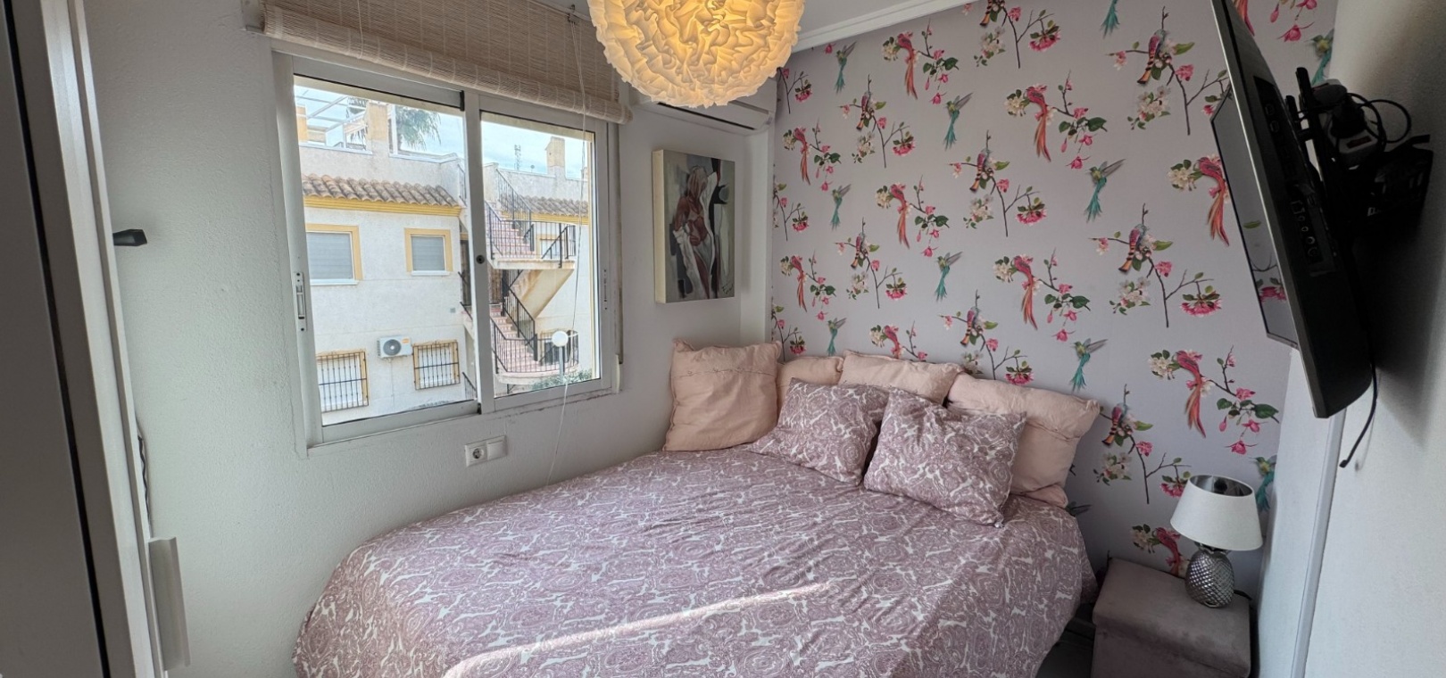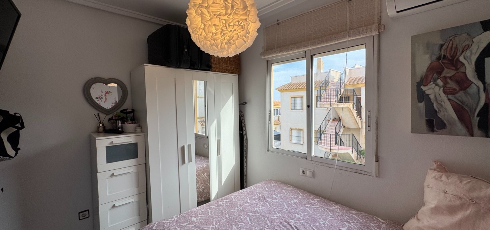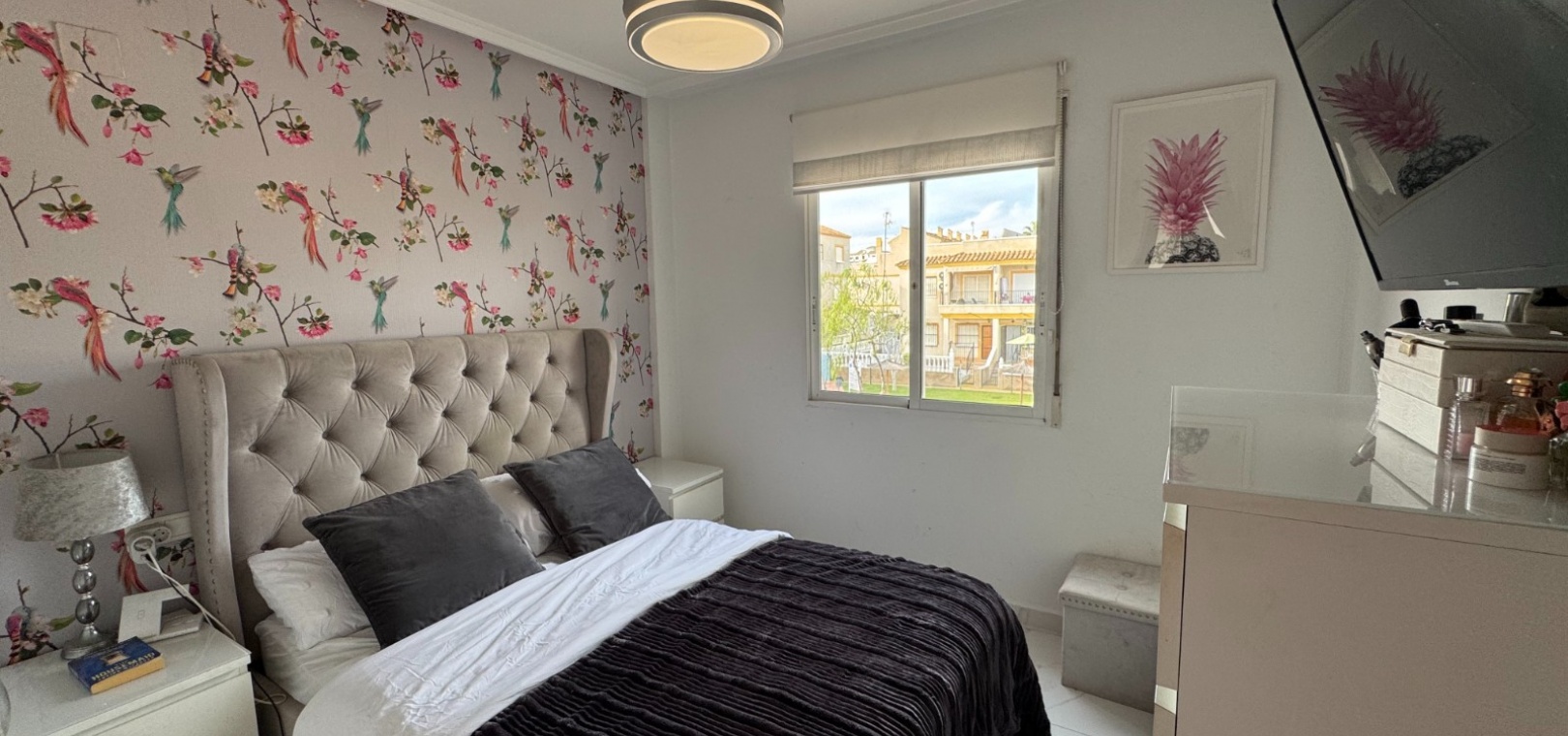 The smaller bedroom is generously sized and currently accommodates a king-size bed, while still comfortably fitting a standard double. It features a large window allowing ample natural light. The stylish bathroom includes a walk-in shower and a modern vanity unit. The larger bedroom, also south-facing, features fitted wardrobes and offers views over the communal pool.