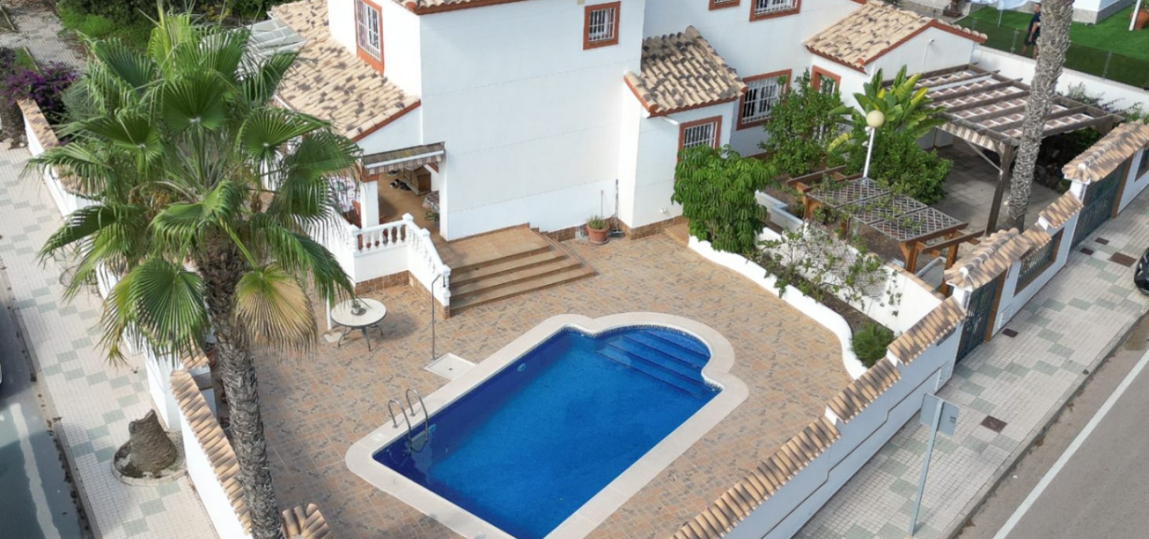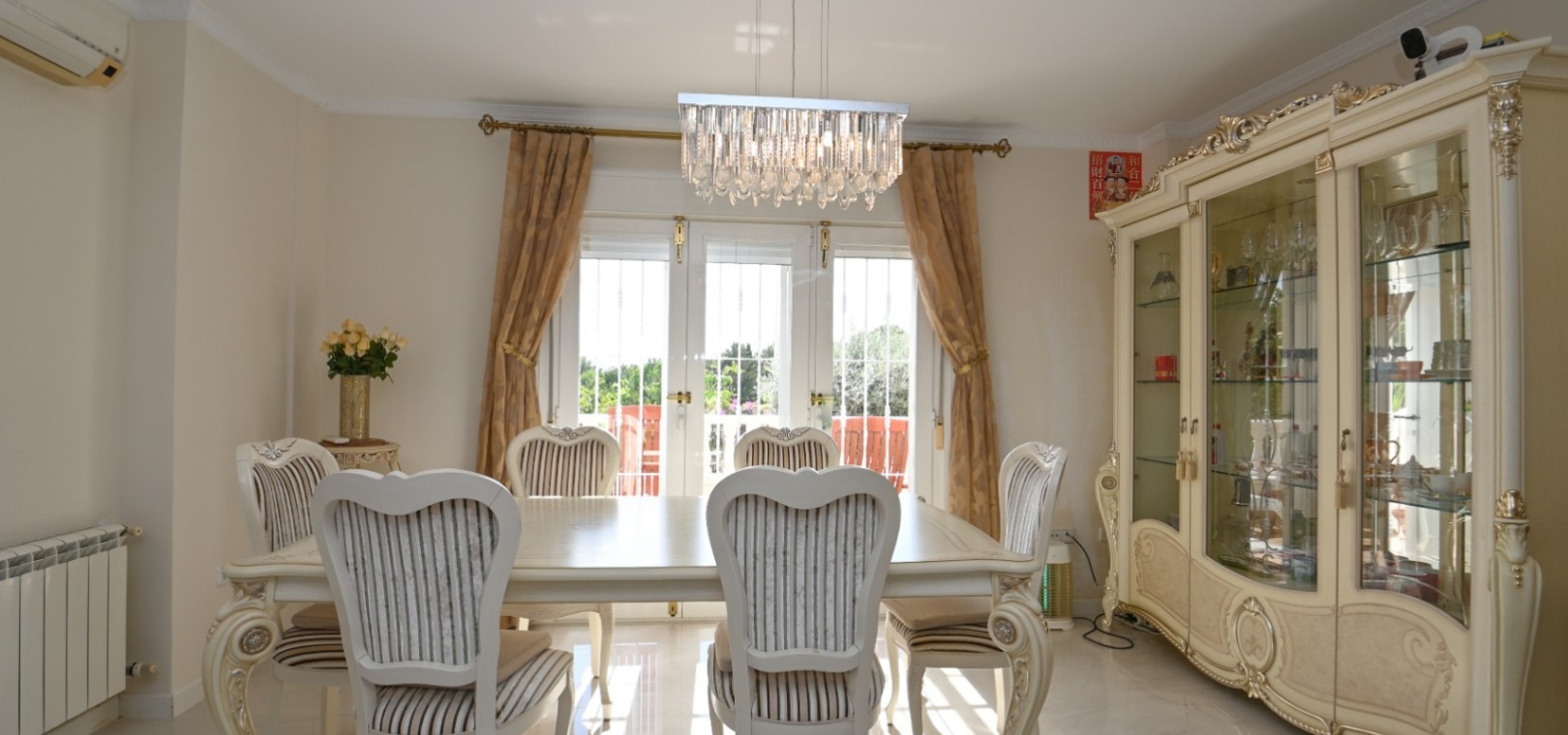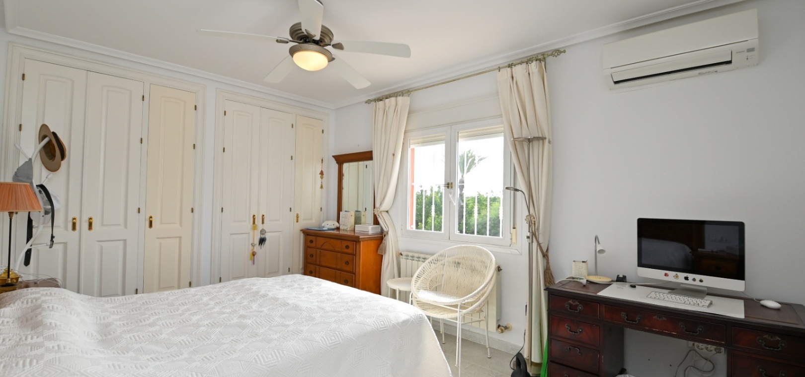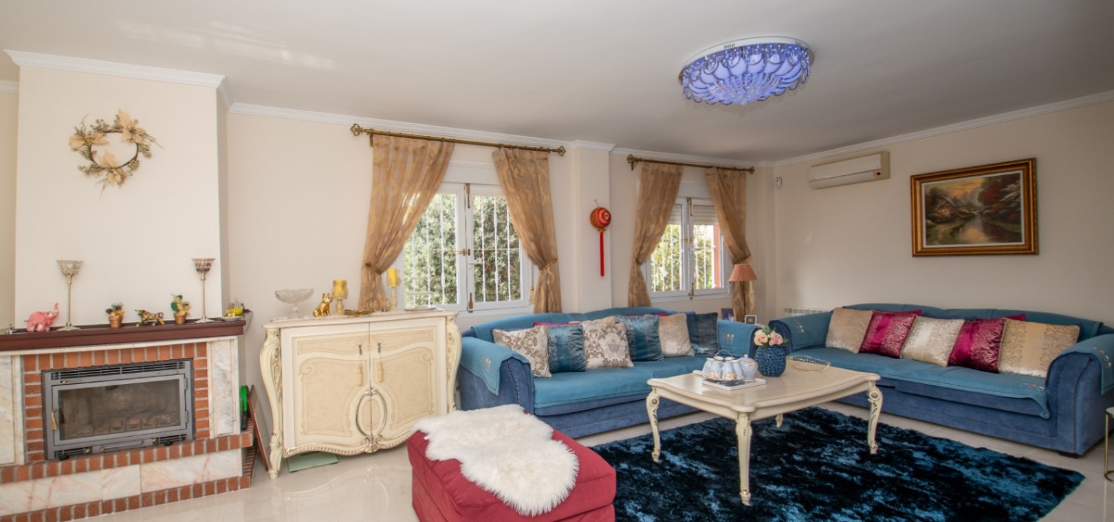 Additional features include double glazing throughout, new ground-floor floor tiling, gas central heating, and hot and cold air conditioning. The villa was originally constructed as a five-bedroom property, with one bedroom removed to create a more spacious living area. The property is sold part furnished, allowing buyers to move in with ease while still offering scope for personalisation.