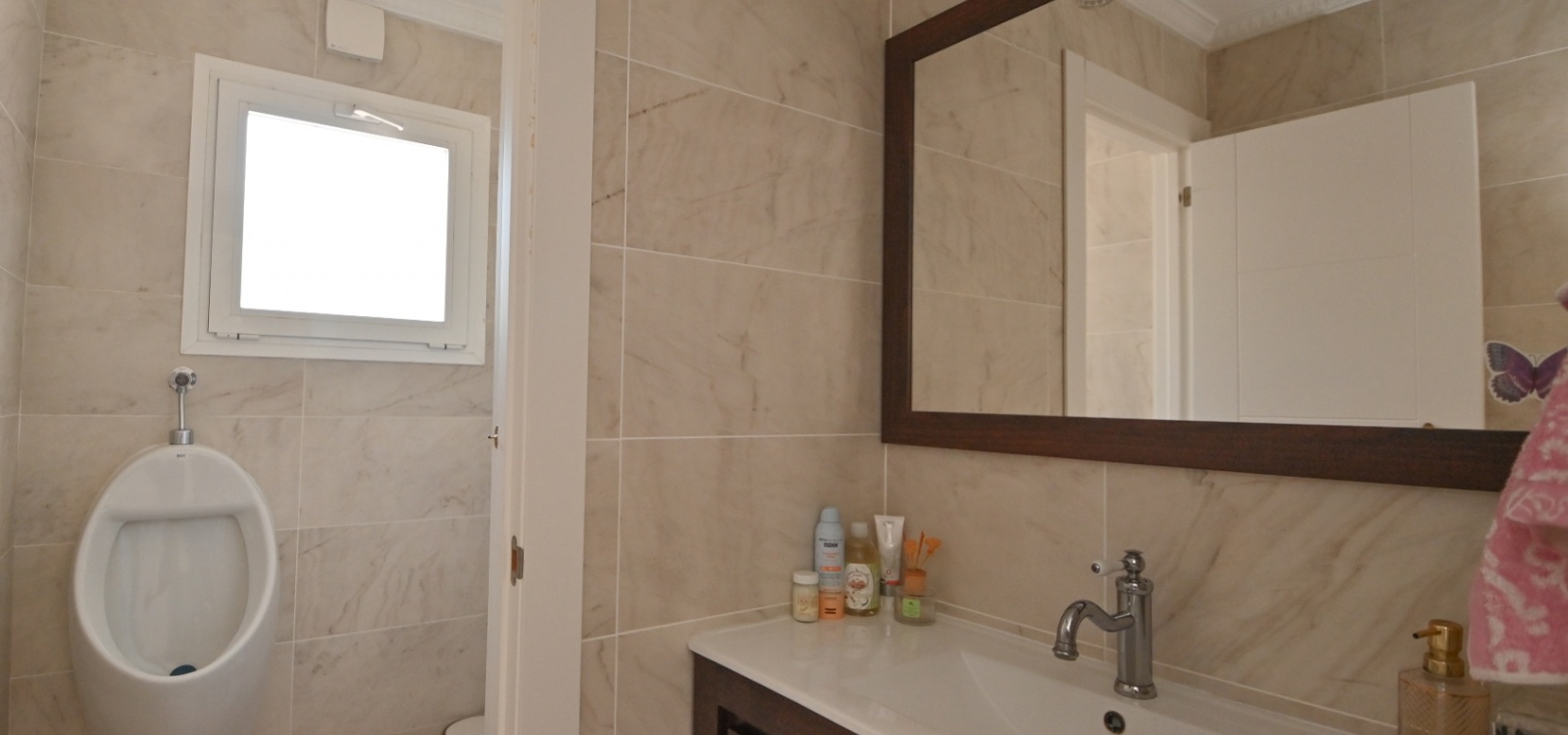 The main living and dining area has been updated with new floor tiling and features a striking marble-faced wall with an open log fireplace. This creates a modern yet welcoming focal point, ideal for cooler evenings. Also on this level is a versatile room currently used as a guest area, equally suitable as a double bedroom, along with a modernised guest cloakroom. Having a bedroom on the ground floor makes the property particularly well suited to multigenerational living or hosting guests comfortably.