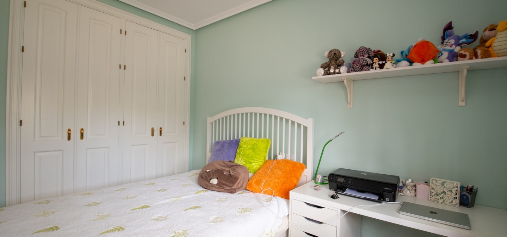 The upper floor comprises three additional bedrooms and two bathrooms. The master suite benefits from fitted wardrobes, a shower room with jacuzzi bathtub, and direct access to a private terrace with golf course views. Two further double bedrooms, both with built-in wardrobes, share another sun terrace, ensuring all bedrooms enjoy natural light and outdoor access. A family shower room serves these bedrooms.
