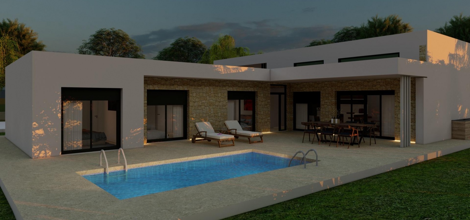 Discover this stylish new build villa located on a spacious rustic plot of 10.700 m2 on the outskirts of Pinoso, Alicante. Designed for those seeking privacy, tranquility and a close connection to nature, this modern home combines contemporary architecture with the charm of the Spanish countryside. Surrounded by vineyards, almond and olive groves, the property offers a serene lifestyle just a short drive from all local services.
