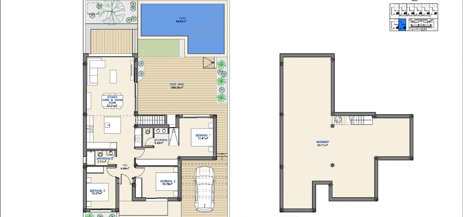 The villas include 3 spacious bedrooms, 2 bathrooms, an open-plan kitchen integrated with the living room, fitted wardrobes, a large terrace, a private pool, and a parking space. Some units also feature a basement, and a solarium is available as an option.