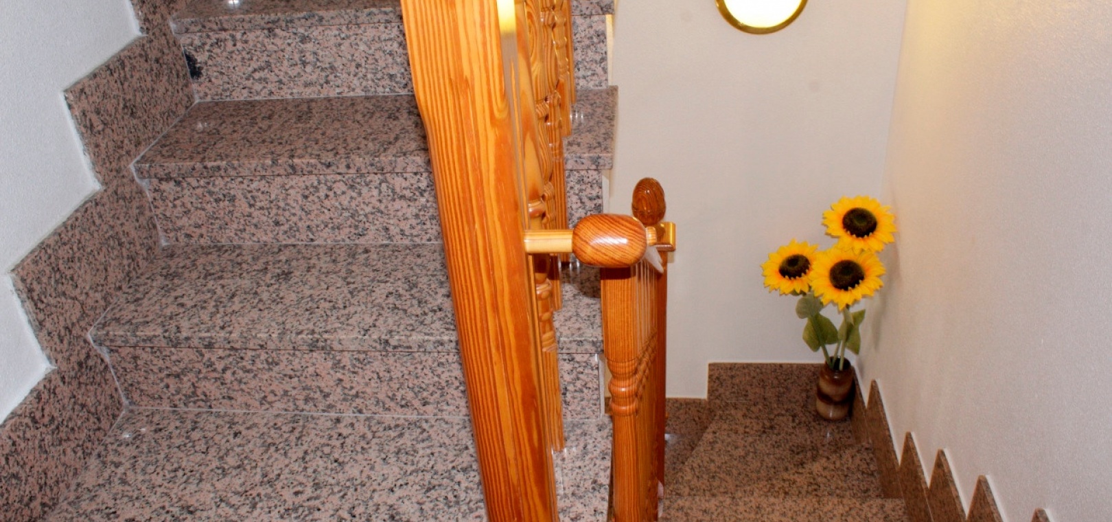 An open staircase leads to the first floor, which comprises two bedrooms and a family bathroom with bathtub, ideal for guests or family living. The top floor is dedicated to a large main bedroom with a spacious en-suite bathroom with shower. From this bedroom, there is direct access to a large private roof terrace, offering sea views — an ideal space for sunbathing, relaxing, or enjoying evening sunsets.