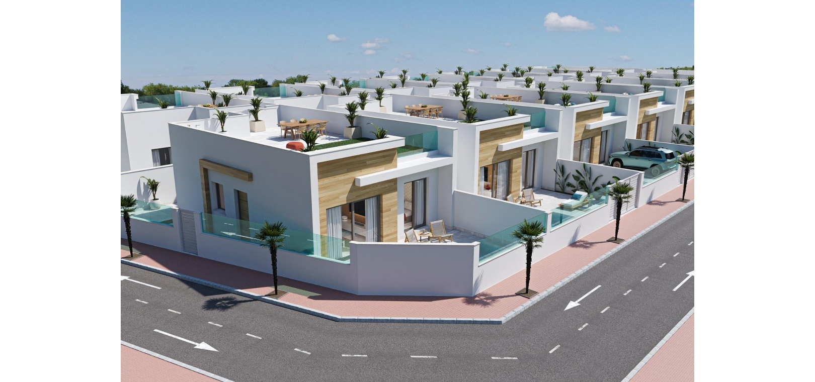 This exclusive development of 6 independent villas is designed to offer maximum privacy, comfort and outdoor living. Located in El Jimenado, a quiet residential area belonging to Torrepacheco in the Murcia region, these elegant one level homes combine modern design with the relaxed Mediterranean lifestyle. Each villa sits on its own plot with private garden, swimming pool, large terraces and on plot parking, allowing you to enjoy sunshine and outdoor living all year round.