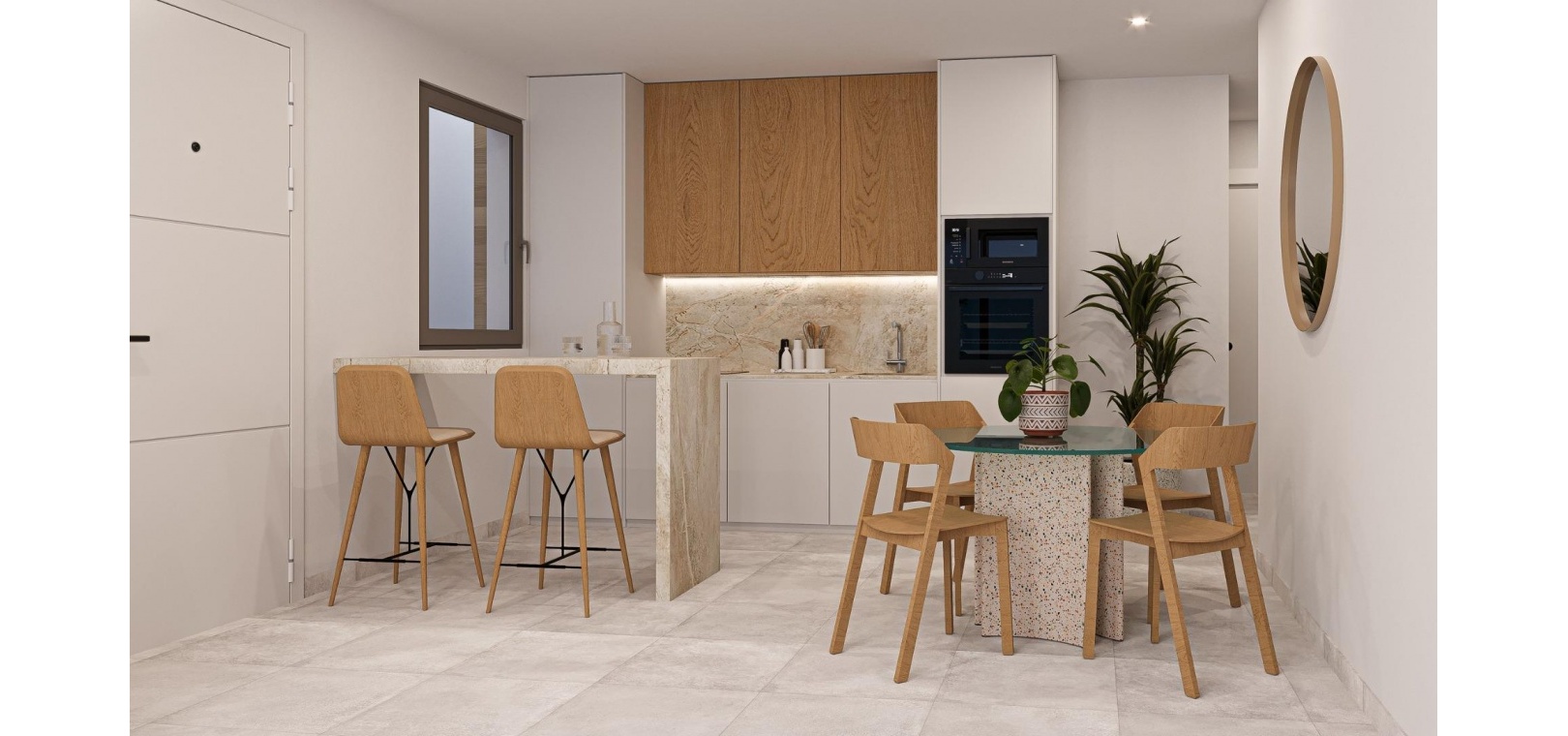 The villas are thoughtfully designed with an open plan layout where the fully equipped kitchen integrates seamlessly with the bright living and dining area. Large windows connect the interior spaces with the terraces and pool area, creating a natural flow between indoor and outdoor living.