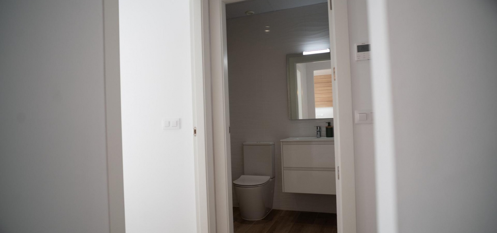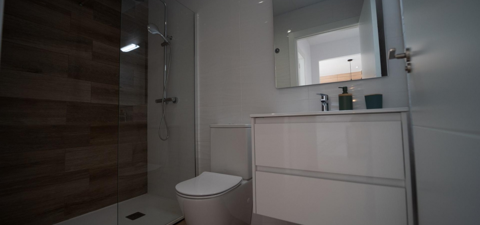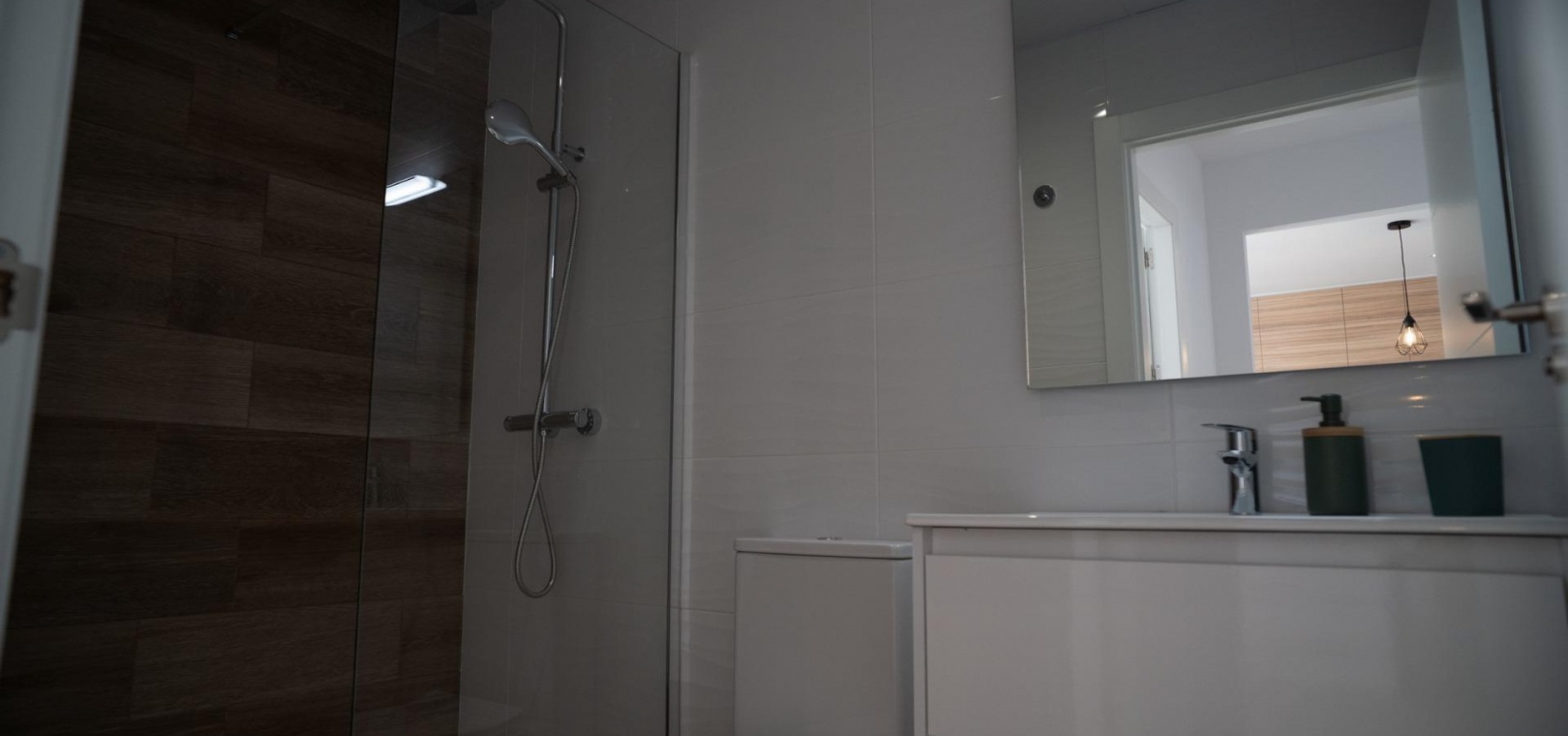 Fully fitted bathrooms with toilet, vanity unit, mirror and shower with screen panels.