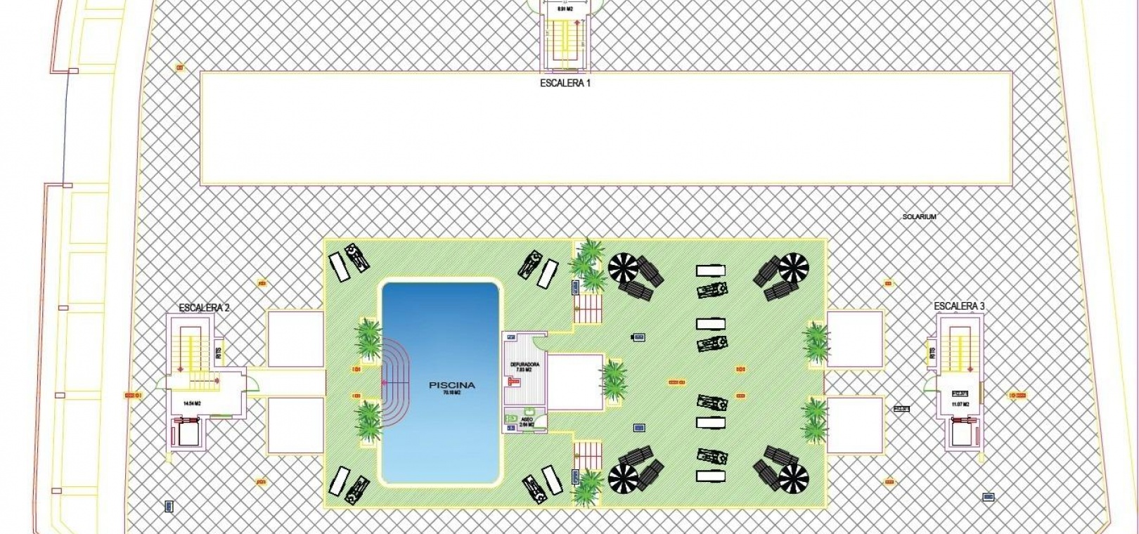 On the rooftop, an impressive 350 m2 leisure area awaits. This space includes a 70 m2 swimming pool with a separate children’s splash area, pergolas, sun loungers and shaded areas, allowing residents to relax while enjoying panoramic views. The rooftop is easily accessible by one of the three lifts and includes sanitary facilities for added comfort.
