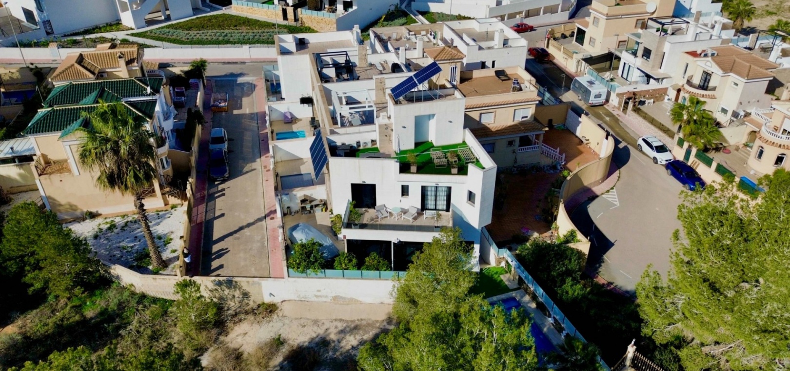Additional features include a convenient WC, a spacious basement offering endless possibilities for storage or additional living space, and off-street parking. The luxurious finishings and attention to detail throughout the villa elevate it to a standard of modern elegance, making it an exceptional residence in one of Villamartin's most desirable locations.