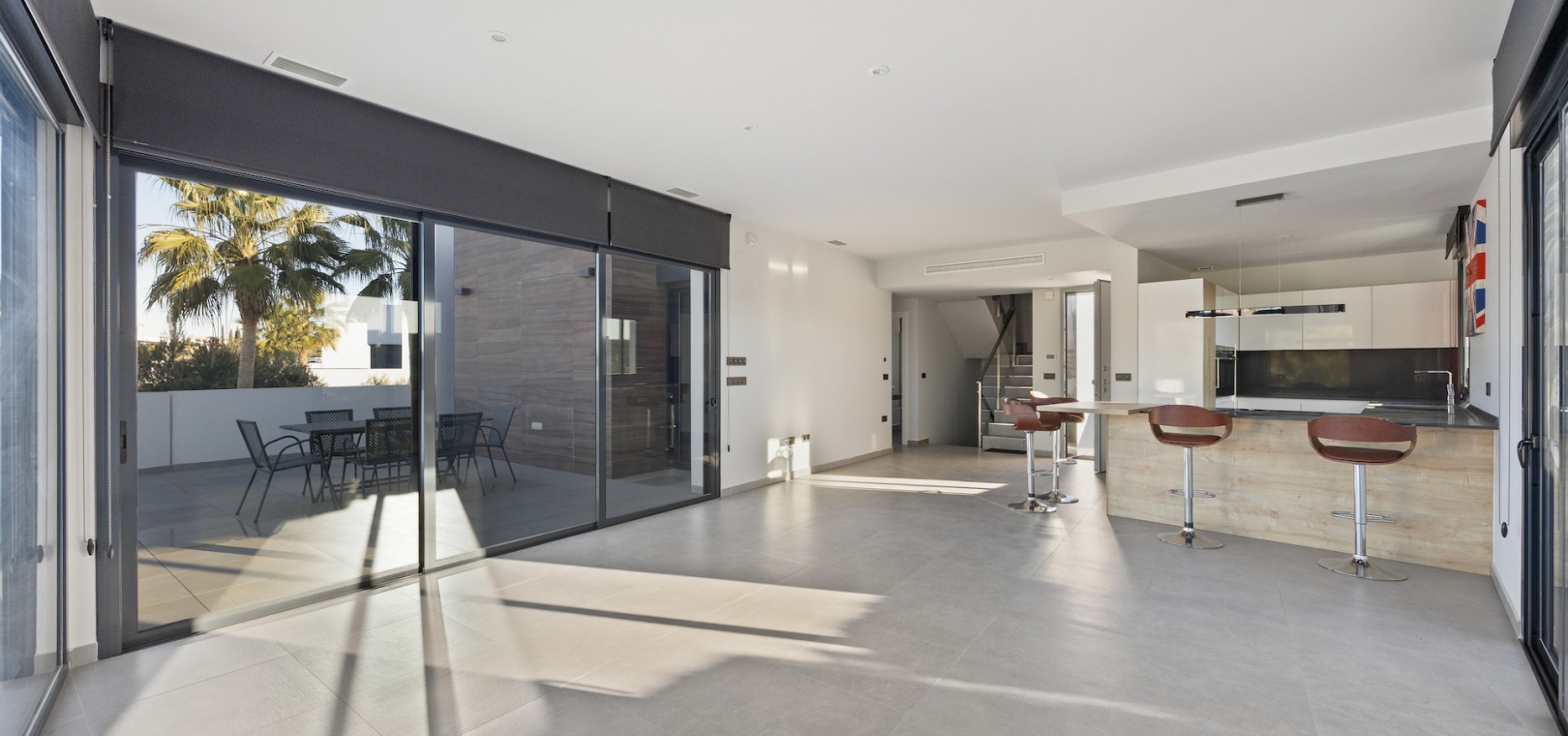 The main living level offers a bright open-plan layout with high ceilings, floor-to-ceiling glazing, direct terrace and pool access, and panoramic views. The fully equipped designer kitchen includes premium Siemens appliances, dual ovens, an induction hob with integrated extractor, generous storage, and a breakfast bar island.