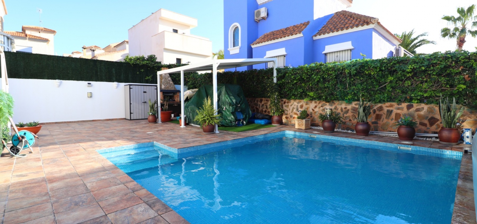 This impressive south-east facing four-bedroom detached villa in Las Filipinas enjoys a prime position overlooking a peaceful green area of trees and shrubs, within one of the most desirable residential locations on the Costa Blanca South.