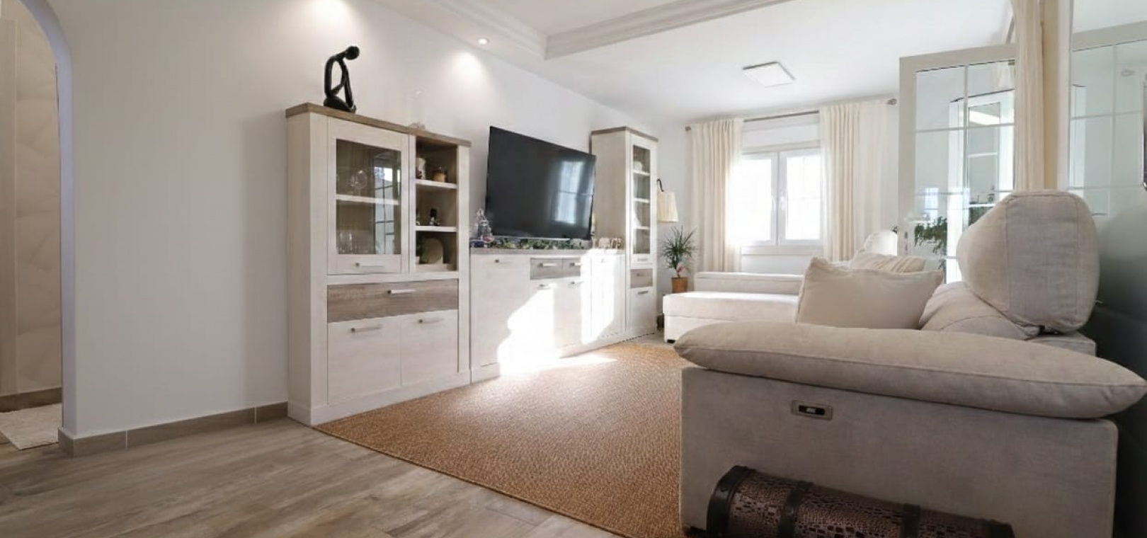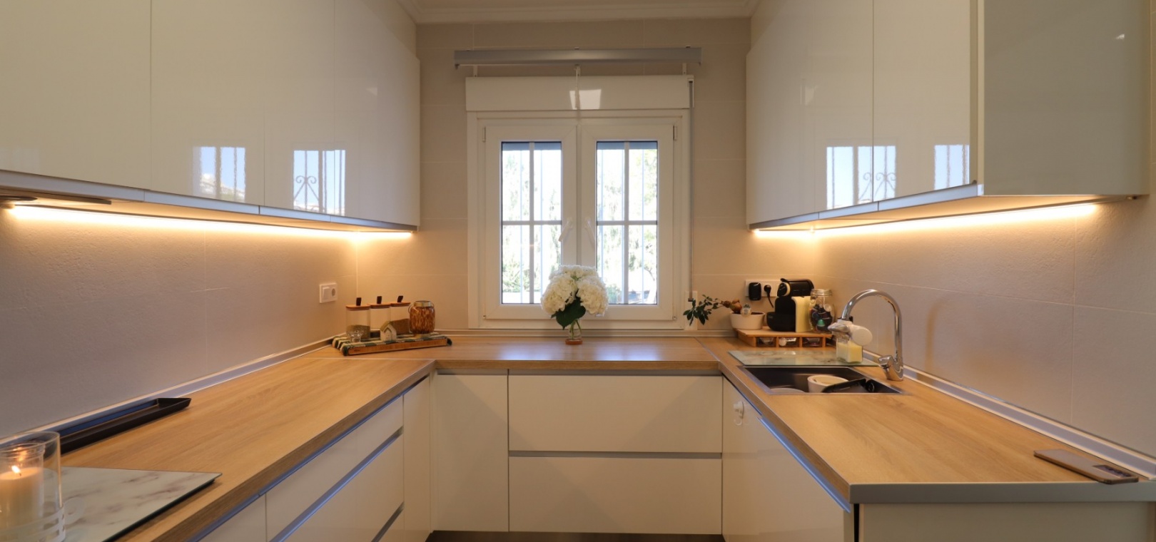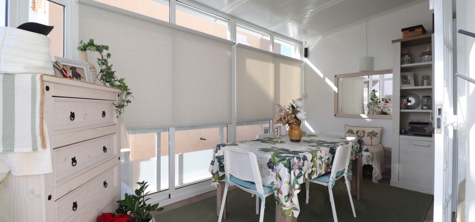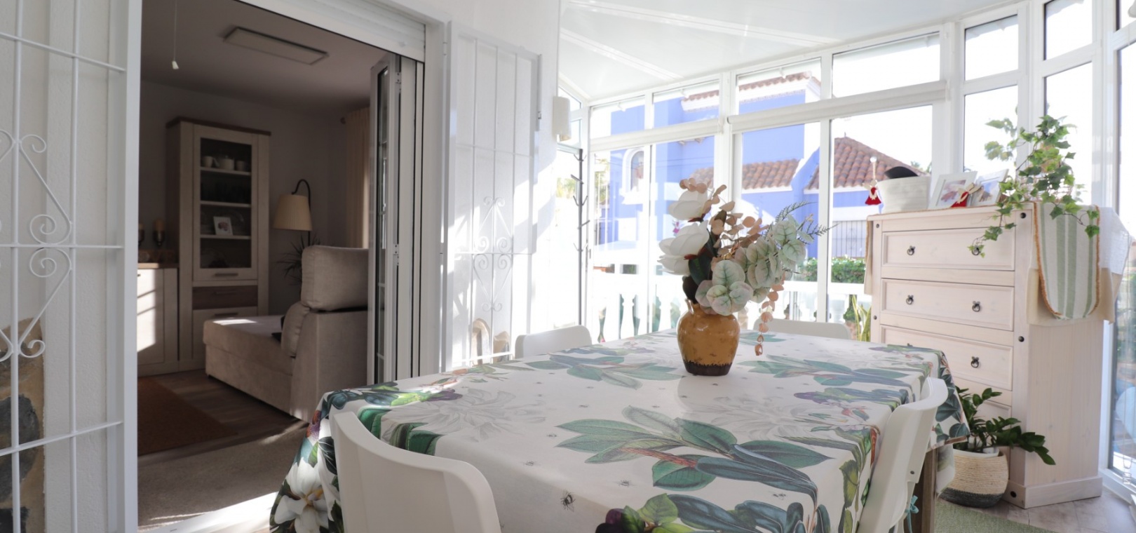 The villa welcomes you through an entrance hall with stairs leading to the upper floor. The bright and spacious lounge-dining room features double opening glazed doors leading into a charming curved glazed area, currently used as an additional dining space — perfect for enjoying natural light throughout the year.