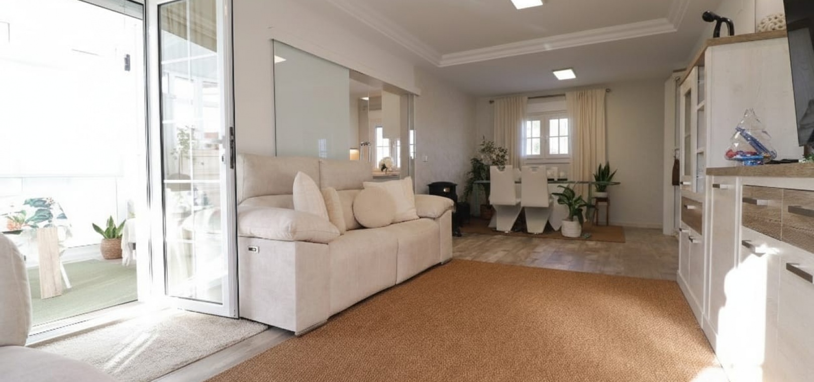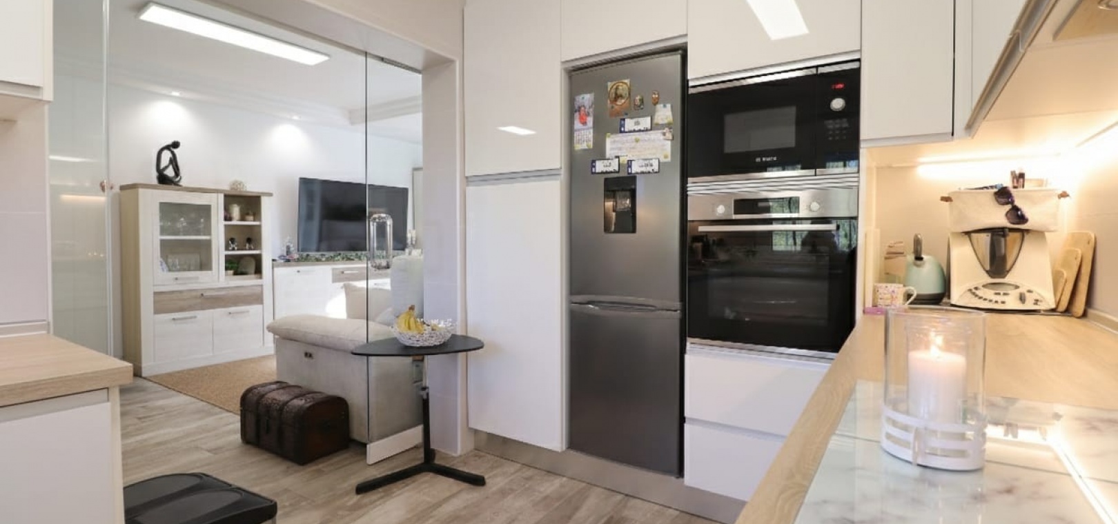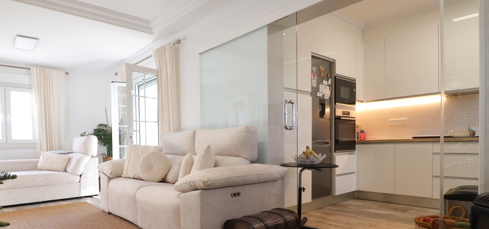 Wide, modern sliding glass doors separate the living area from a beautifully fitted contemporary kitchen, creating an open yet defined layout.