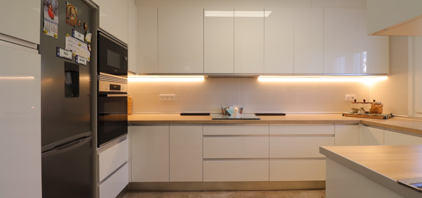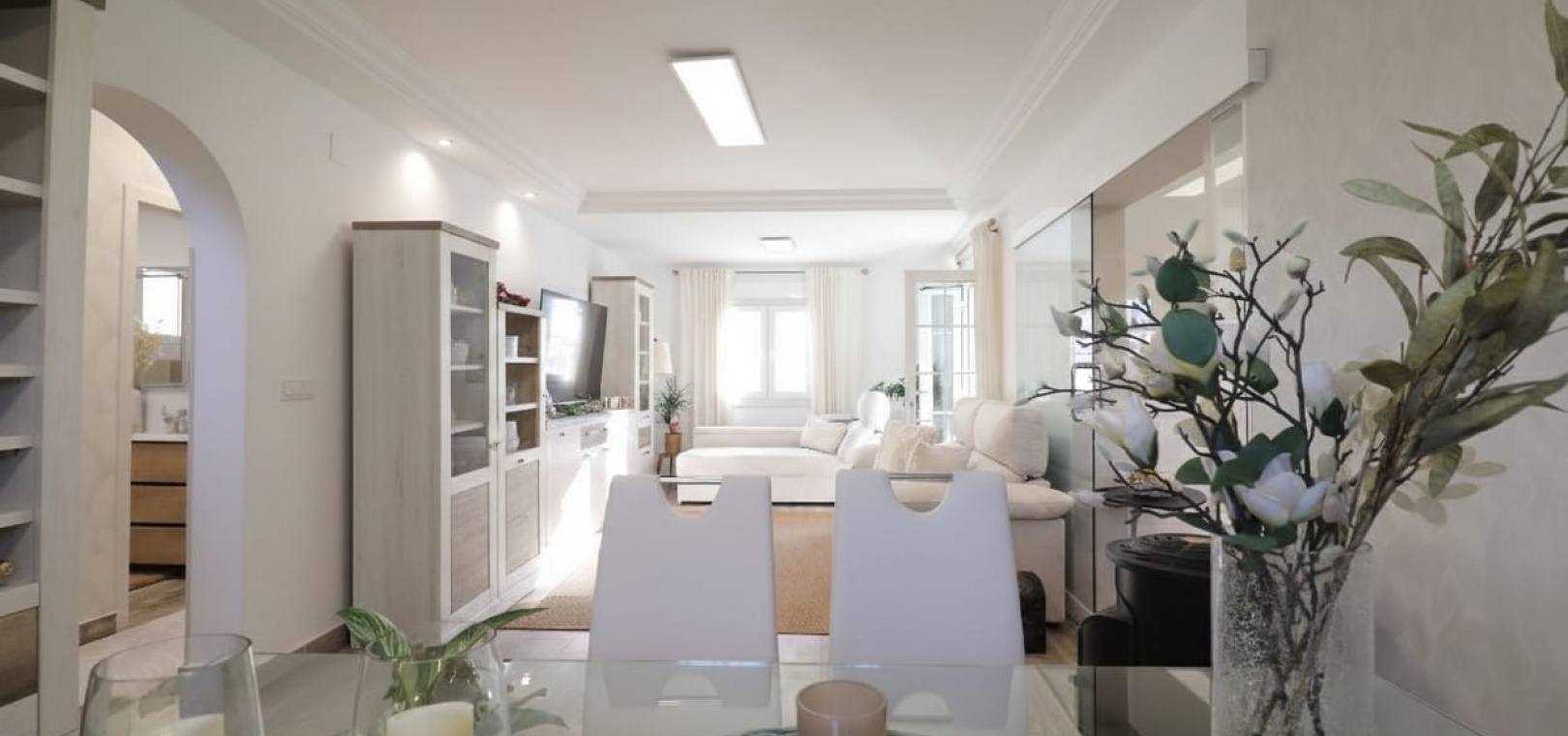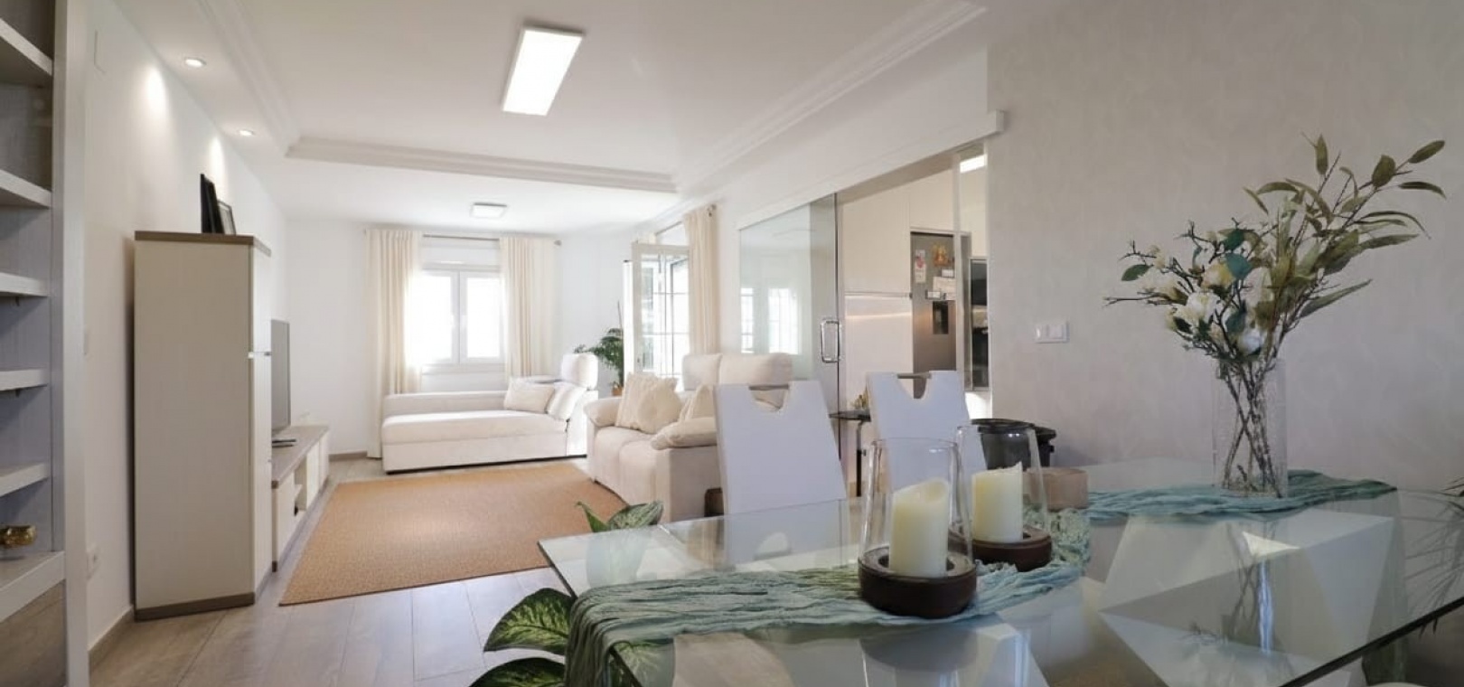 Wide, modern sliding glass doors separate the living area from a beautifully fitted contemporary kitchen, creating an open yet defined layout.