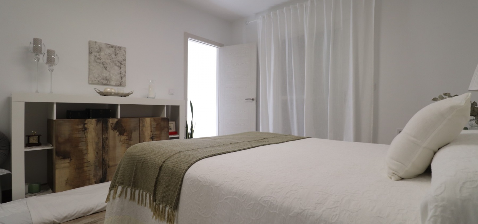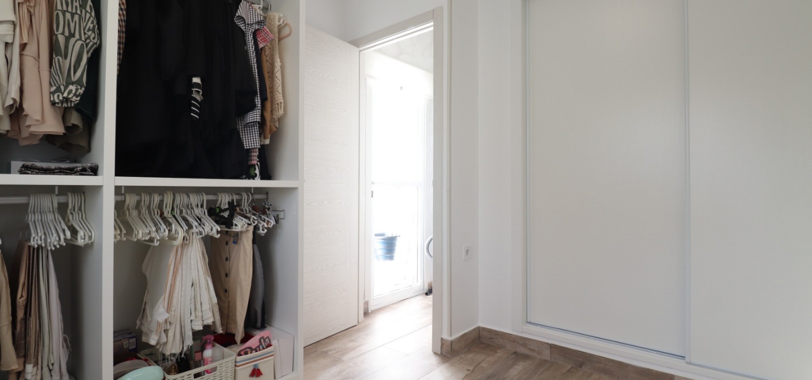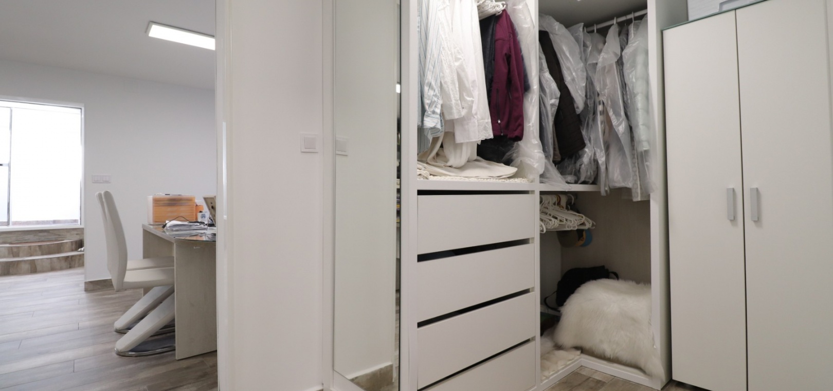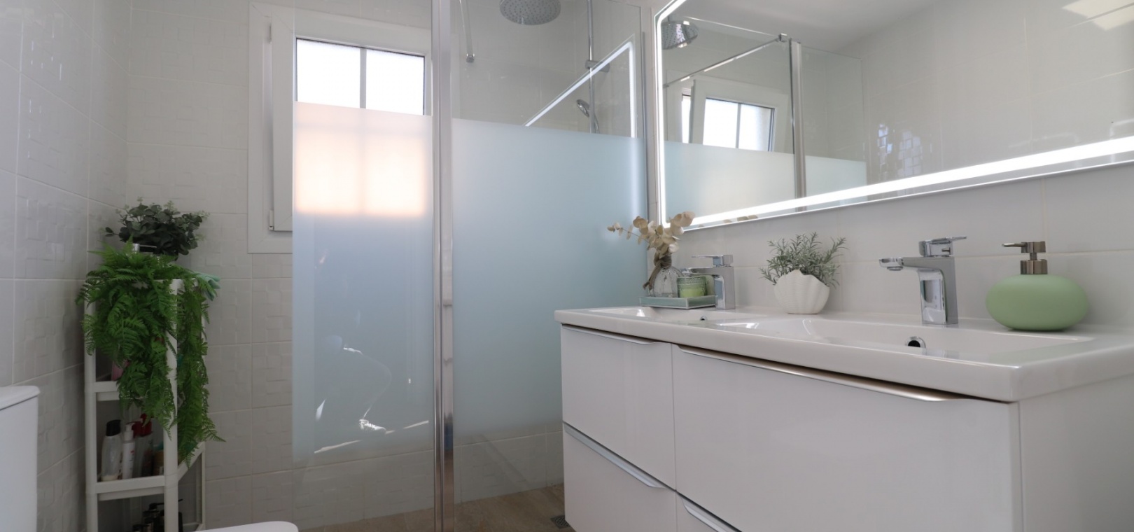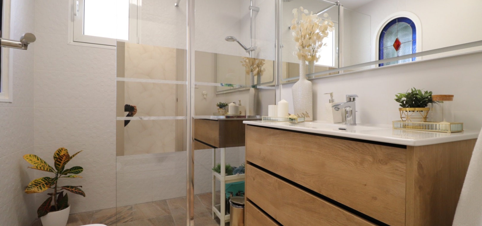 Upstairs, the master bedroom enjoys direct access to a private terrace, also accessible from the landing — an ideal spot for morning coffee or evening relaxation. Another double bedroom features a walk-in dressing area in addition to fitted wardrobes, while the remaining bedrooms also include built-in storage. A further modern shower room with walk-in shower serves this level.