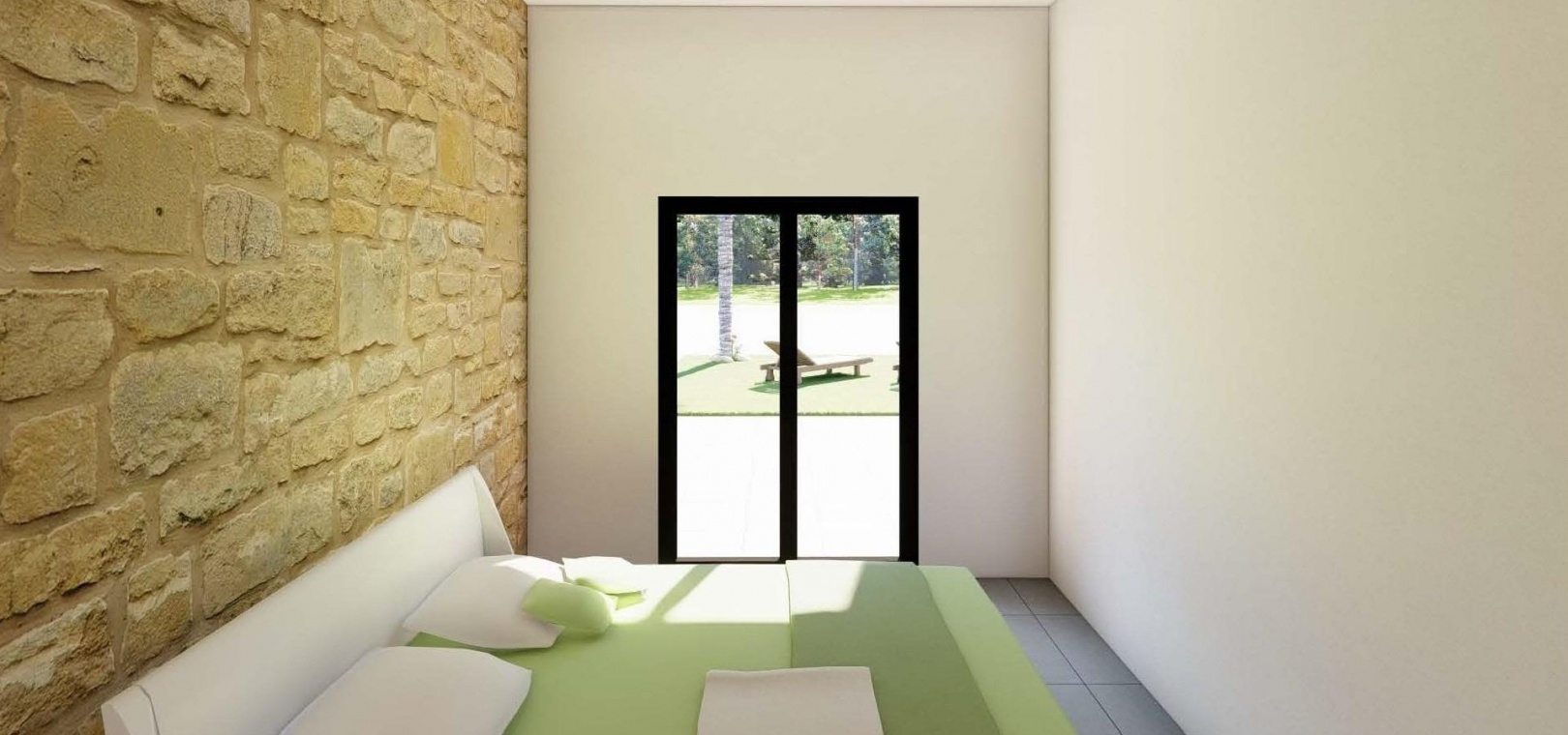 The villa is laid out on one floor and has 3 bedrooms and 2 bathrooms, one of which is en suite.