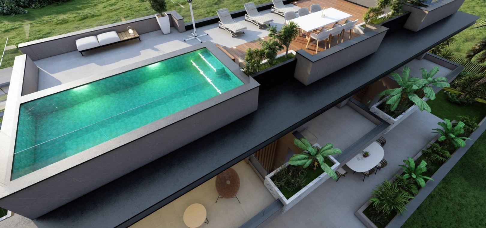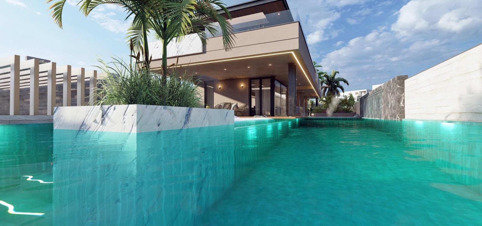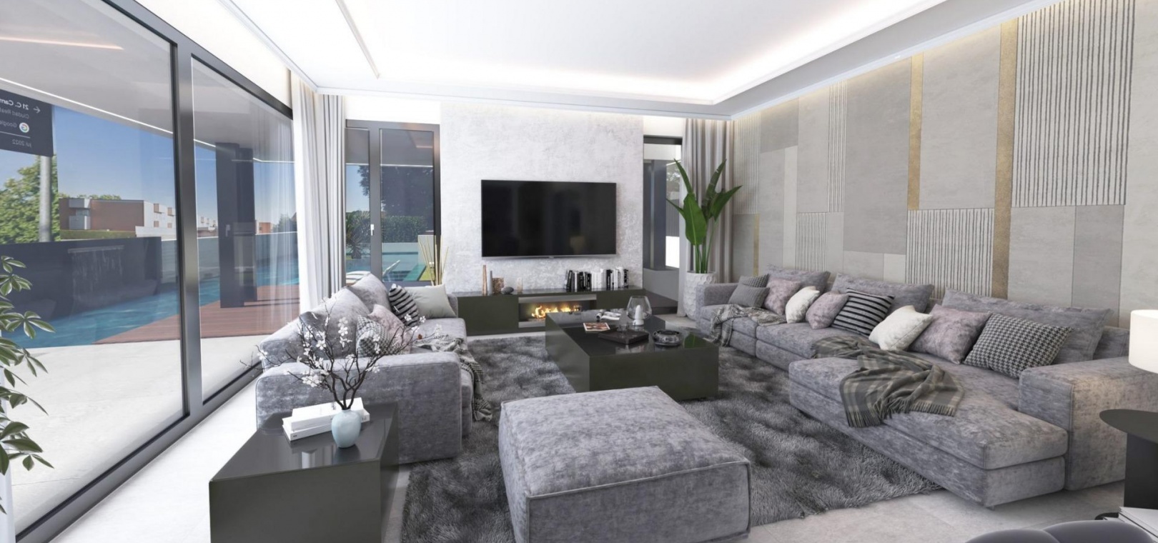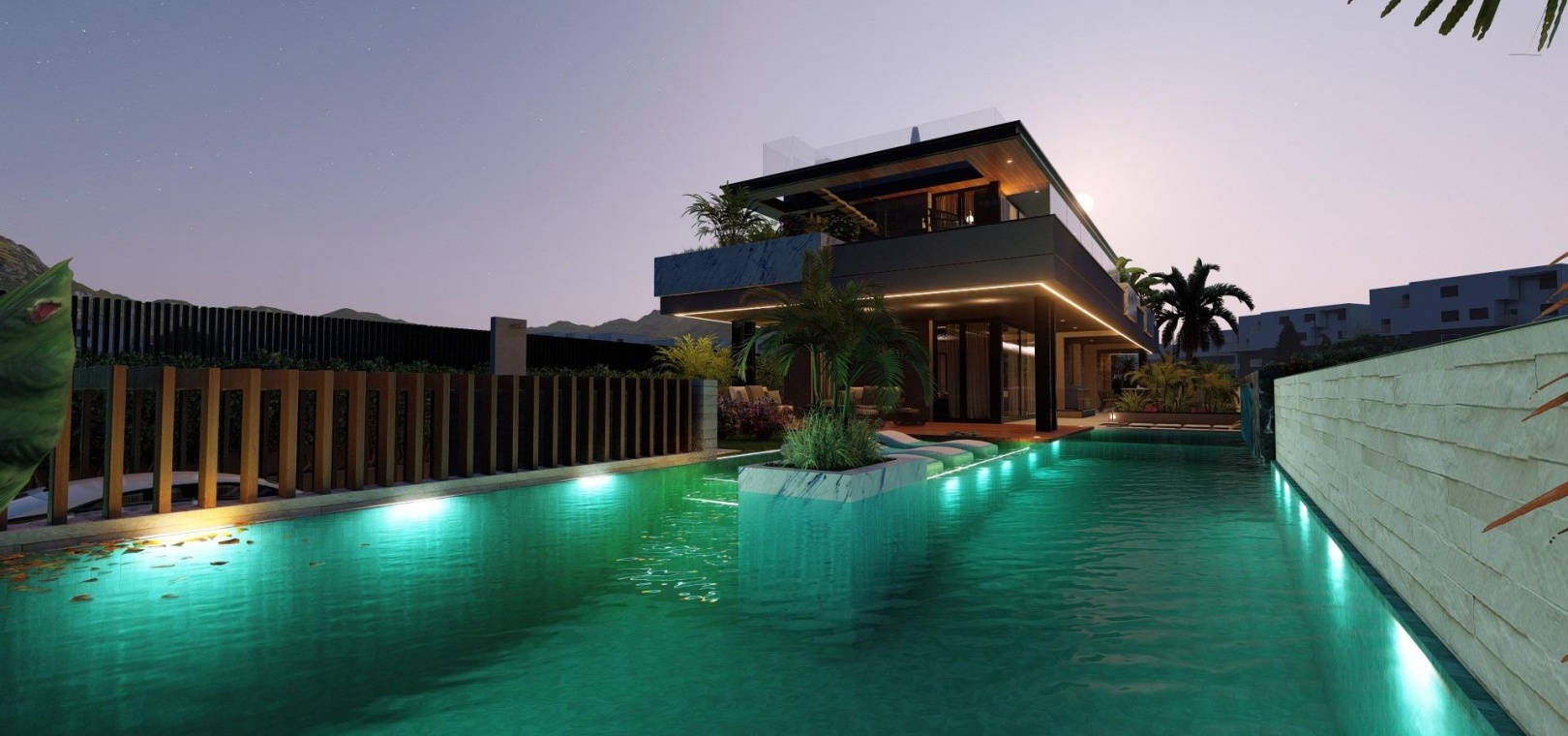 The villa includes advanced home automation, central air conditioning, underfloor heating and premium quality materials throughout, ensuring maximum comfort and energy efficiency.