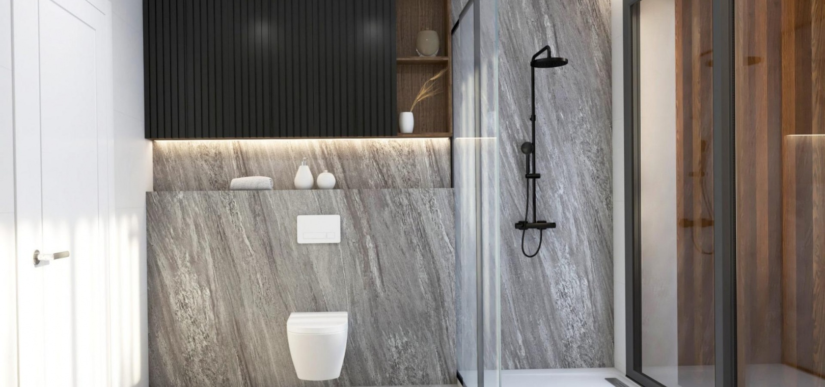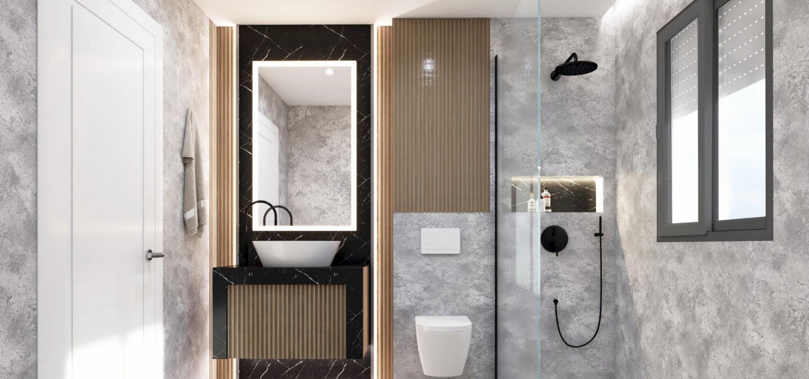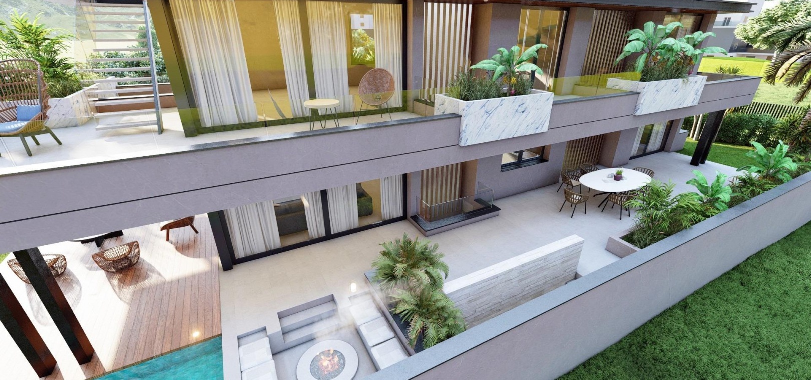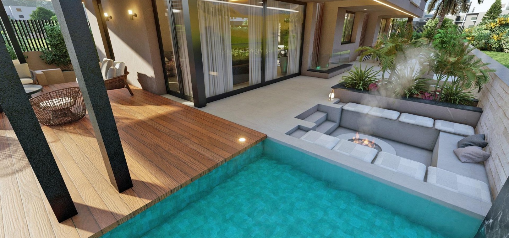 On the ground floor, a private garage for two cars sits alongside a landscaped garden, elegant fire pit and a large saltwater swimming pool. Inside, the open plan living room, dining area and modern kitchen connect seamlessly to an expansive terrace through floor to ceiling windows. This level also includes a bedroom with fitted wardrobes and a full bathroom.