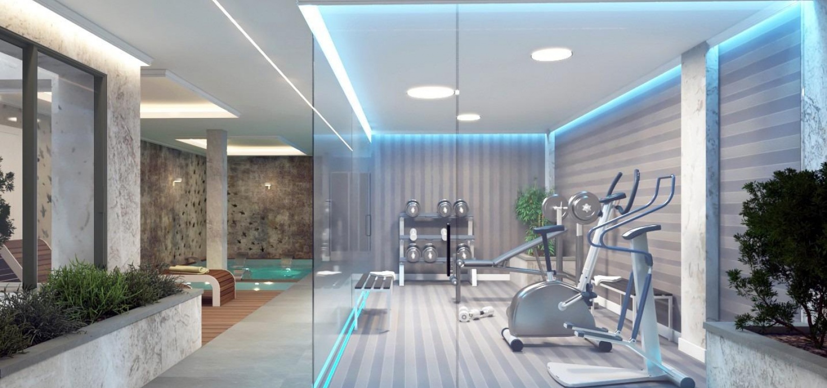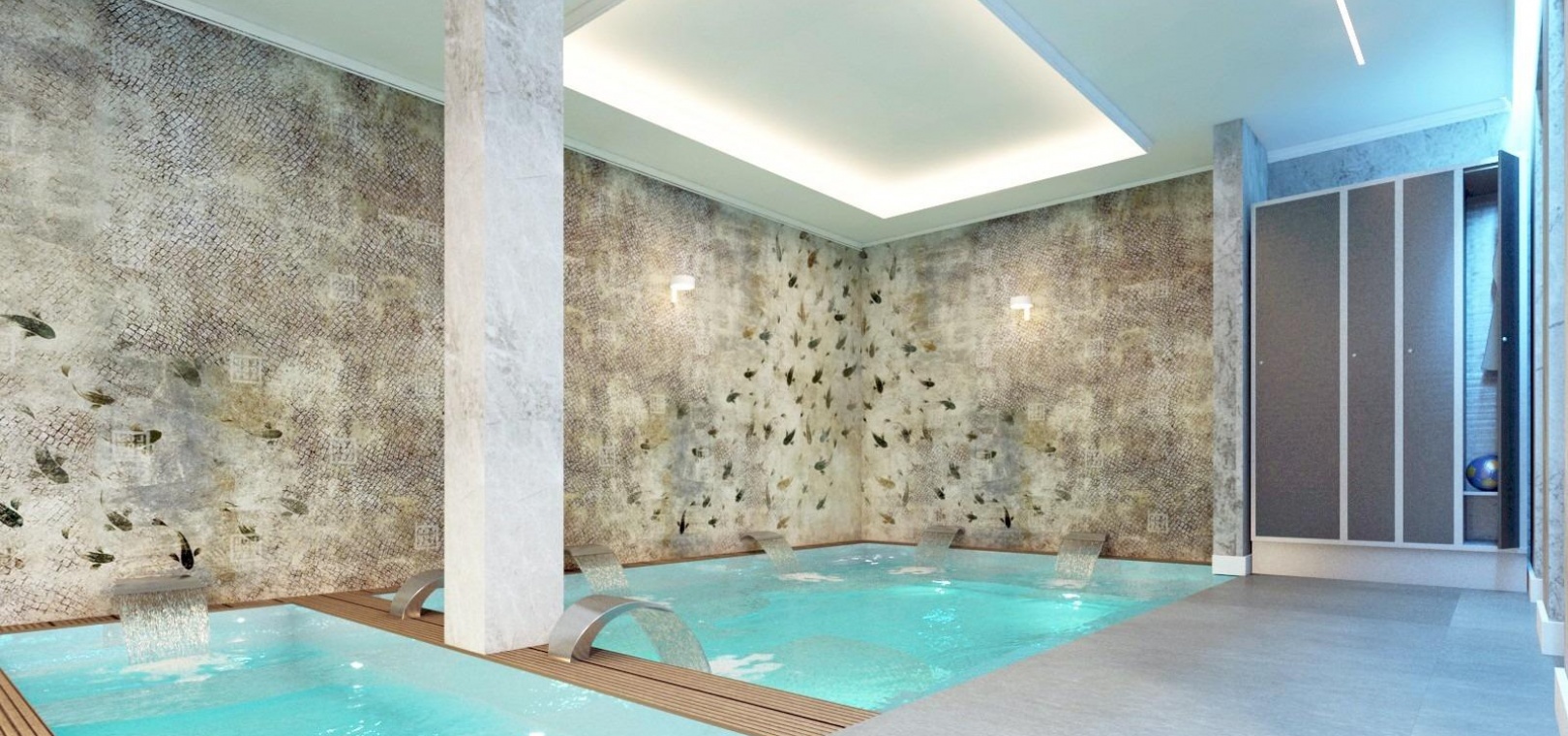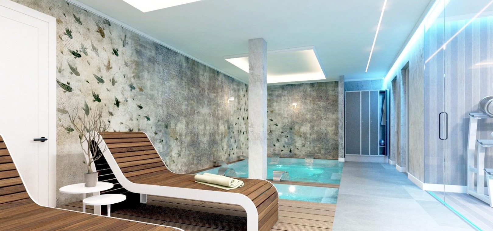 The basement level is dedicated to wellness and functionality, including a private spa area with jacuzzi, sauna and Turkish bath, gym, laundry room, pool bathroom, utility room and a storage room with an additional bath that can serve as a guest bedroom, .