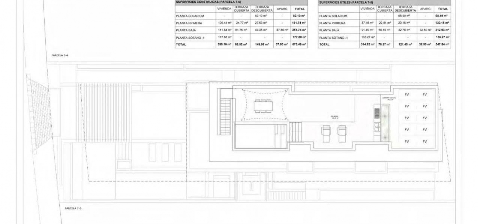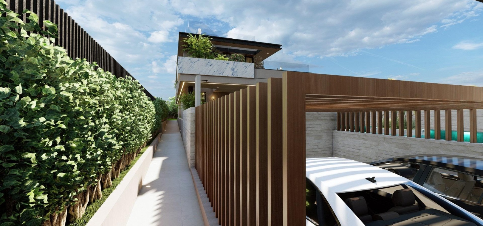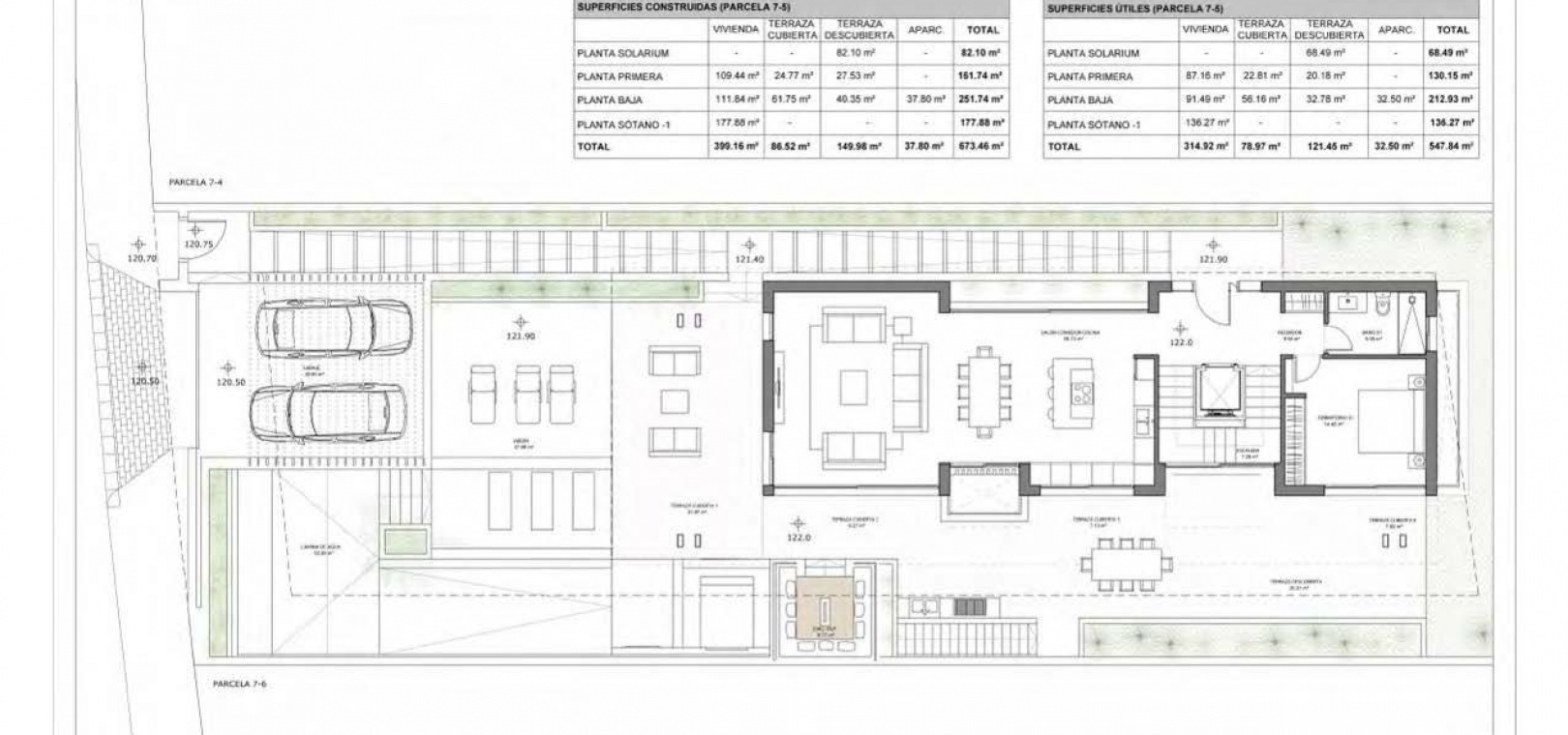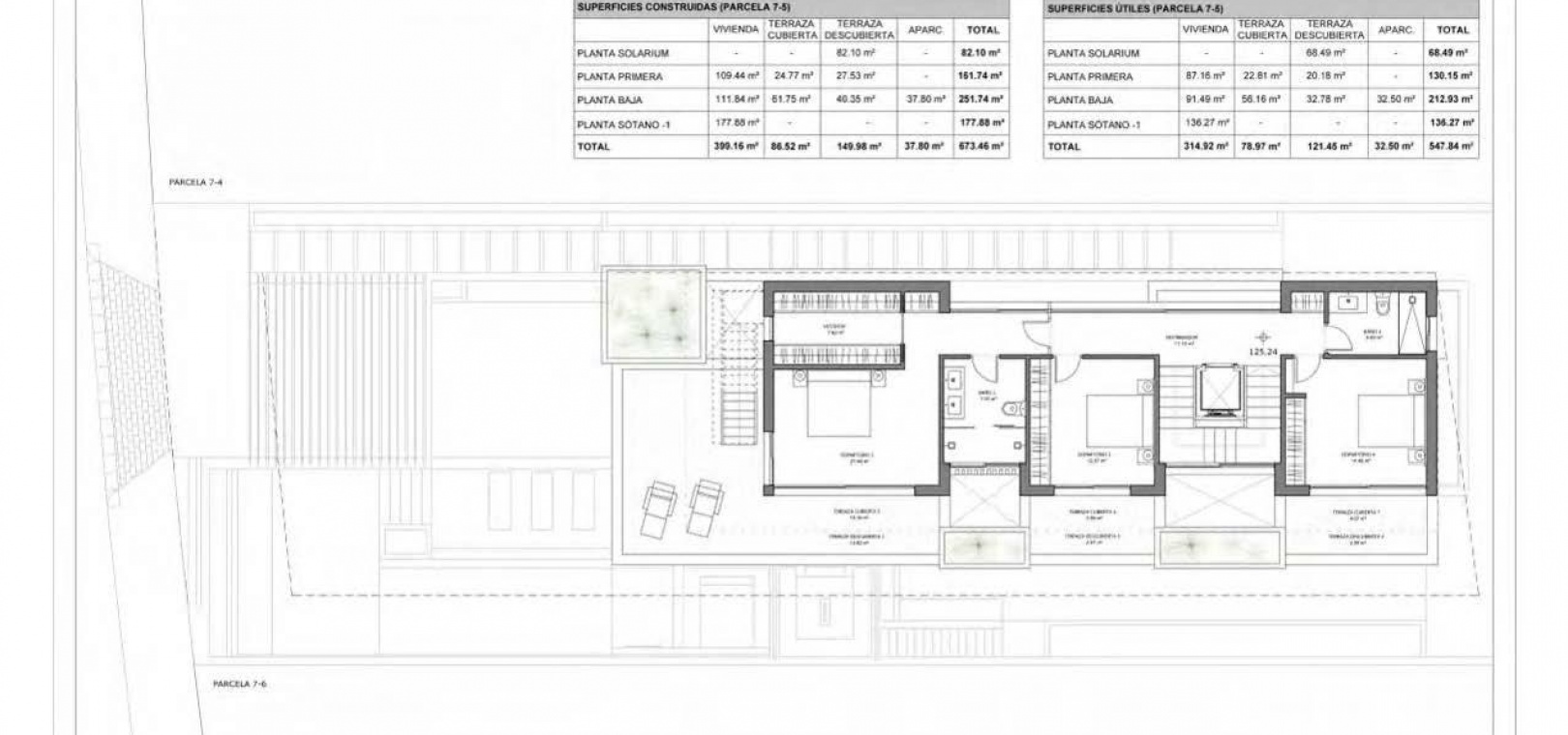 This exceptional villa features 5 spacious bedrooms and 5 bathrooms distributed over three levels plus a rooftop solarium, offering generous indoor and outdoor living areas.