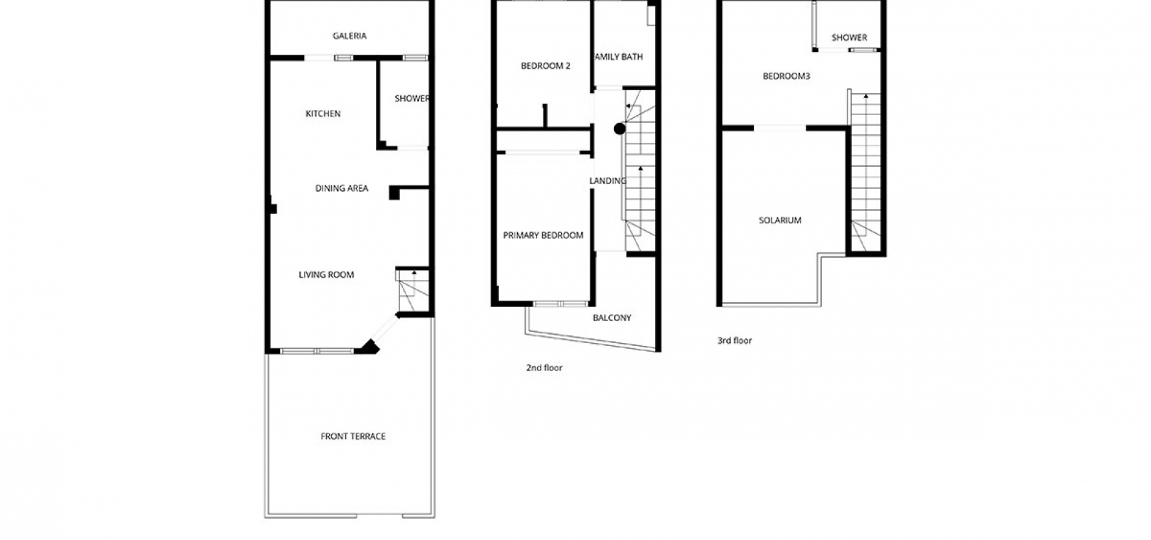 On the upper level, a third bedroom with en-suite shower room offers additional privacy. French doors open onto another sunny south-facing terrace, perfect for relaxing while enjoying the coastal views.