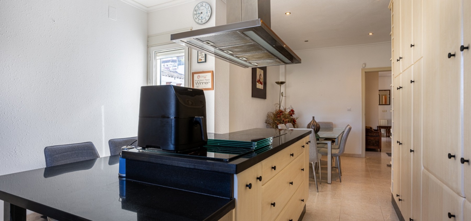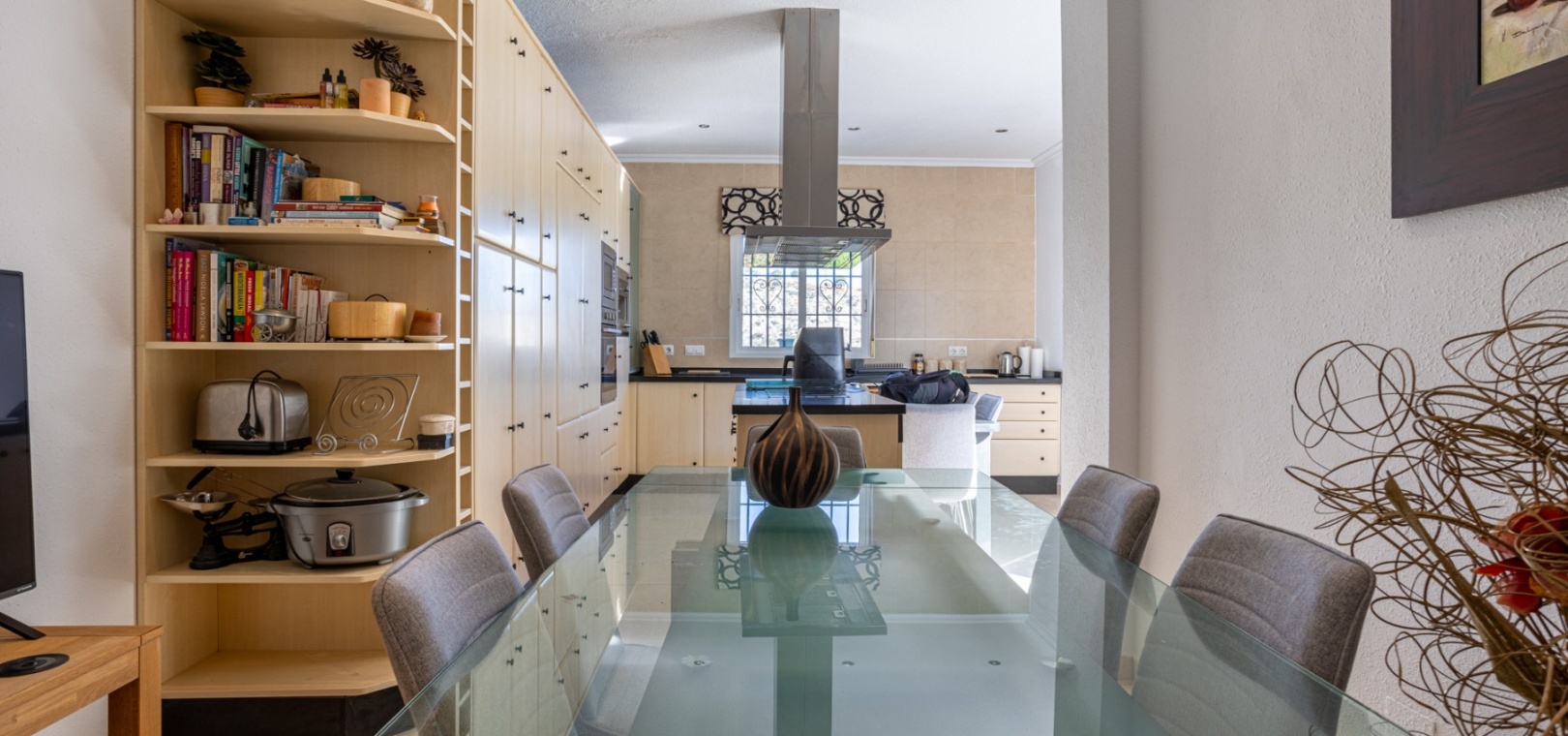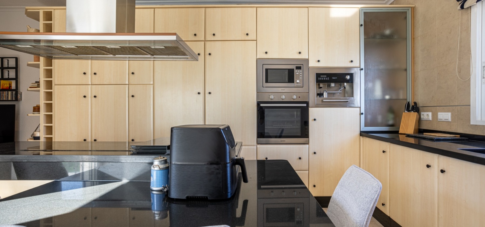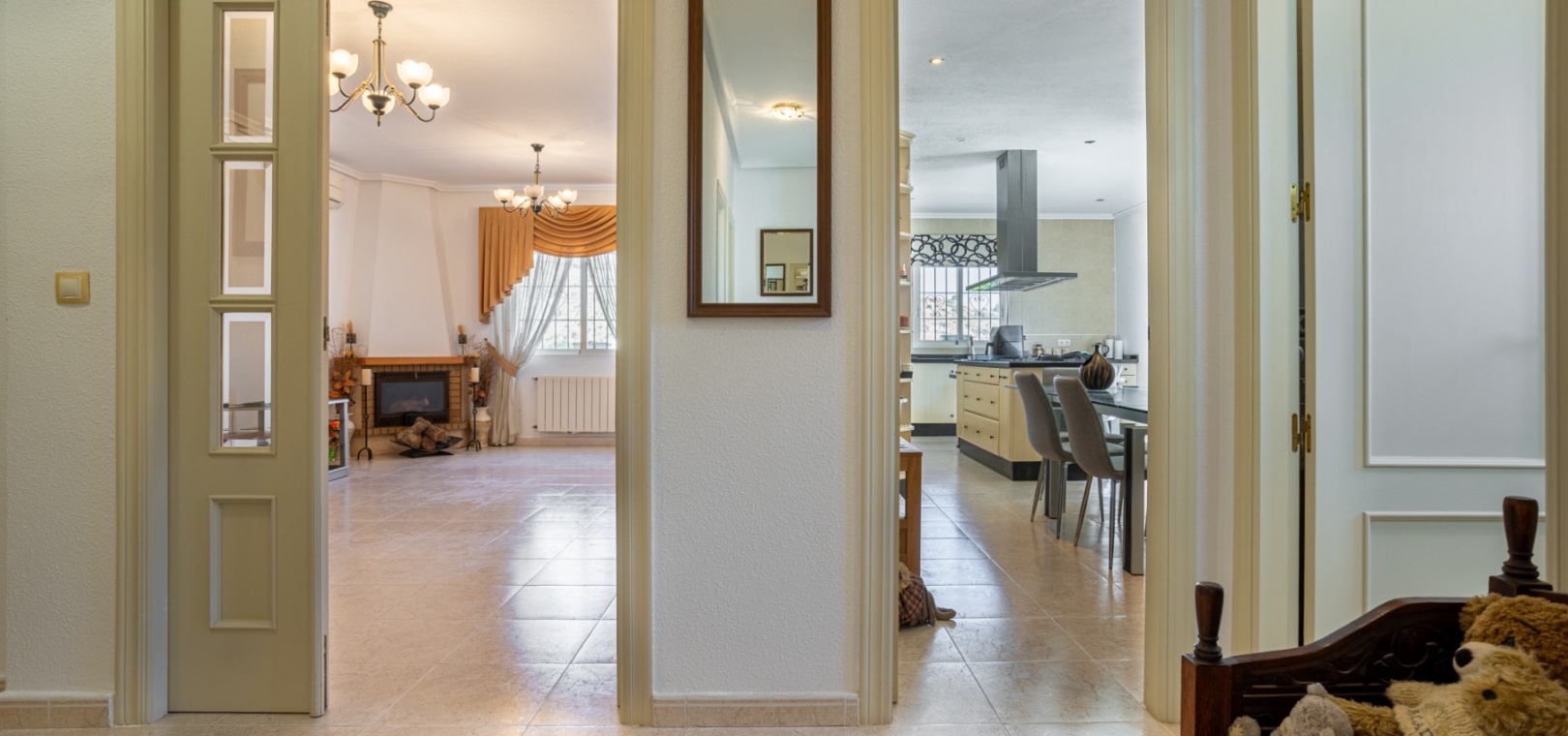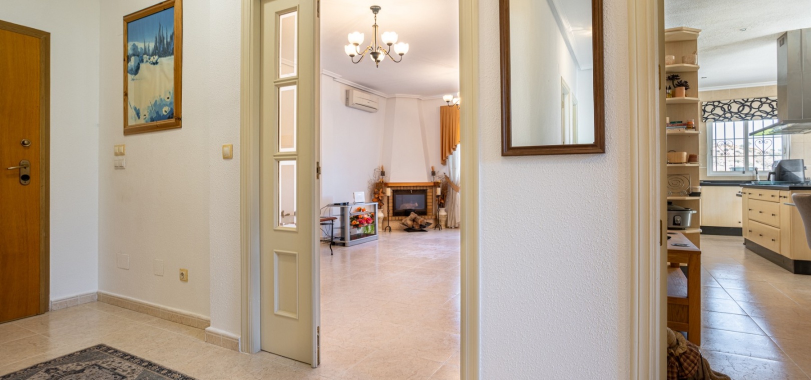 Inside, the villa offers a warm and welcoming atmosphere. The bright lounge serves as the heart of the home, complete with a cozy fireplace for cooler evenings, air conditioning for the summer months, and central heating to ensure year-round comfort.