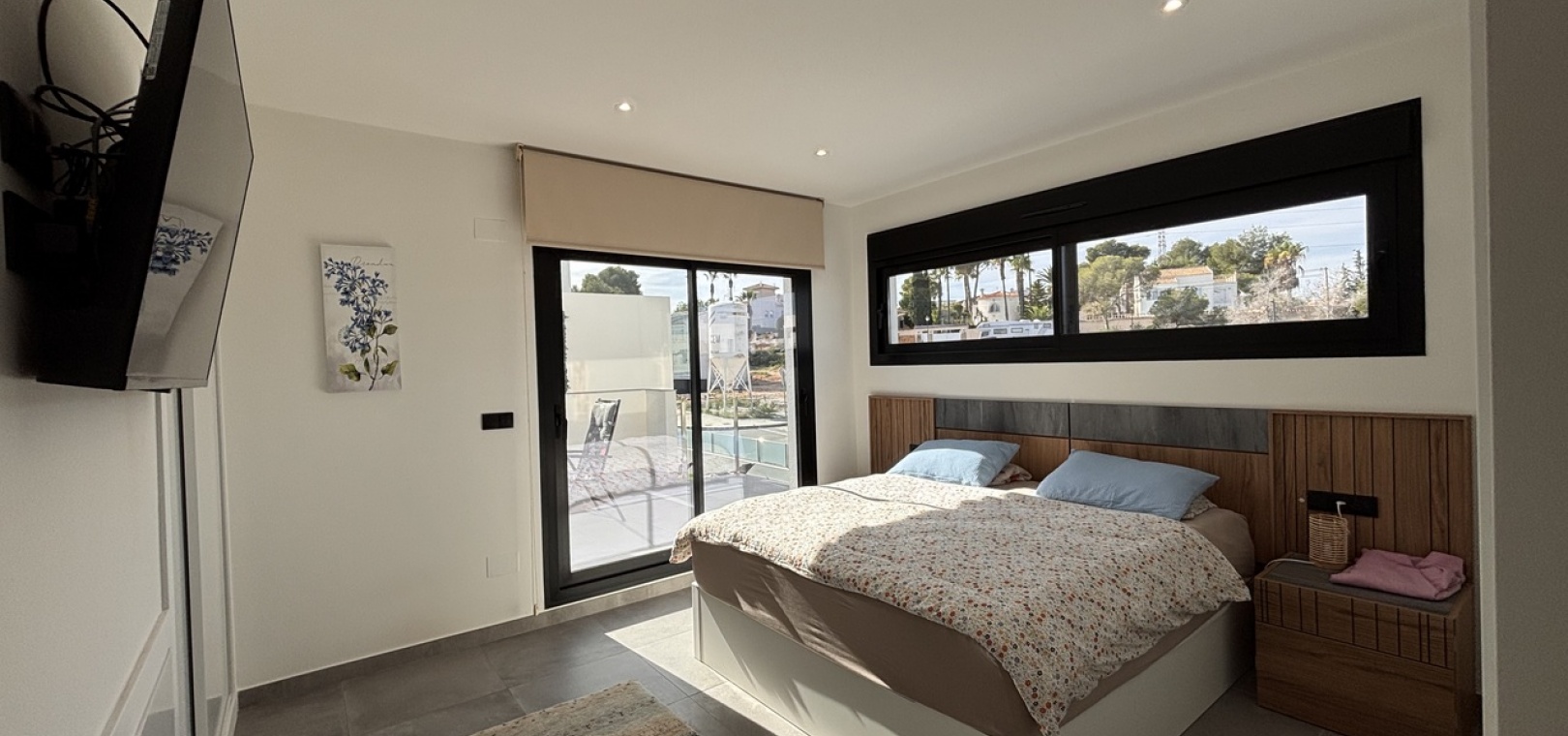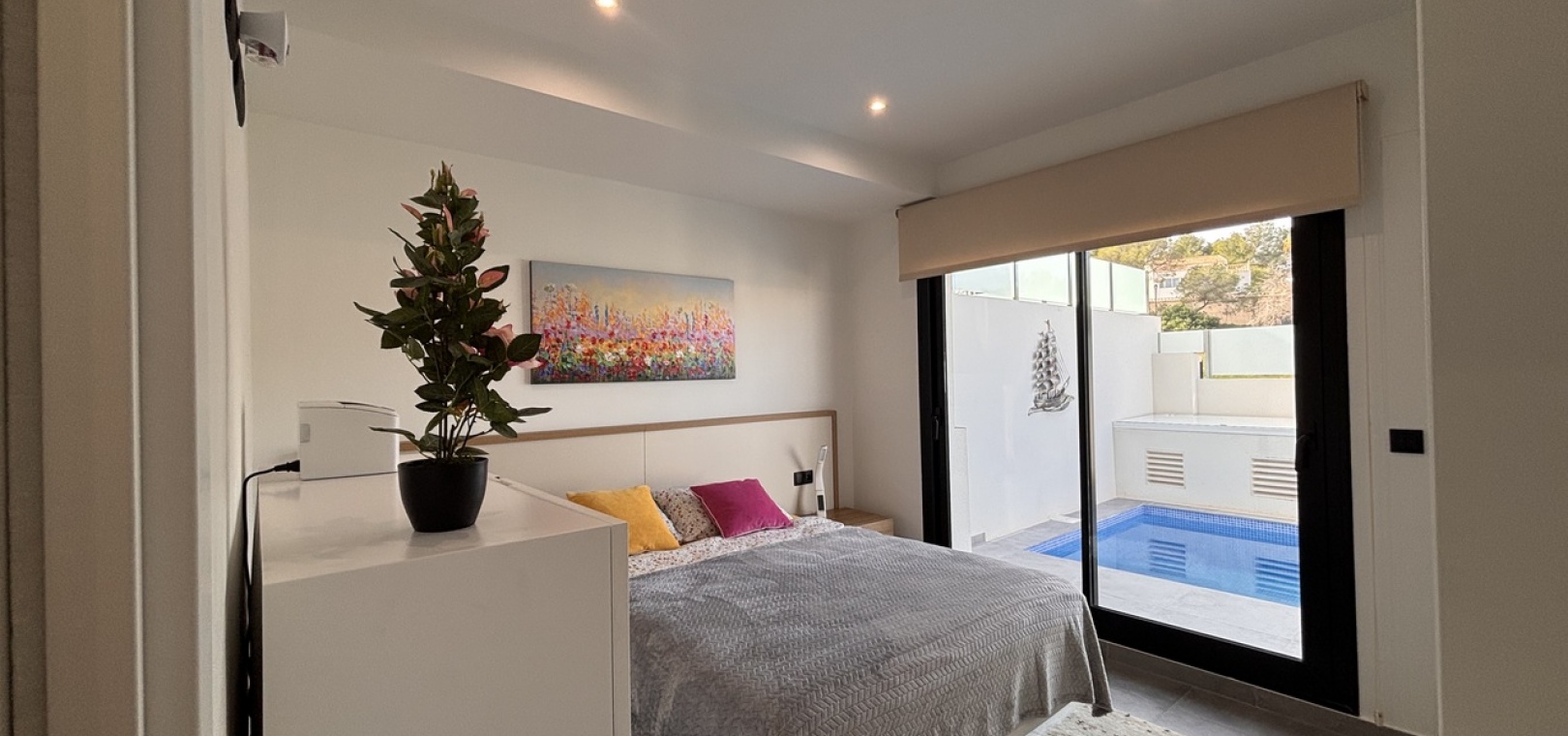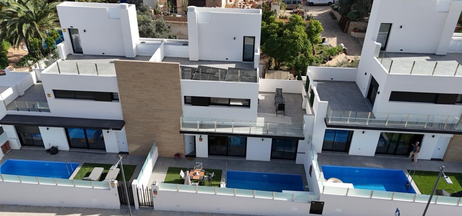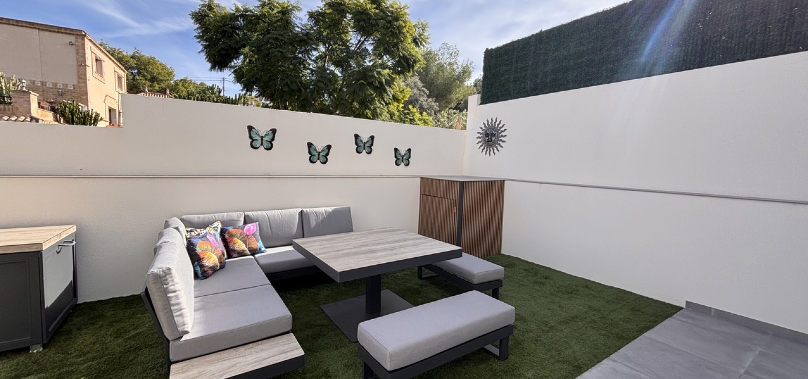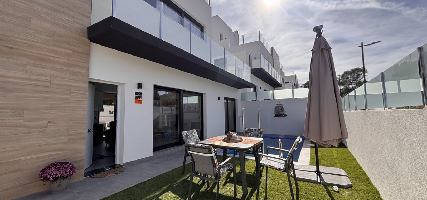 The property is fully furnished and features a private pool, private parking, front and rear gardens, and a bright open-plan kitchen. Additional highlights include air conditioning, a solar system, electric shutters, three spacious terraces, and a stunning solarium—ideal for relaxing or entertaining under the Spanish sun.