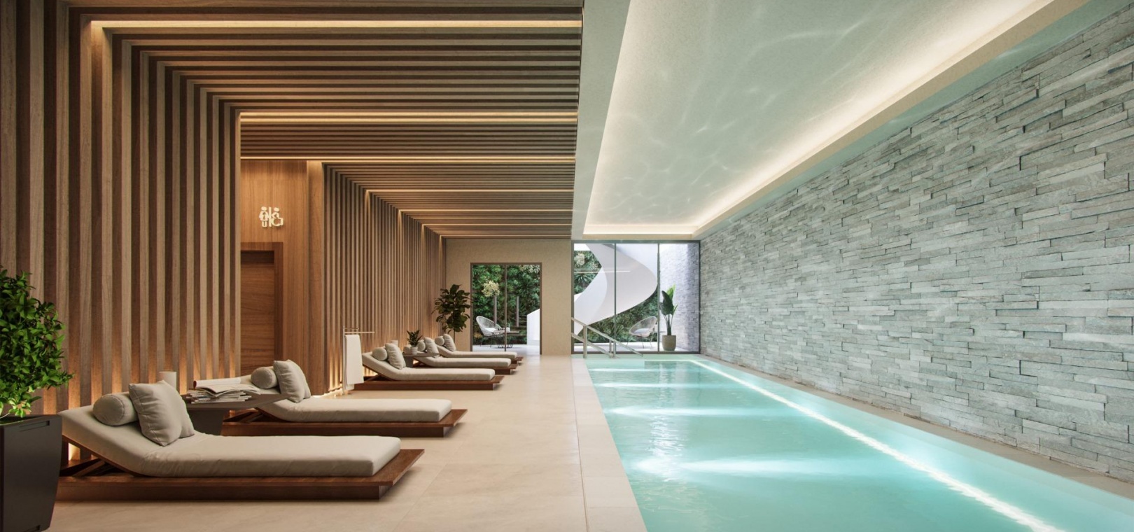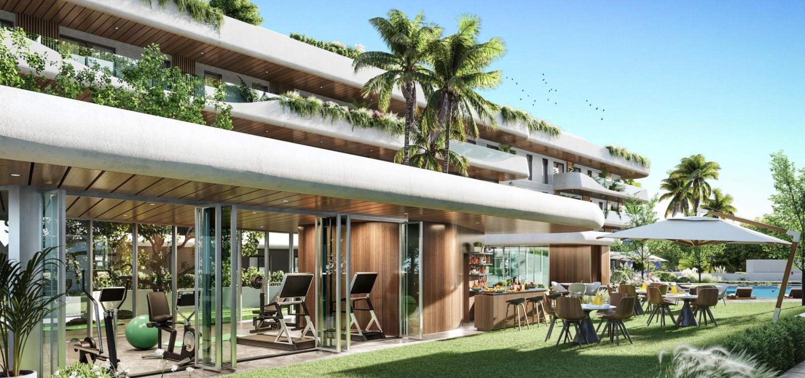 The communal spaces are a joy for the soul: lush gardens, coworking space, electric vehicle charging points, indoor heated pool, outdoor saltwater pool, and fully equipped gym and spa. Fully gated complex with security entrance and checkpoint.