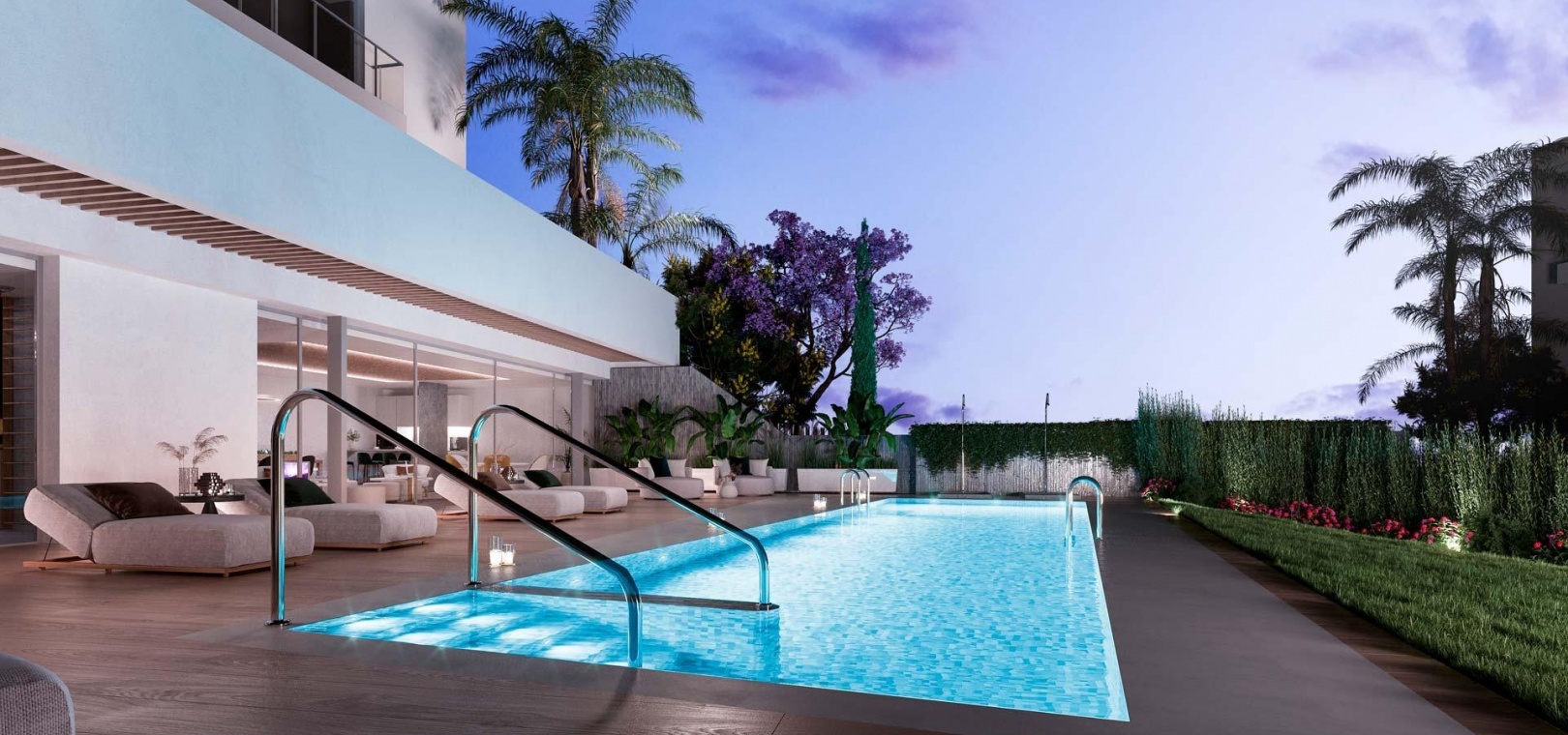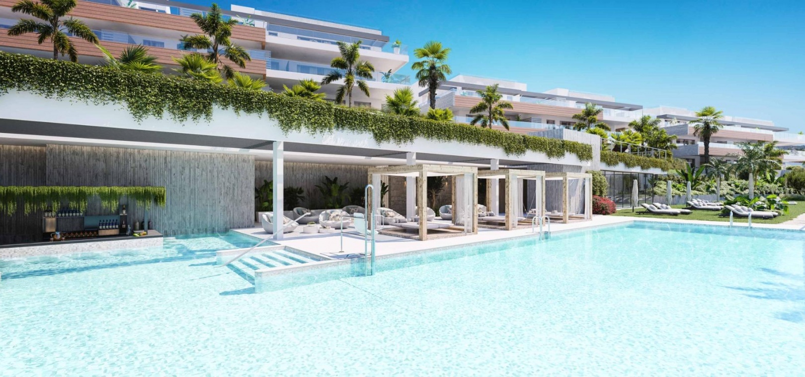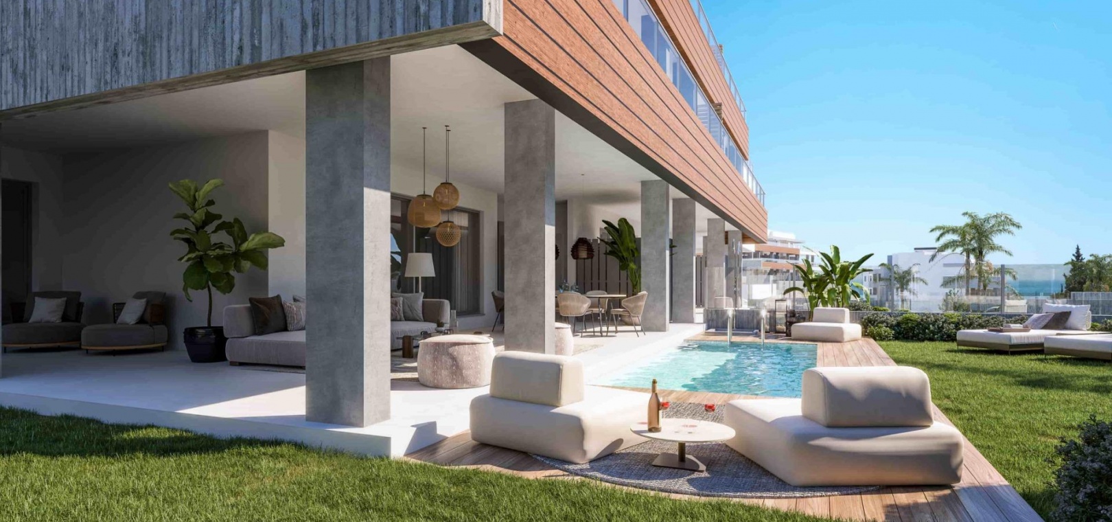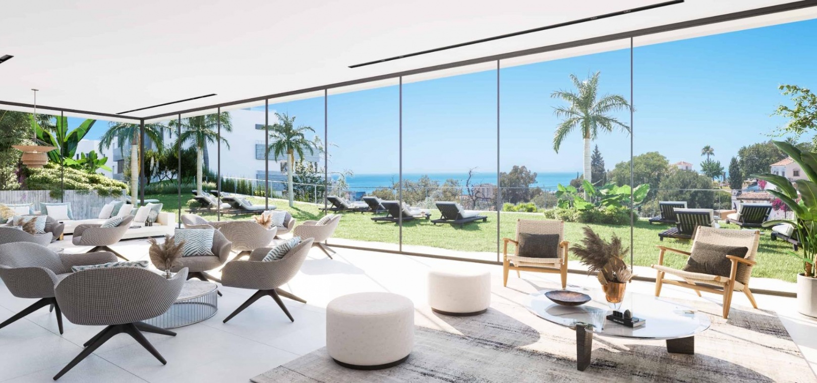 Innovative and elegant residential of 2 and 3-bedroom homes with large windows and extensive terraces to enjoy stunning sea views. Ground floor apartments with garden and private swimming pool, and penthouses with solarium with the option of incorporating a swimming pool.