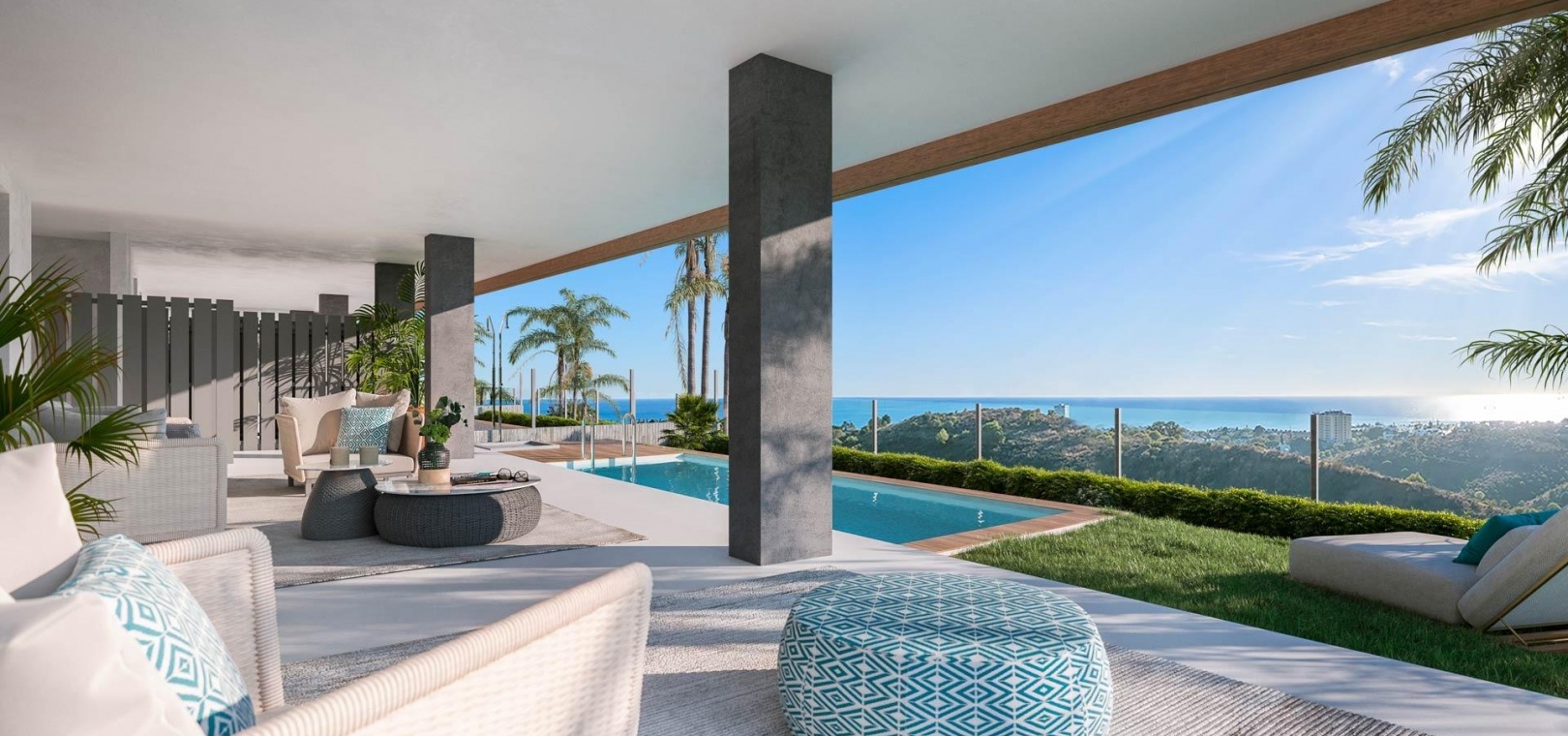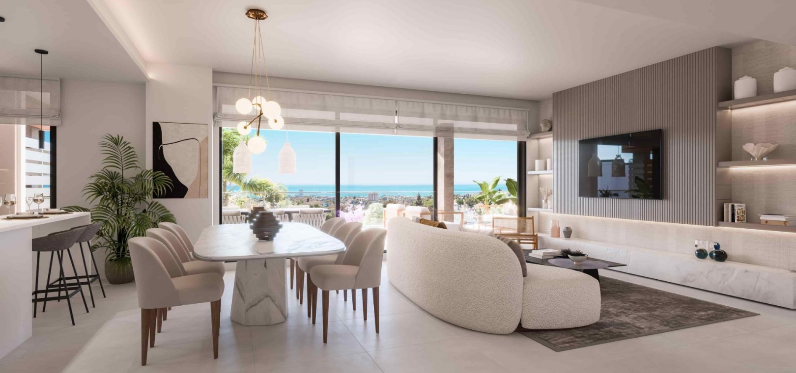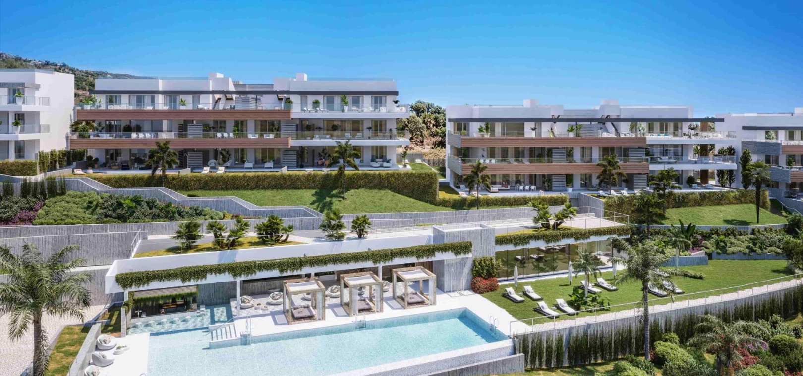 Innovative and elegant residential of 2 and 3-bedroom homes with large windows and extensive terraces to enjoy stunning sea views. Ground floor apartments with garden and private swimming pool, and penthouses with solarium with the option of incorporating a swimming pool.
