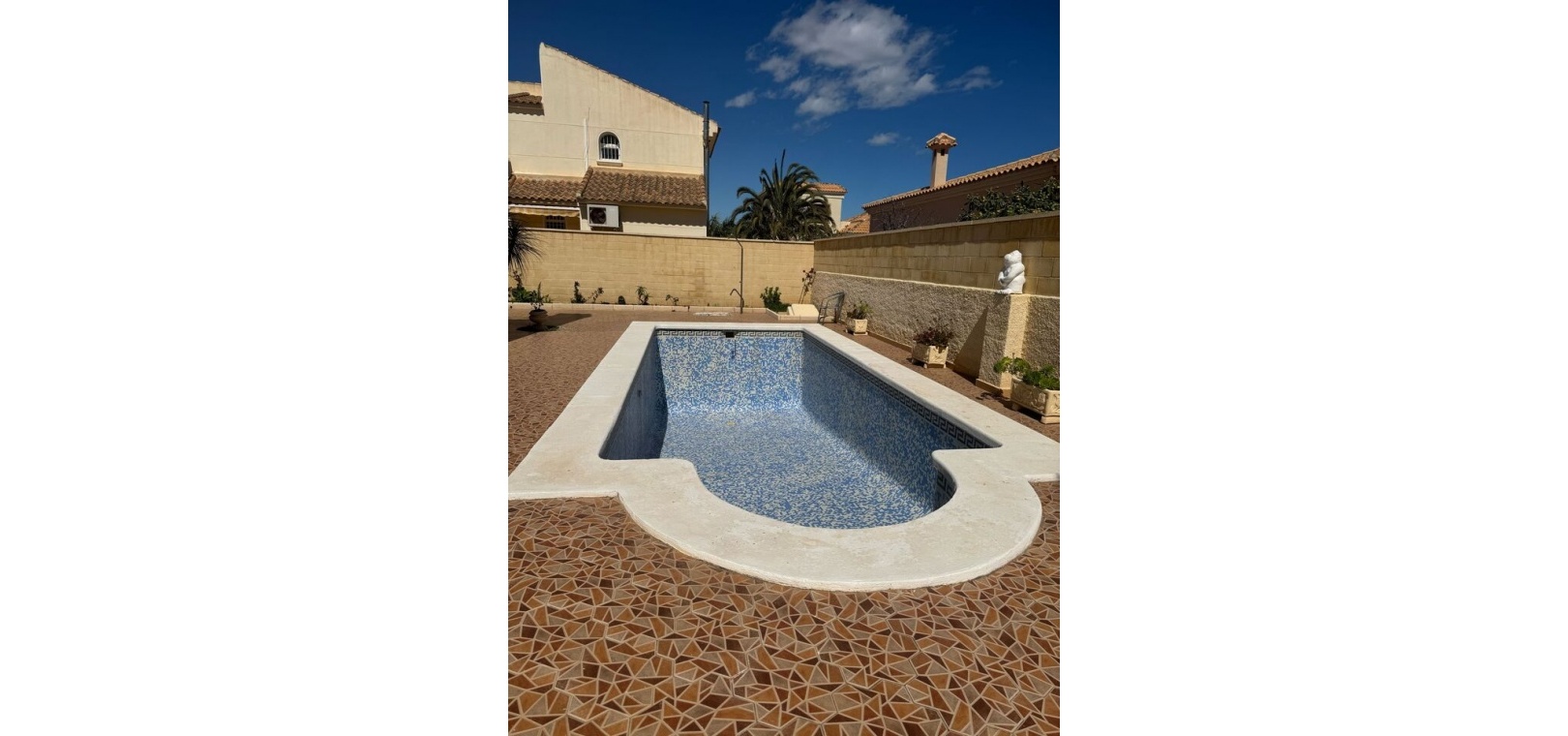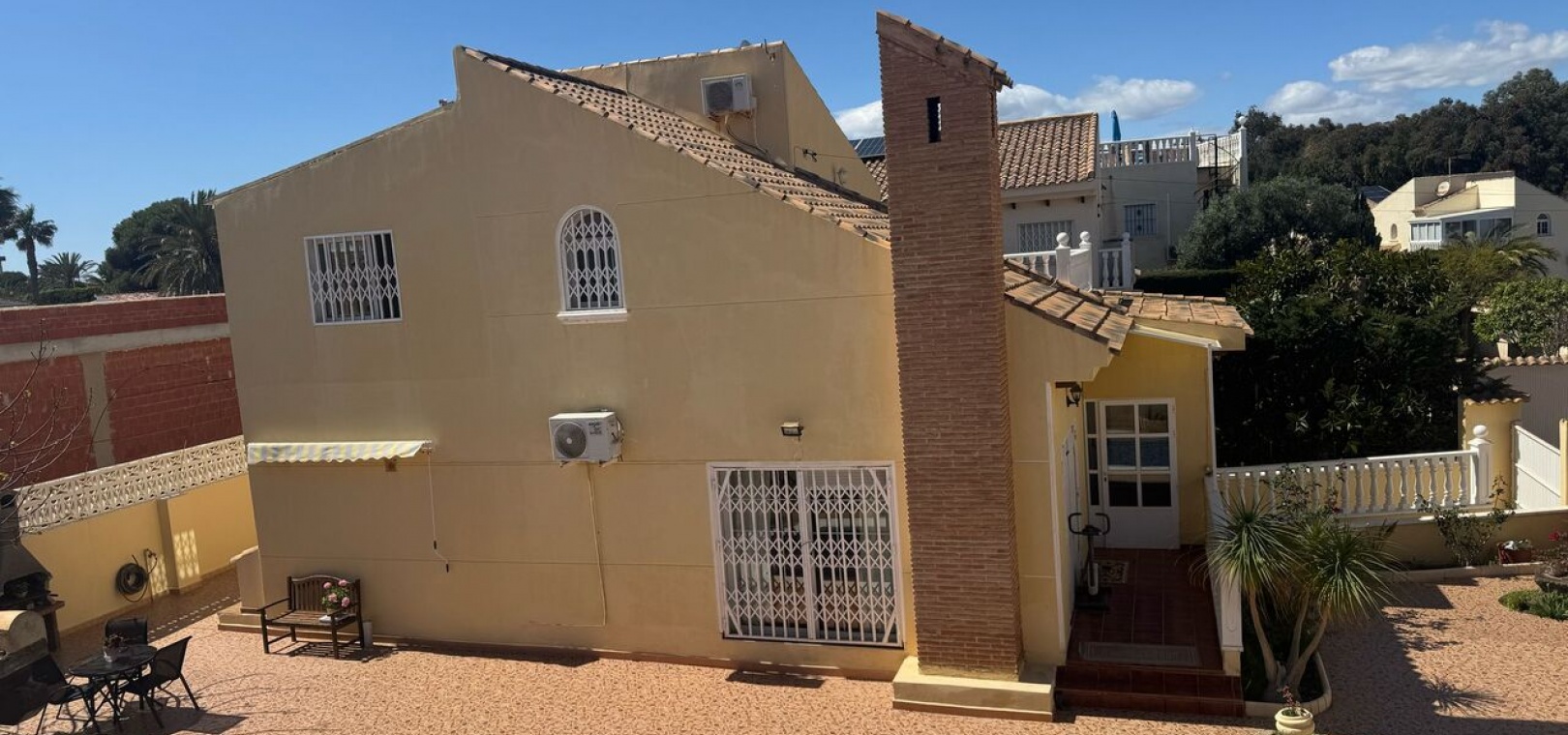 Large detached villa, Beachside of N332 in Playa Flamenca.The Villa, situated on a large plot of 467 m², offers a living area of 172 m² distributed over two floors, complemented by an underground garage with capacity for 3 cars.The property offers 4 bedrooms, two of them with en-suite bathrooms, while the other two are located on the first floor accompanied by a third bathroom, providing comfort and accessibility. The distribution includes a spacious and bright living-dining room, a large independent fitted kitchen with closed gallery, and 2 glazed terraces ideal to enjoy all year round.Outside, a private swimming pool, a barbecue area perfect for outdoor gatherings and a well-kept garden complete this exclusive environment.The house is sold furnished and there is air conditioning.Here you live only 250 m from the beach and within walking distance there are restaurants, bars and grocery stores. Nearby is the popular Zenia Boulevard shopping center with over 150 shops. For those interested in golf, there are several high-quality courses within a short drive.