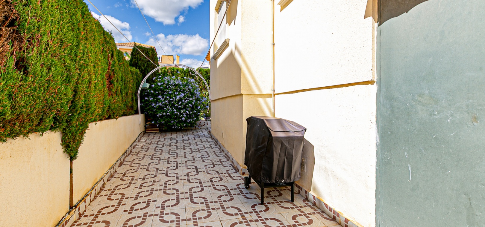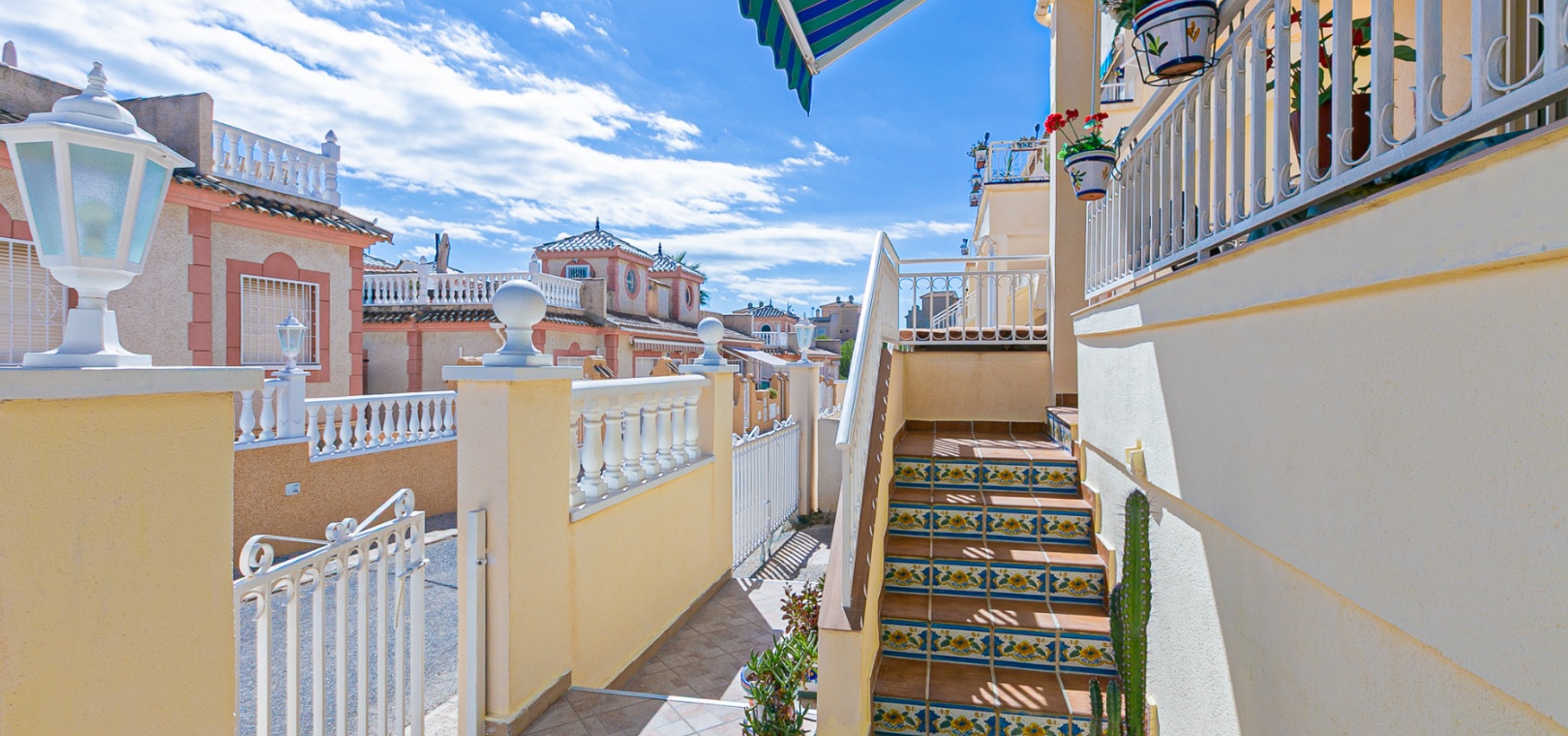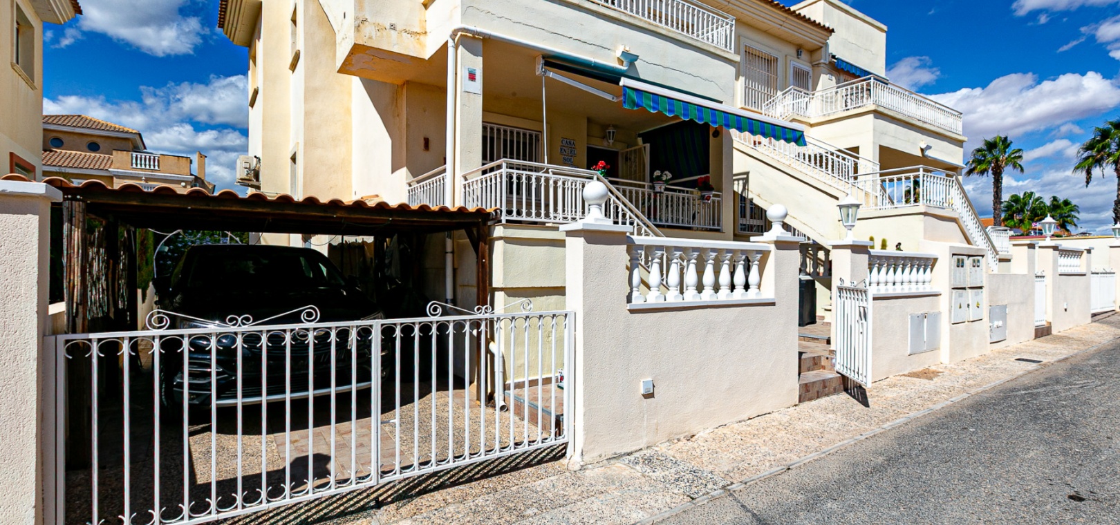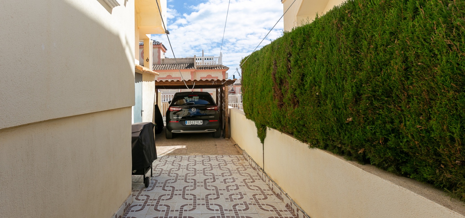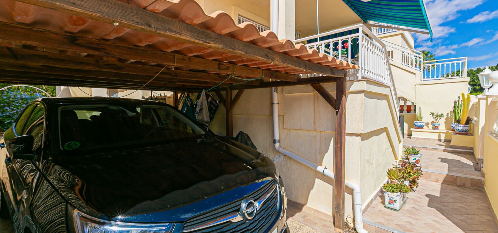 At the front, a double terrace offers two spaces: one by the entrance and a larger main terrace with a retractable awning — ideal for dining or relaxing in the shade. The plot also features a convenient private carport for off-street parking.