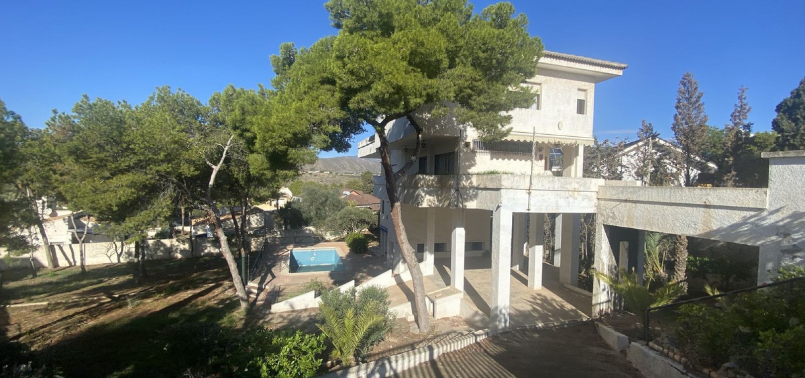 The villa is distributed over multiple levels and offers bright, spacious rooms throughout. In total, the property features 5 generous bedrooms, all with views of the surrounding landscape, providing an excellent foundation for a comfortable family home or holiday residence once updated.