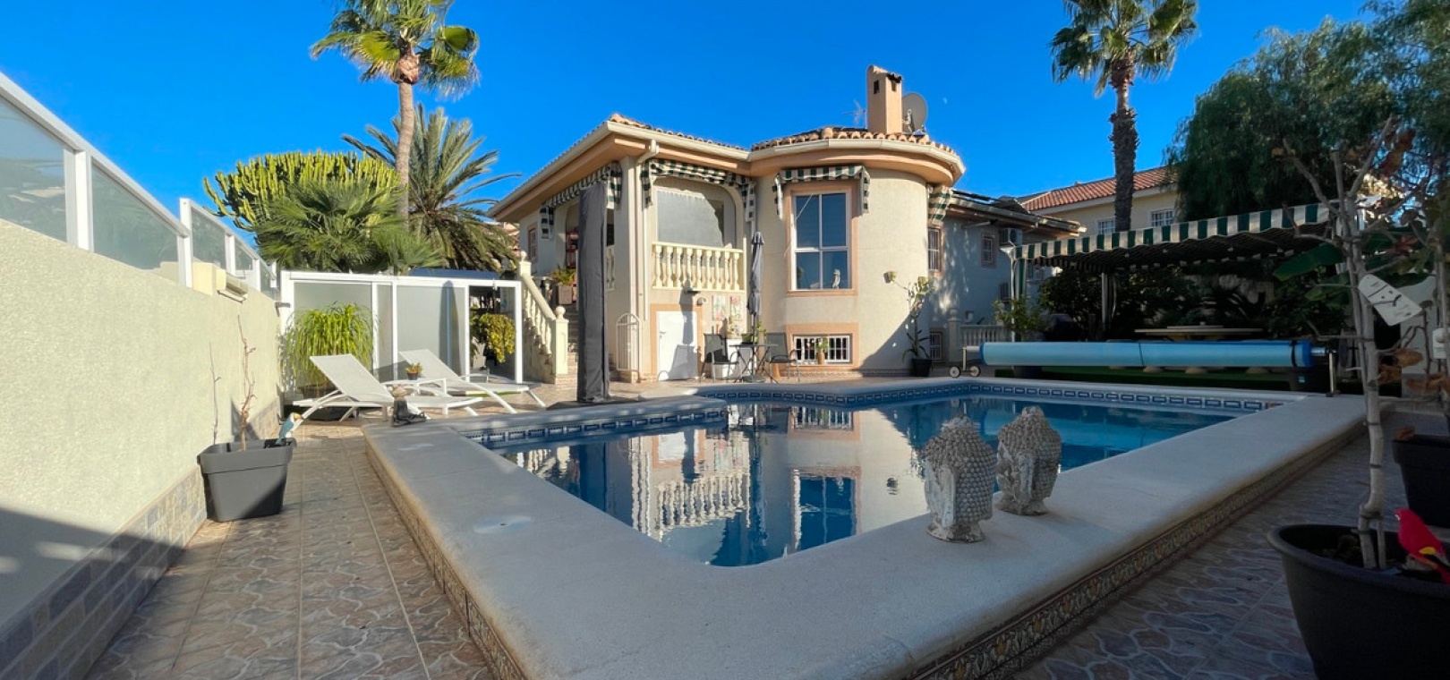 The property features solar panels for energy efficiency, as well as a pool heating pump, perfect for enjoying the water all year round.